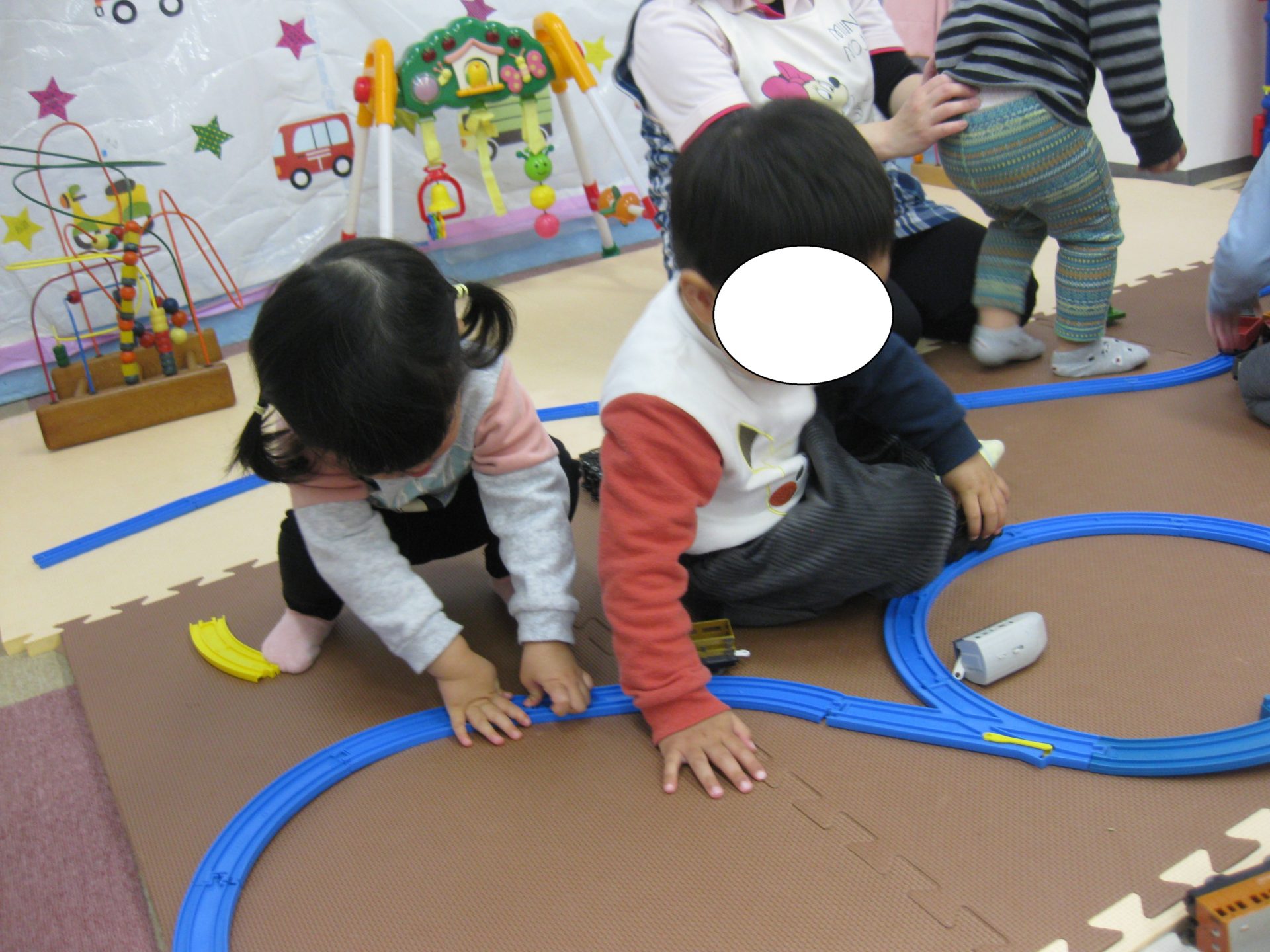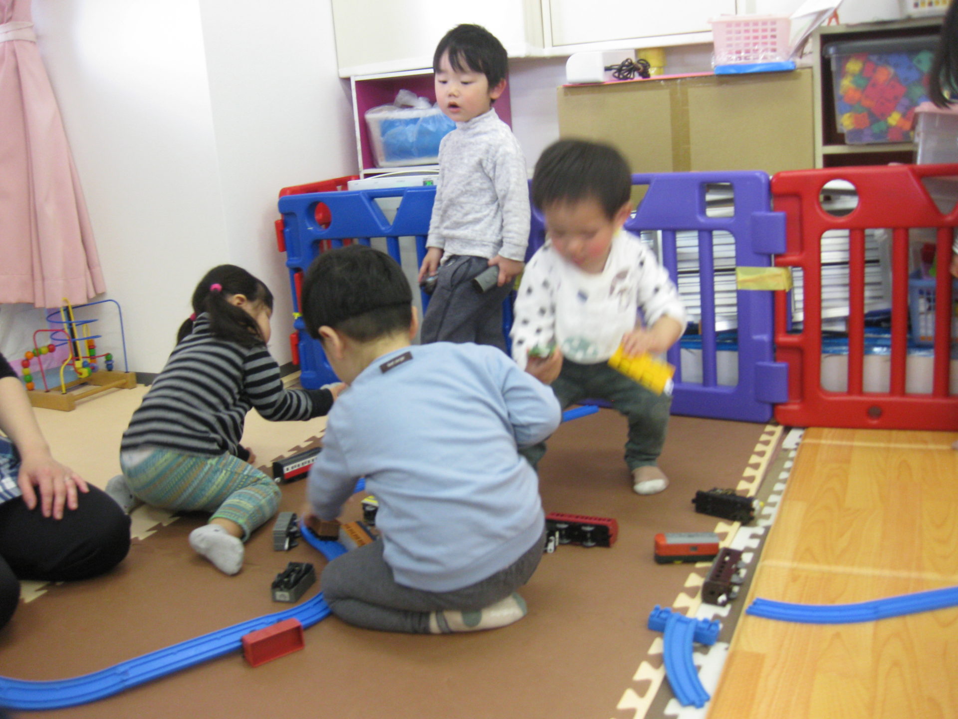 練習を待っている間、ひよこ組とうさぎ組のお友達は大好きなプラレールをして遊びましたよ!!