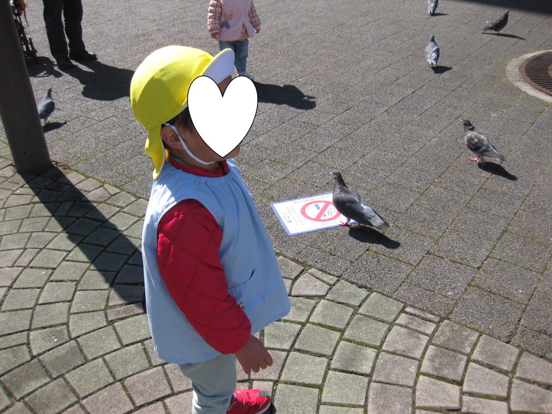 鳩さんもたくさんいたので、みんなで後ろをついて行ったり追いかけたり・・・たくさんの鳩さんが飛び立つのが怖いお友だちもいて、遠巻きに眺めるお友だちもいました😲