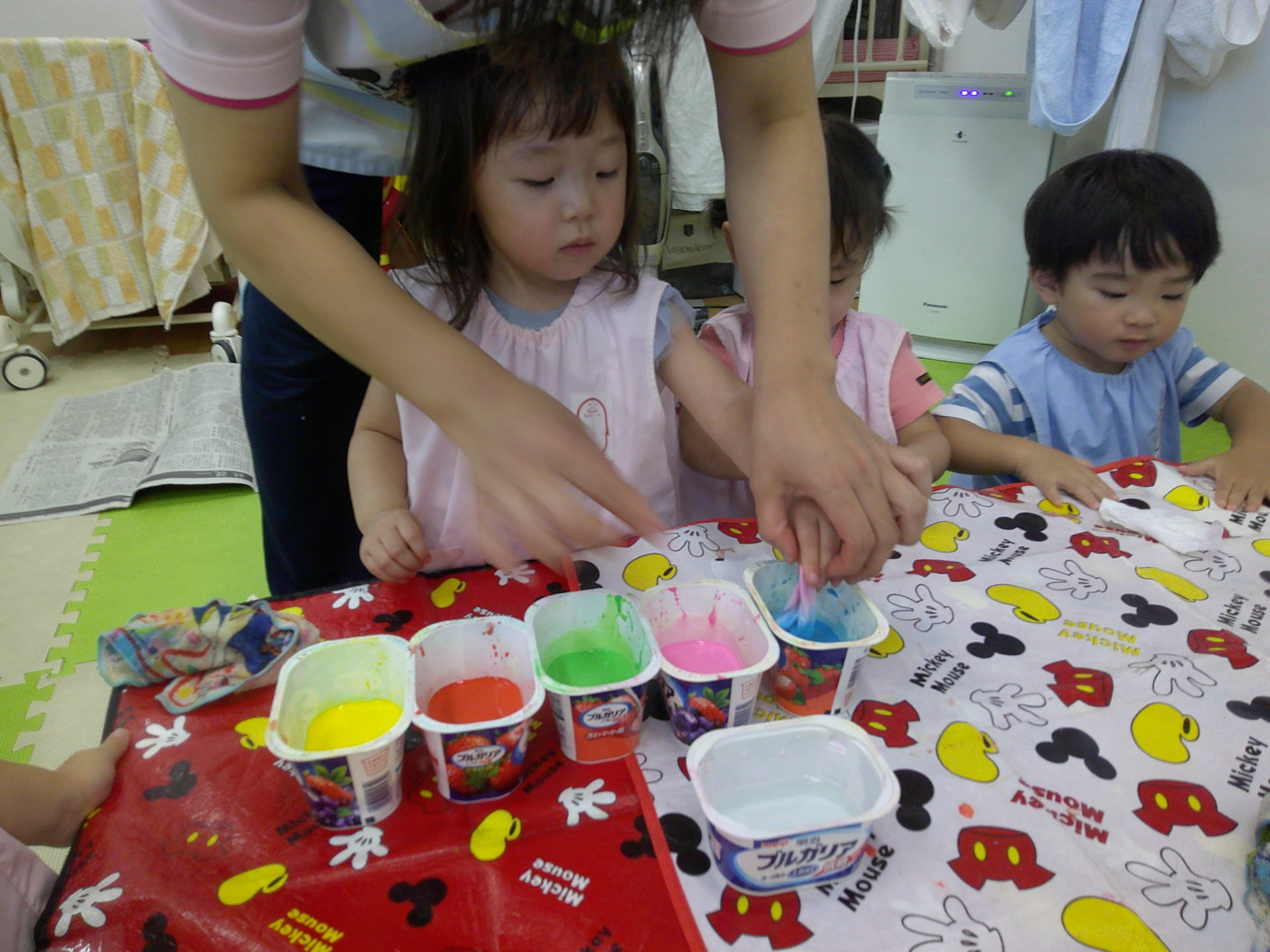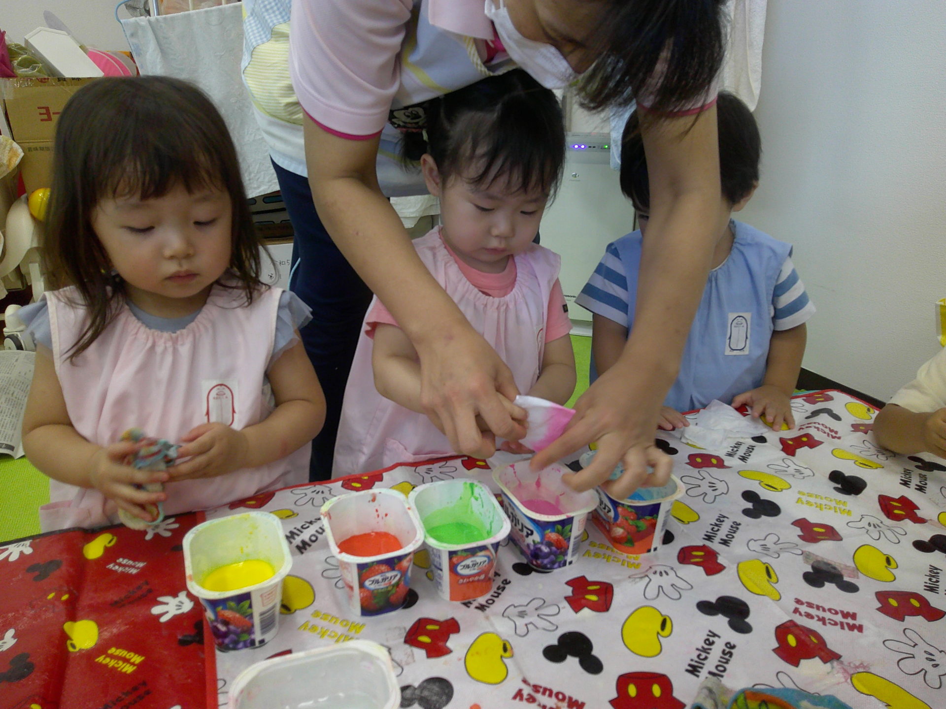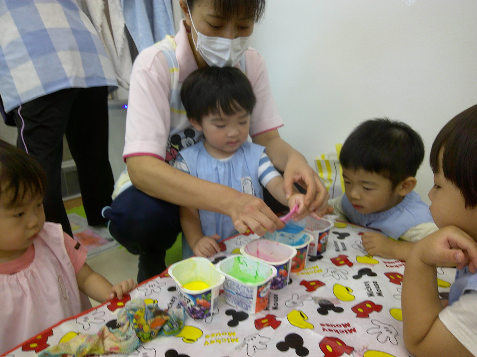 絵の具をしみこませてたり、クレヨンでお絵描きをしたり…