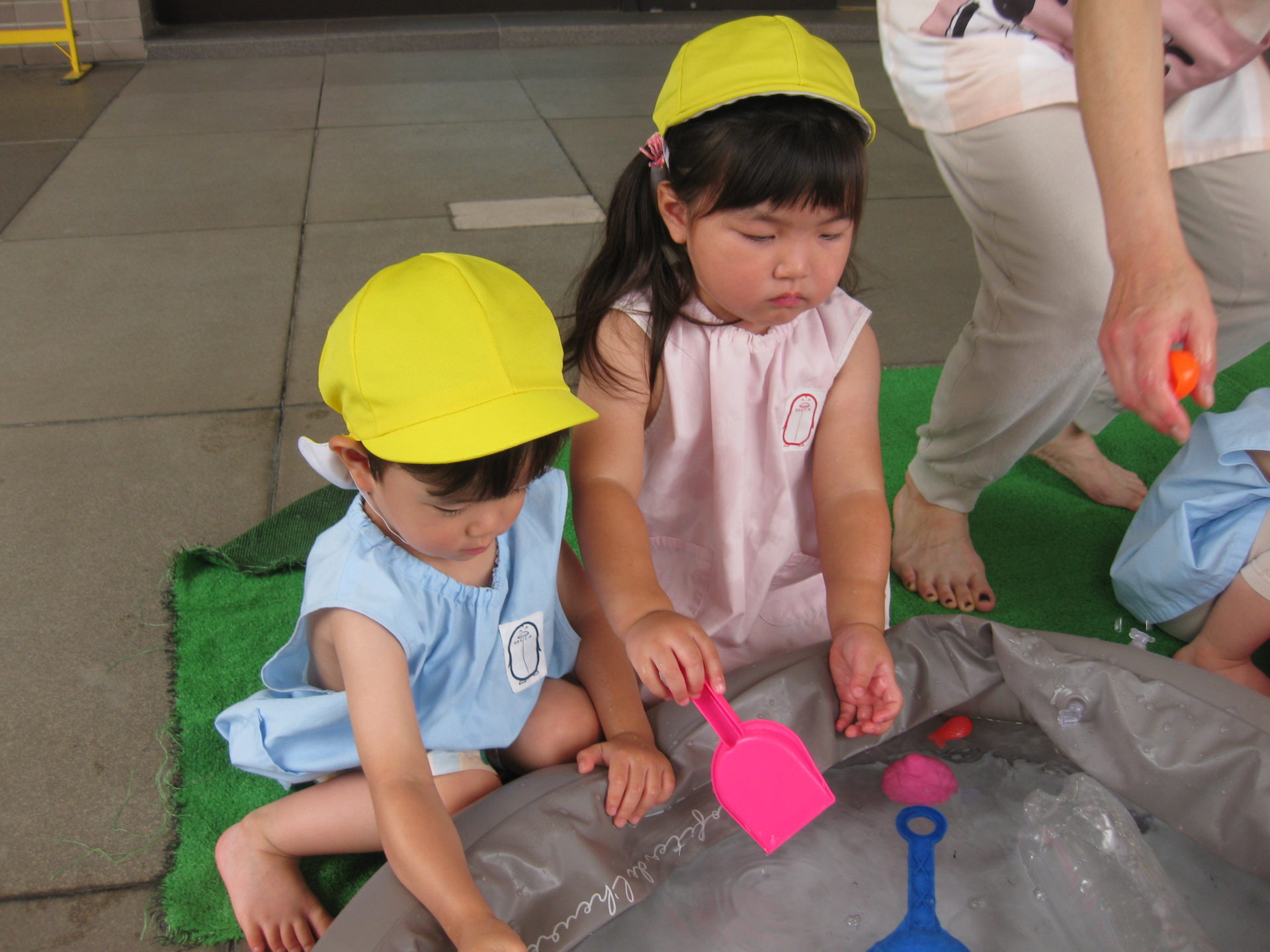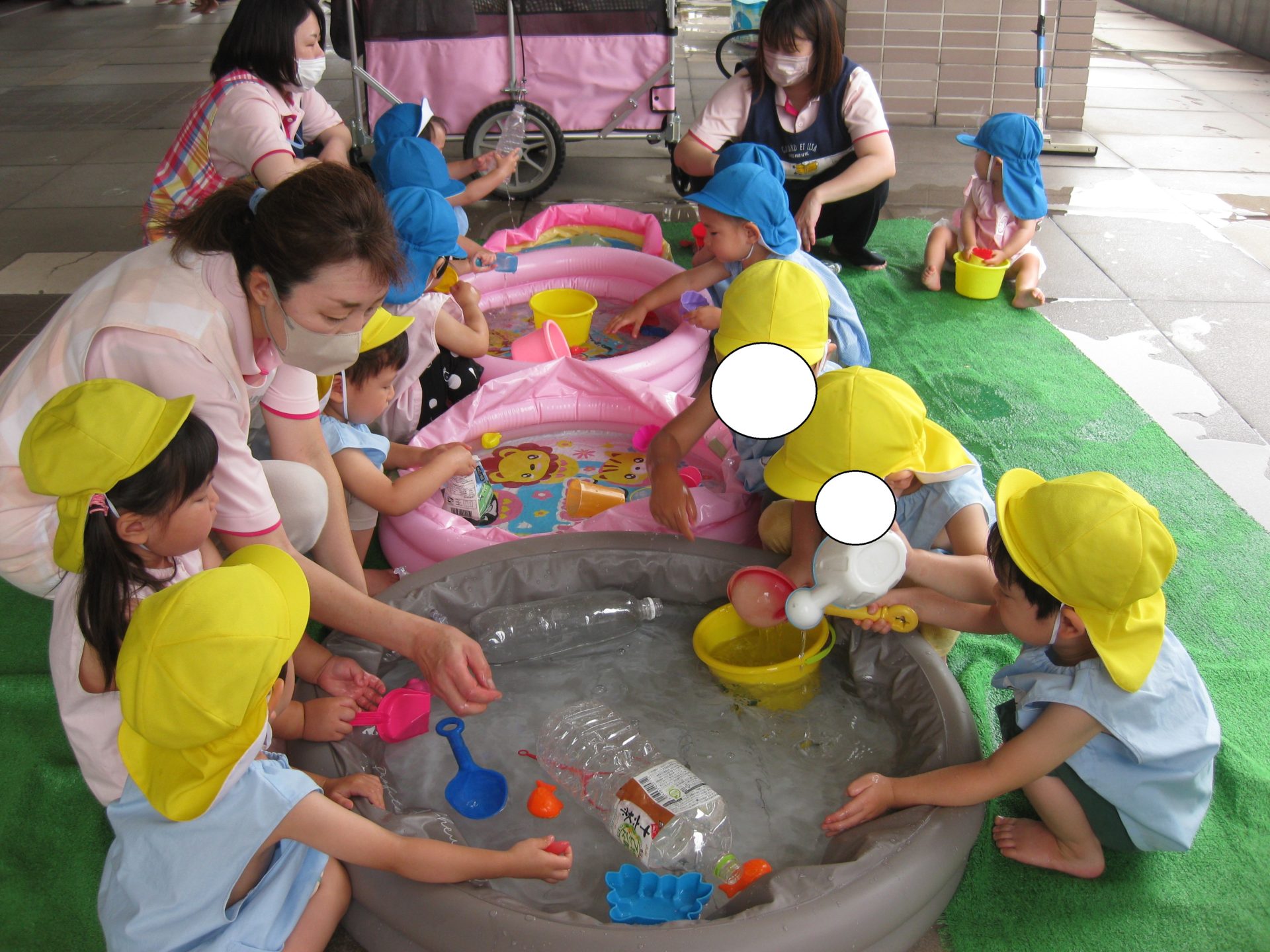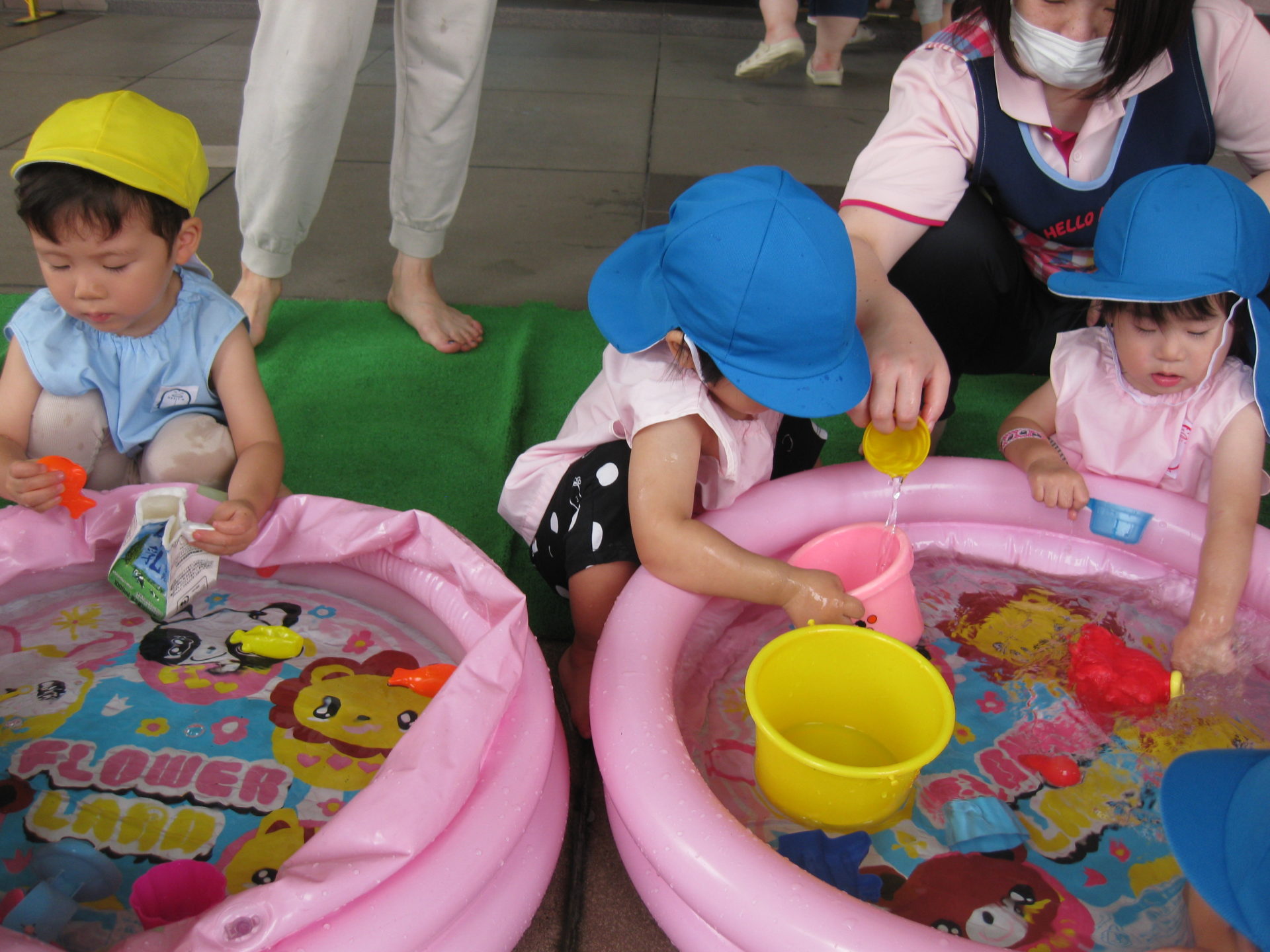 まずは、水遊びのお約束を聞きましたよ。「水の中に入らない」「別のプールへのお引越しはしない」のお話をすると、「わかった~!」と良いお返事が聞こえてきました!