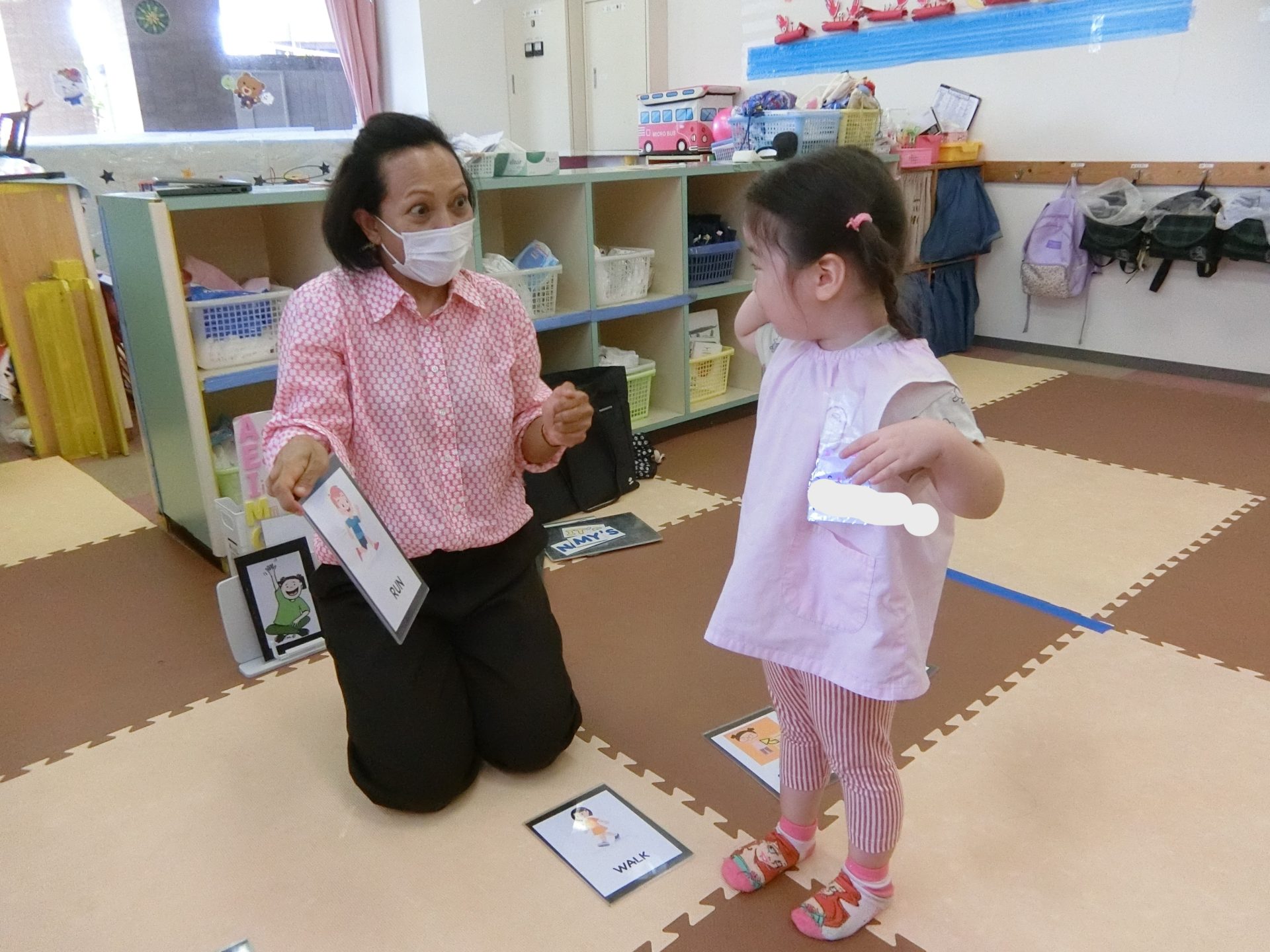 今日はお天気やお名前、曜日、ジャンプや立つ座るなどの動作を