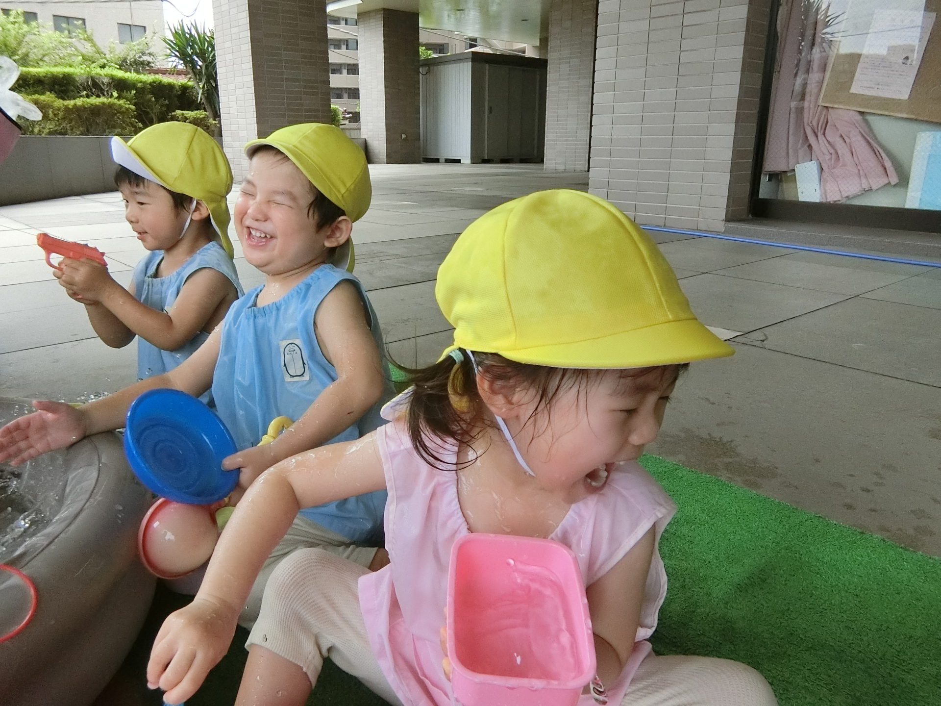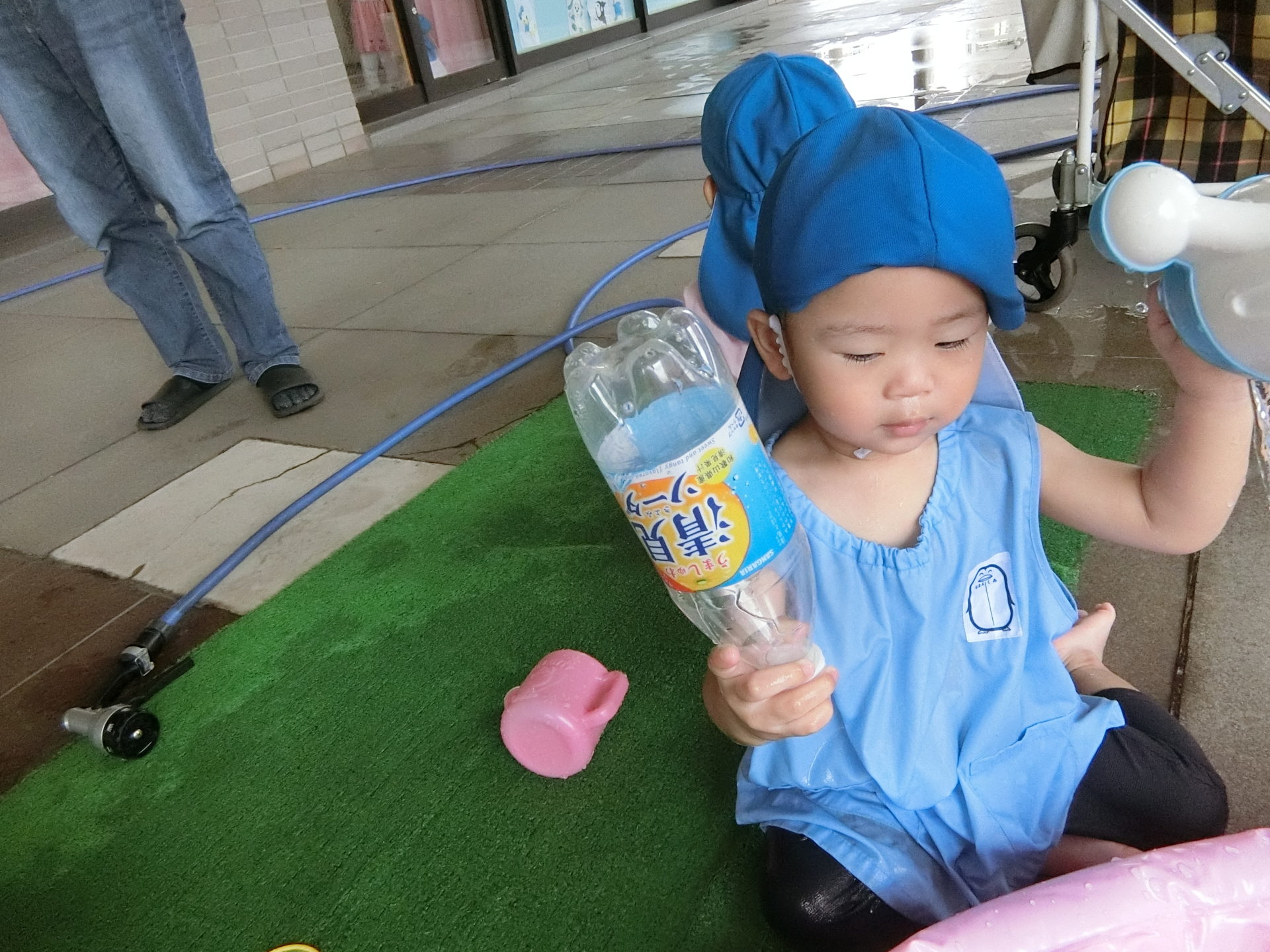 水遊びが大好きな子ども達は、先生と水の掛け合いをしたり、じょうろや手作りのシャワーのボトルに水を入れては、上から降らせて楽しんでいました。