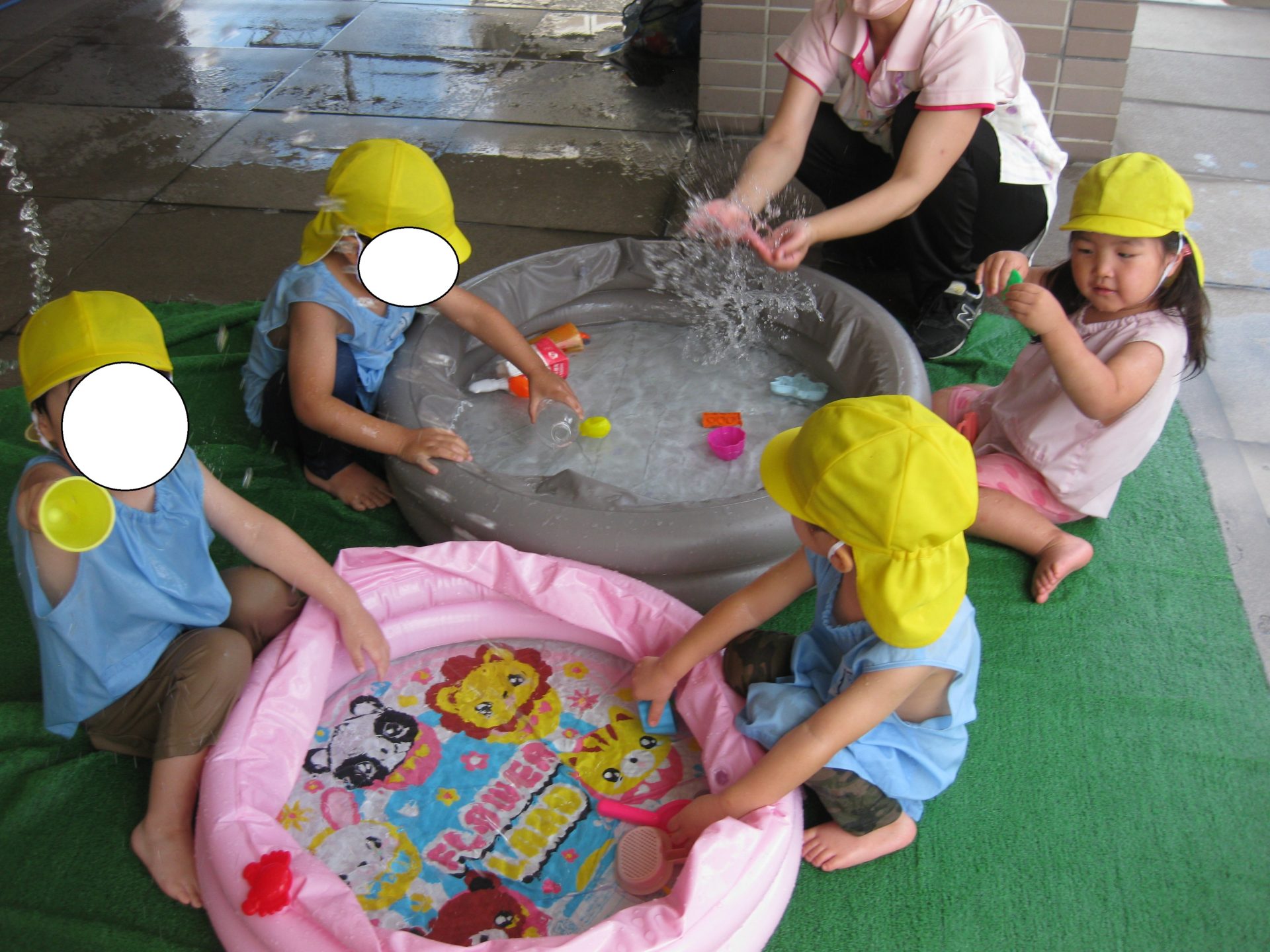 保育士と一緒に水の掛け合いをして、全身ずぶぬれになって遊びました☺