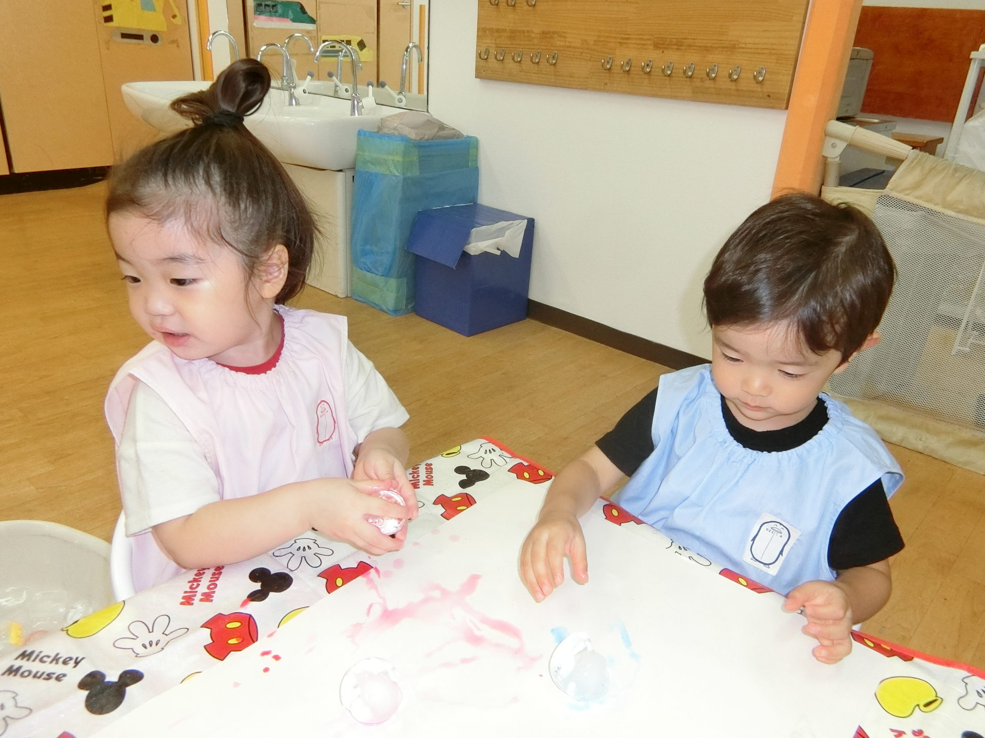 お外に出るのは危険なほどの暑さということで今日はお部屋の中でひんやり冷たい氷を使って遊びました。