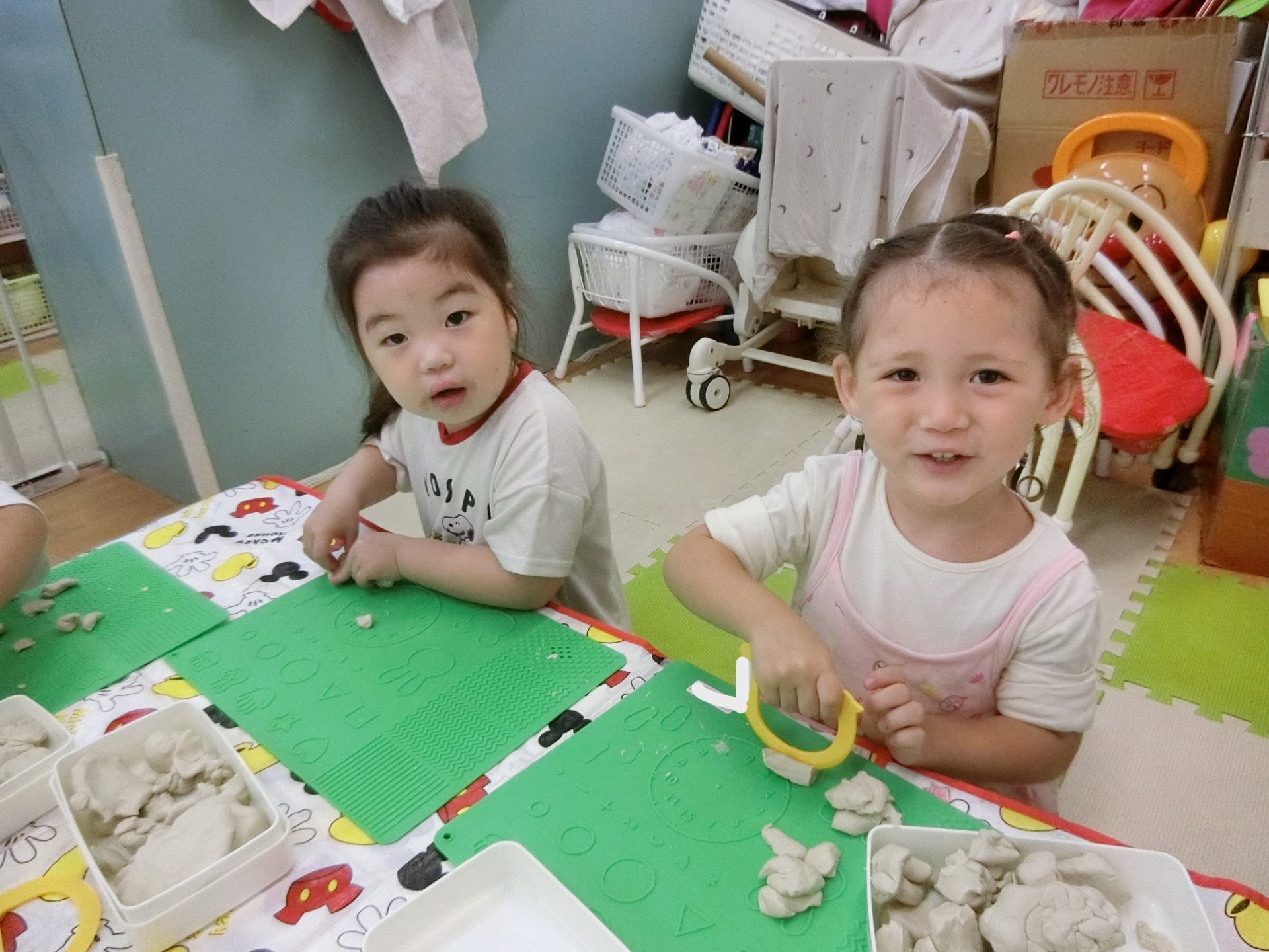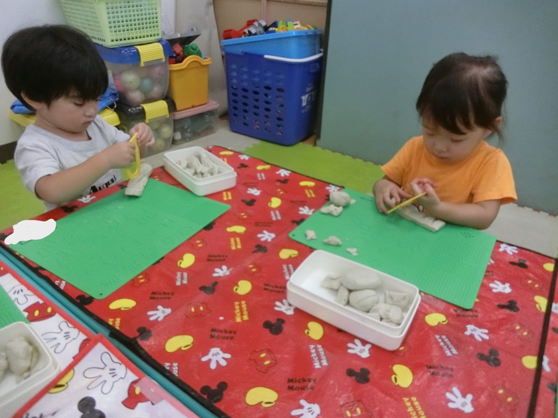 粘土遊びでは、餃子だったり、好きなキャラクター(ミッキー)や細長くして伸ばしたりと色々なものを作って、出来上がると先生に見せていました☺