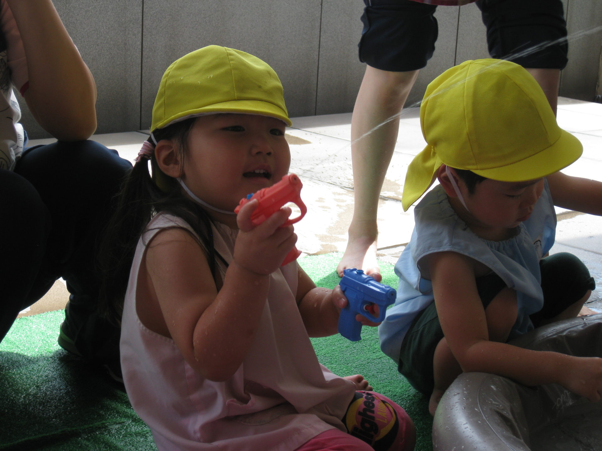 水鉄砲を2つ持って交互に撃っているお友達( *´艸`)