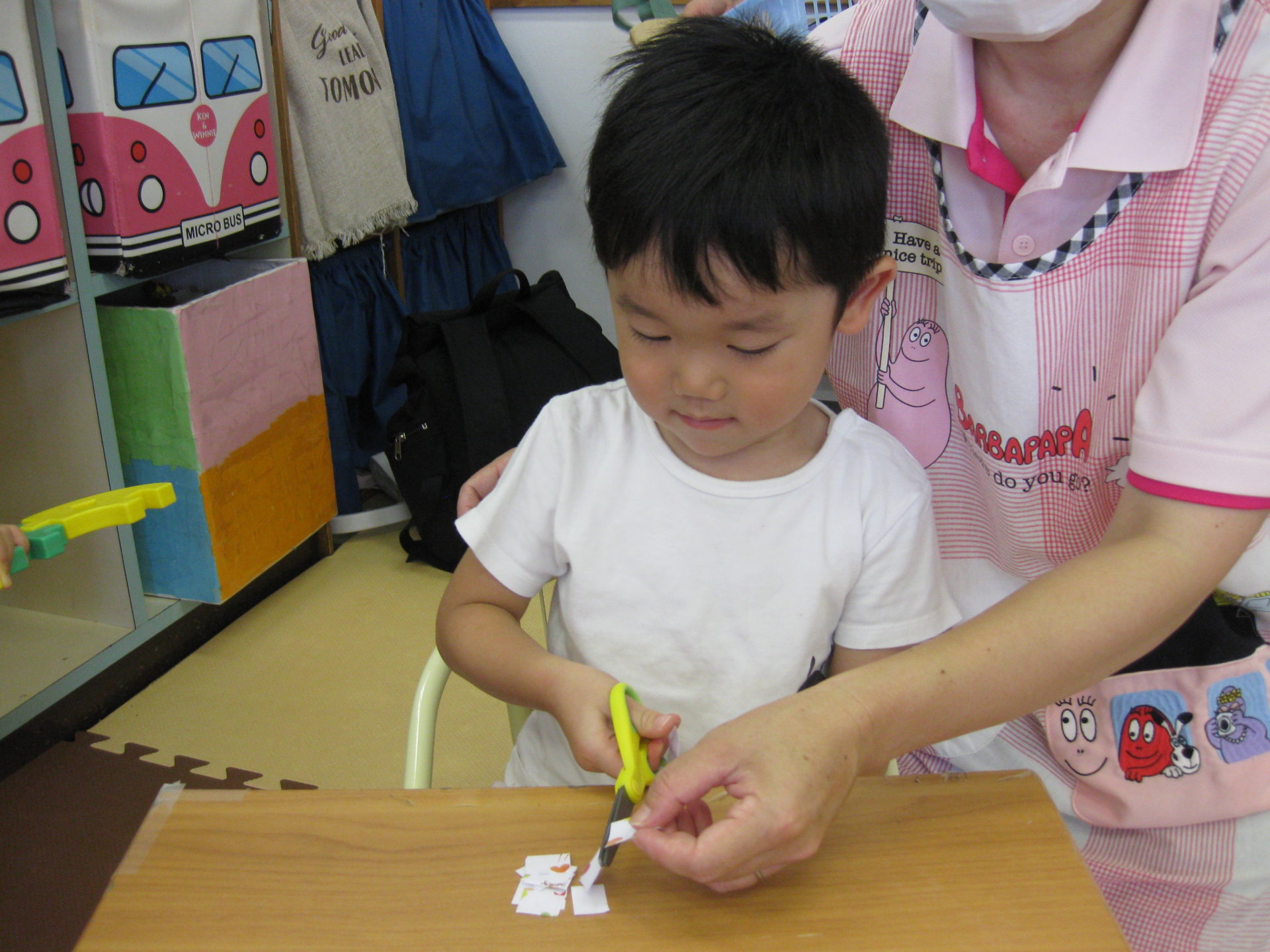 折り紙をチョッキン✂! はさみを使って切りました。