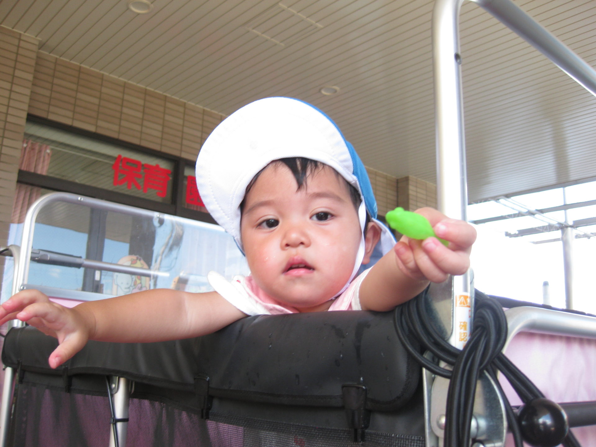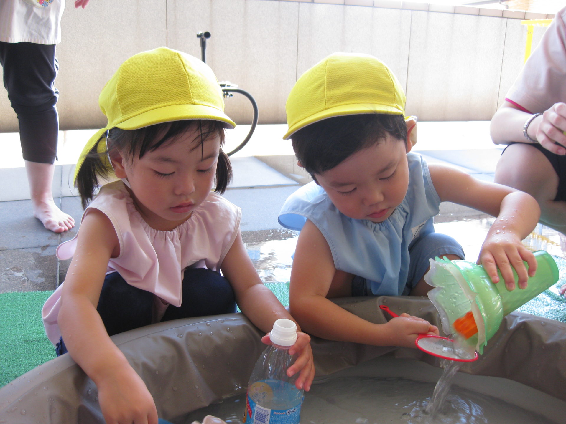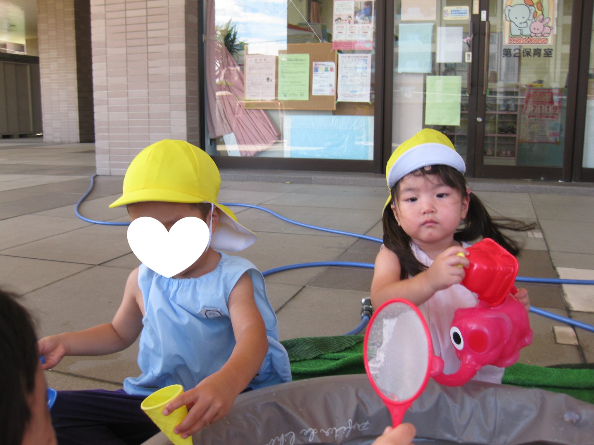 バケツやカップに水を汲むと、お魚さんを入れて遊んだり、ポイでお水をかき混ぜたり、ジャーっと勢いよく水を流してみたりしながら楽しみました🐟