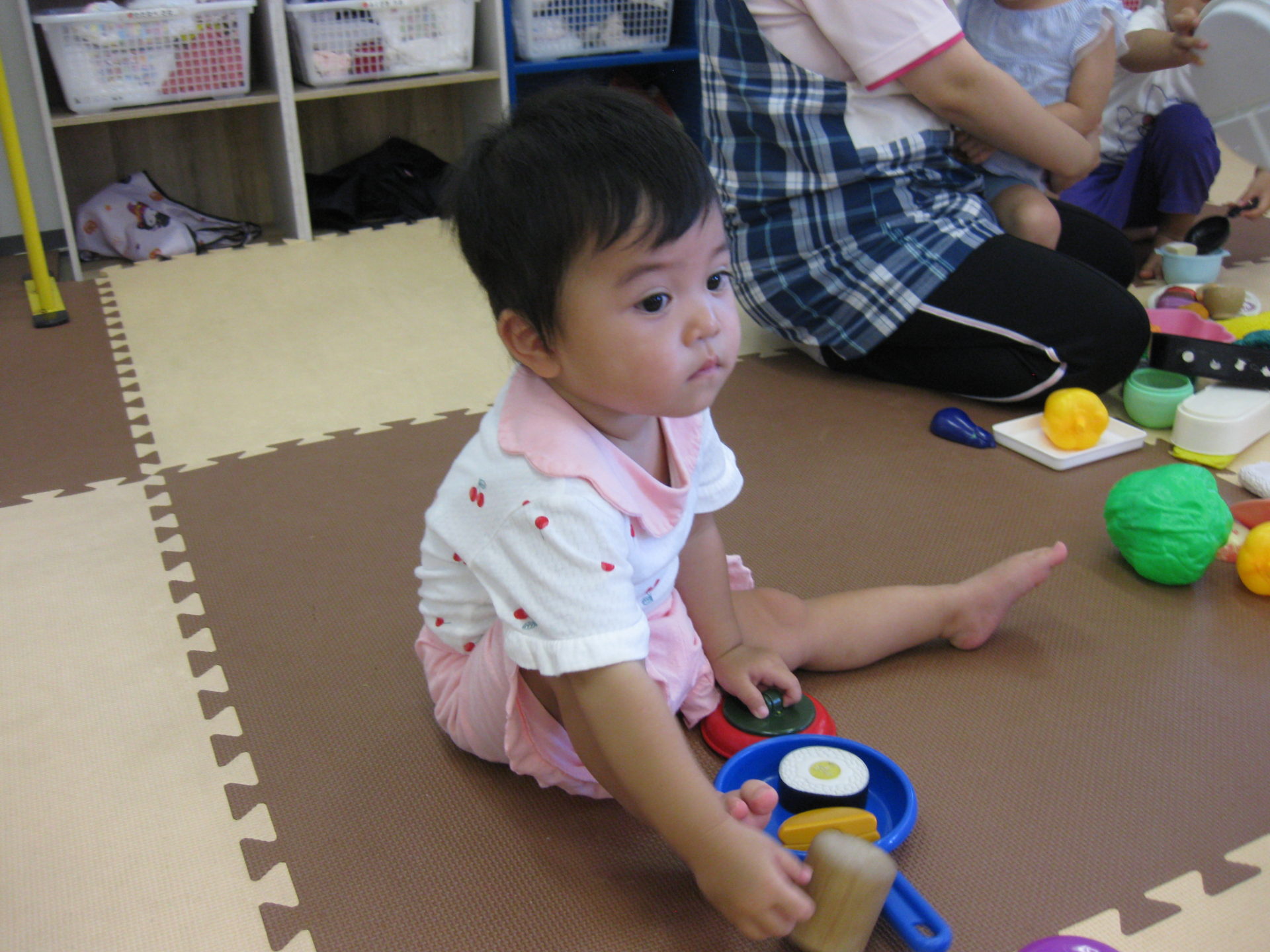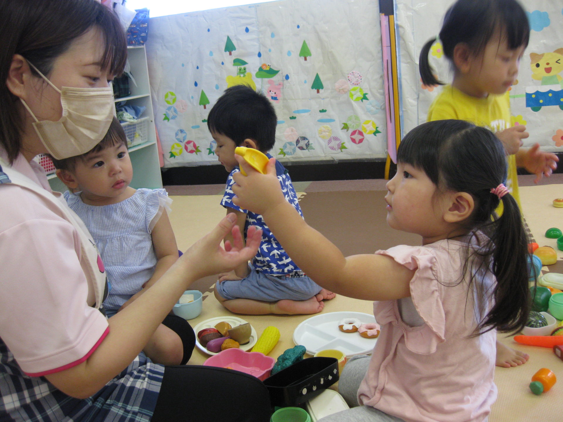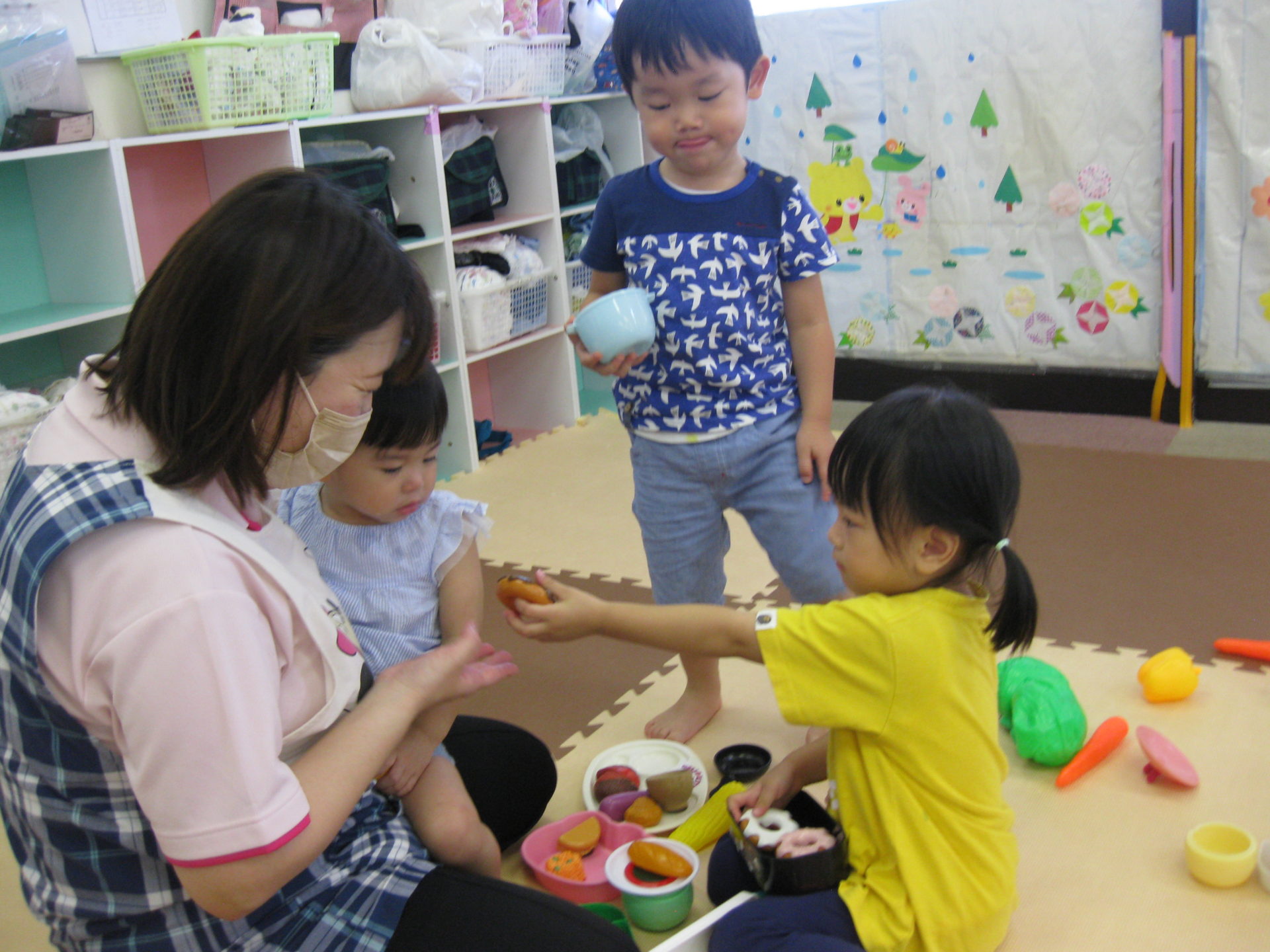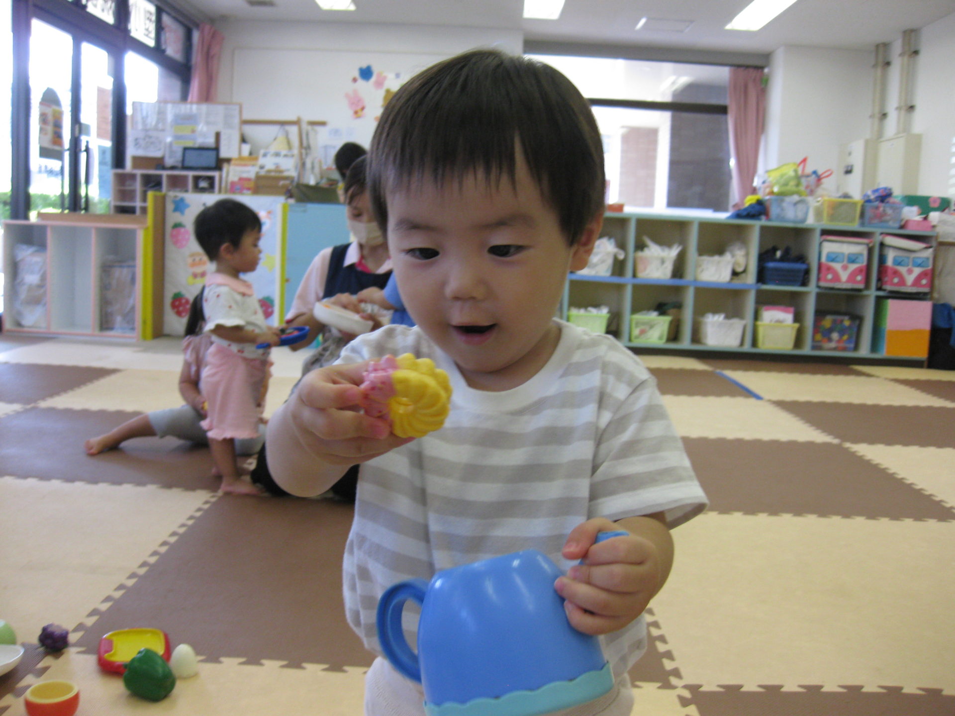 バケツやカップに水を汲むと、お魚さんを入れて遊んだり、ポイでお水をかき混ぜたり、ジャーっと勢いよく水を流してみたりしながら楽しみました🐟