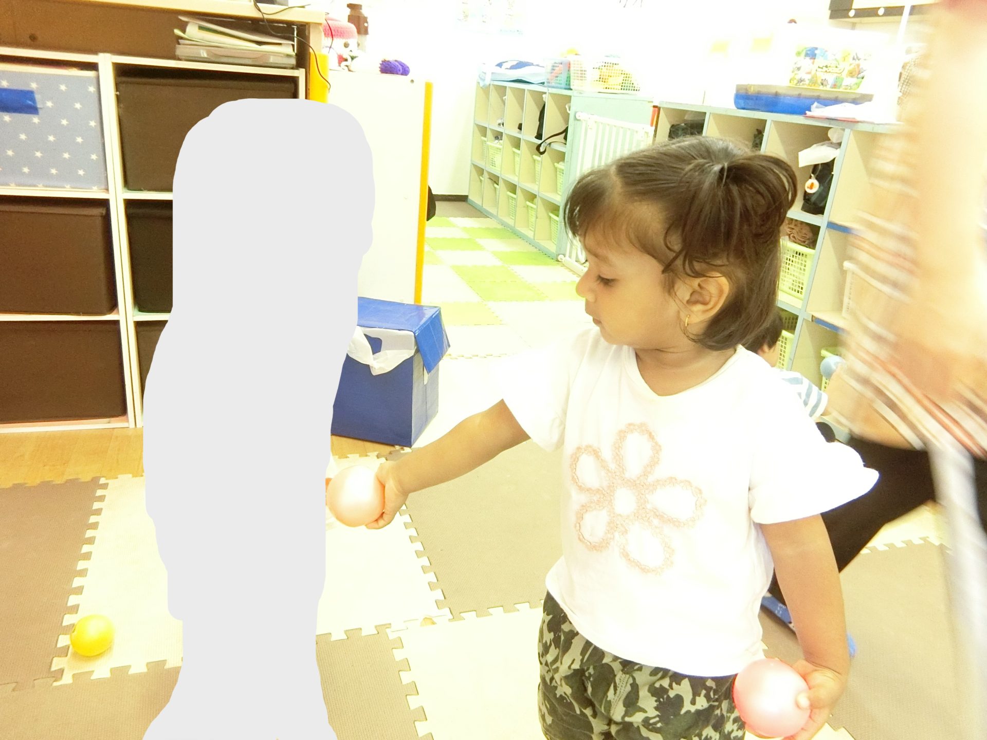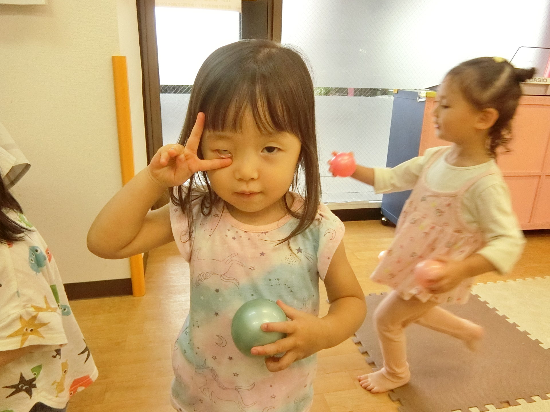 お部屋の中では体操⇒ボール遊び⇒トンネル遊びをしています。