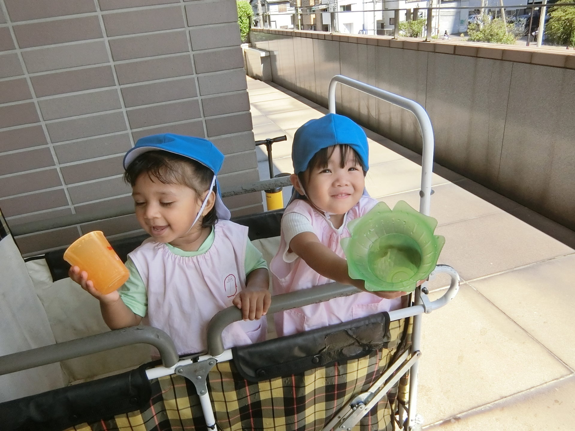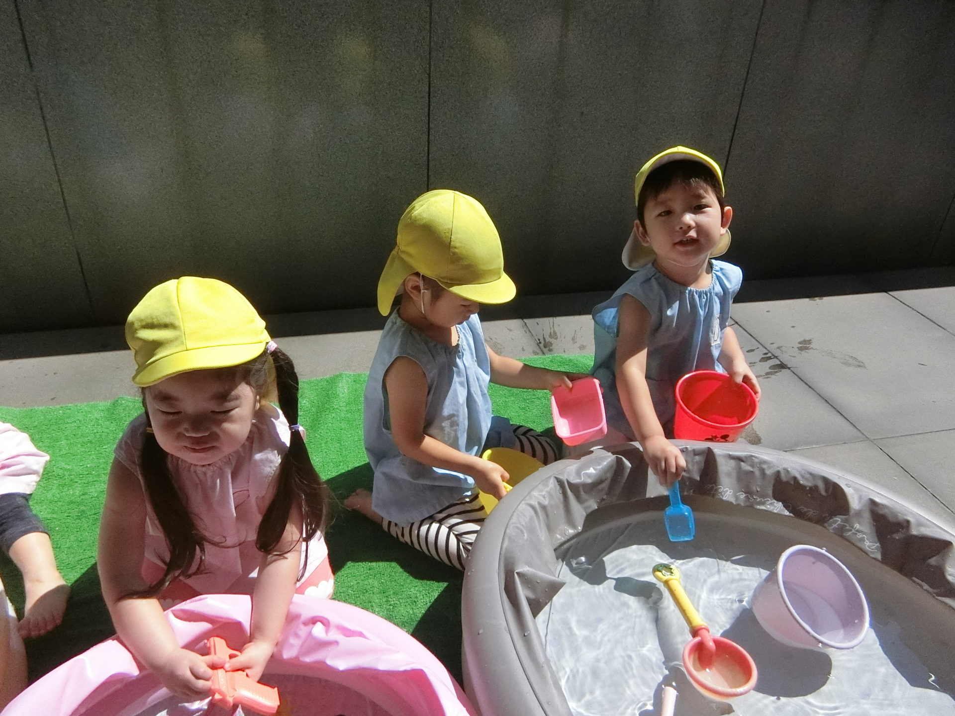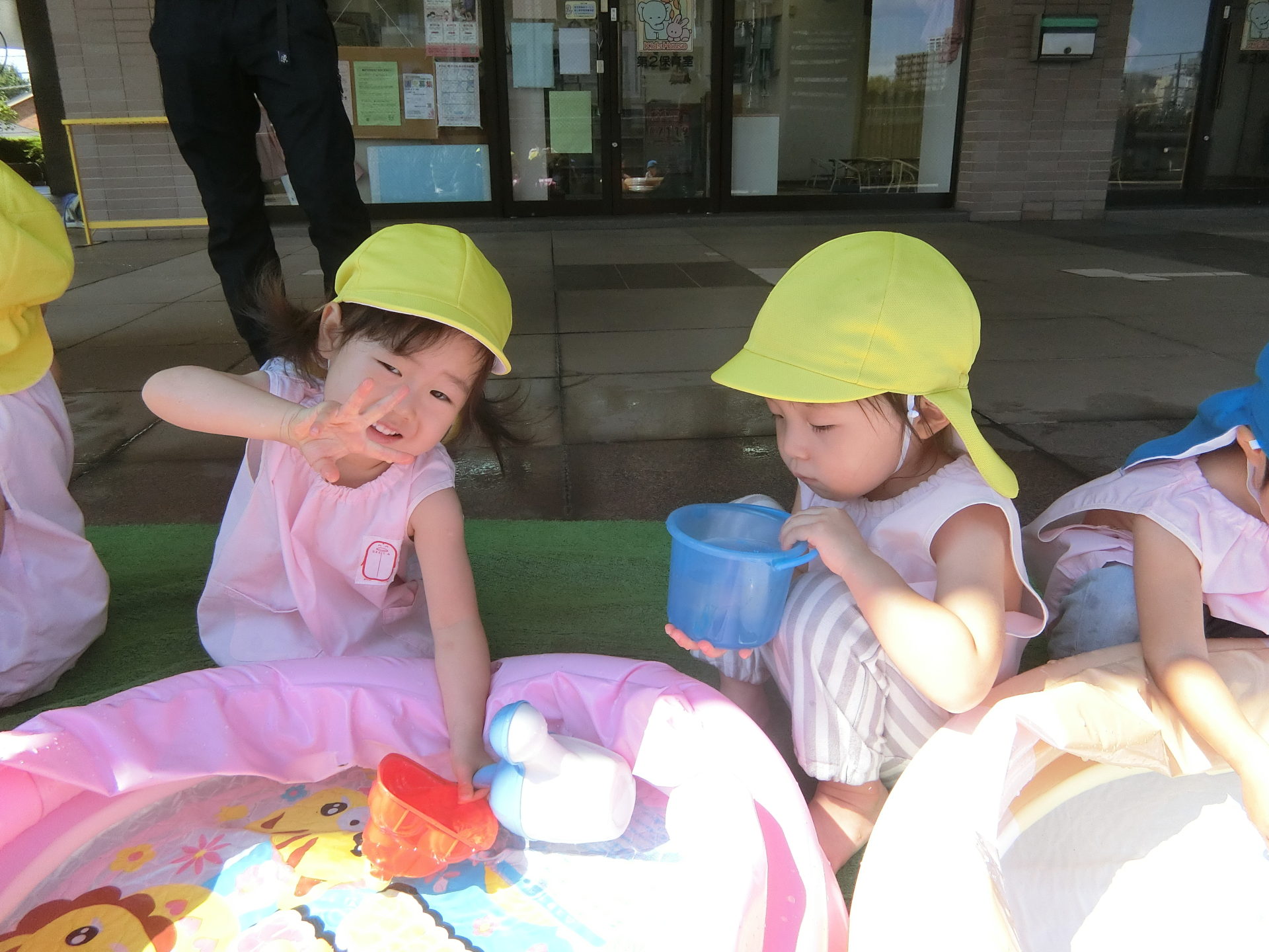 手でバチャバチャしたり、お友だちに水鉄砲でお水をかけたり。お水遊びも残り3回で、夏も終わりかと思うと寂しいですね。