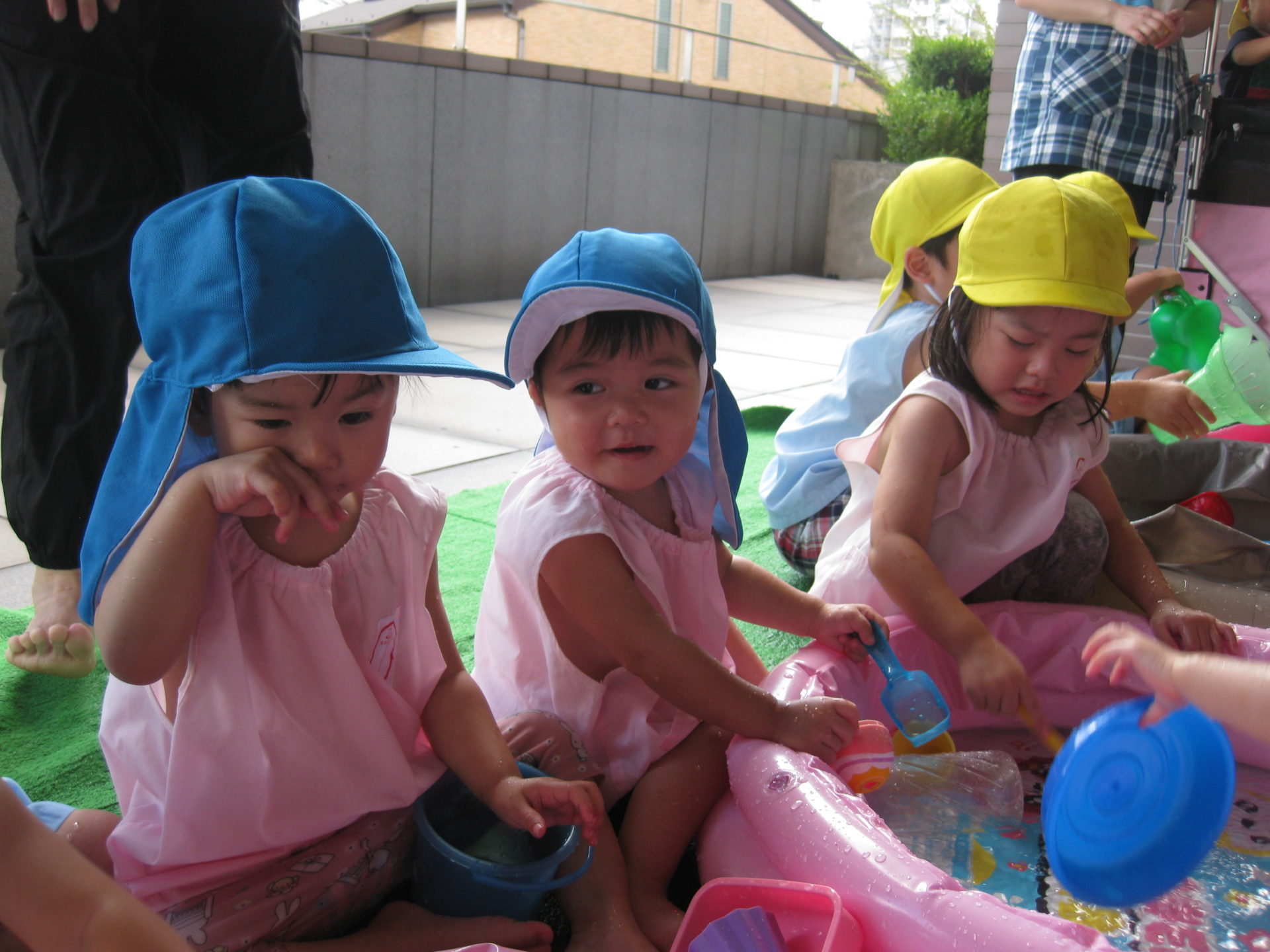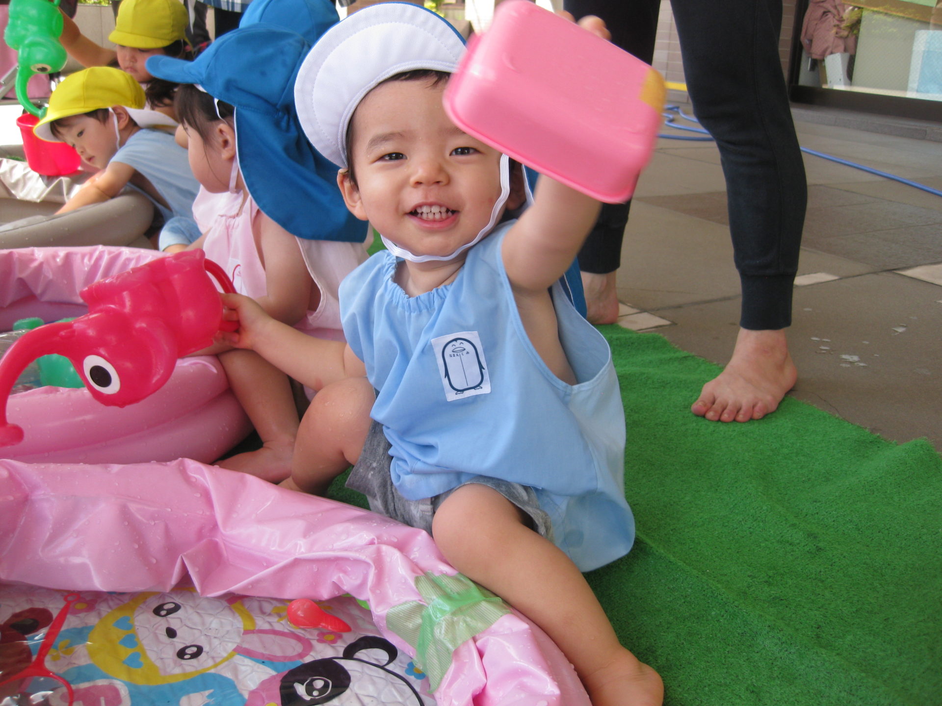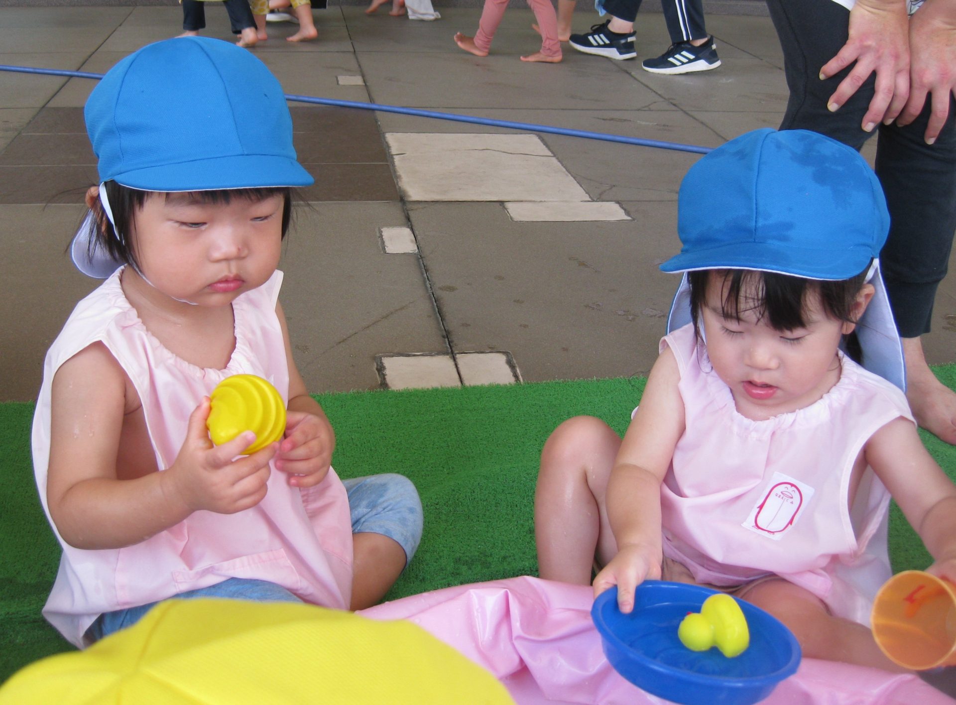 こあら組のお姉さんがうさぎ組のお友達に水をかけてあげていましたよ( *´艸`)