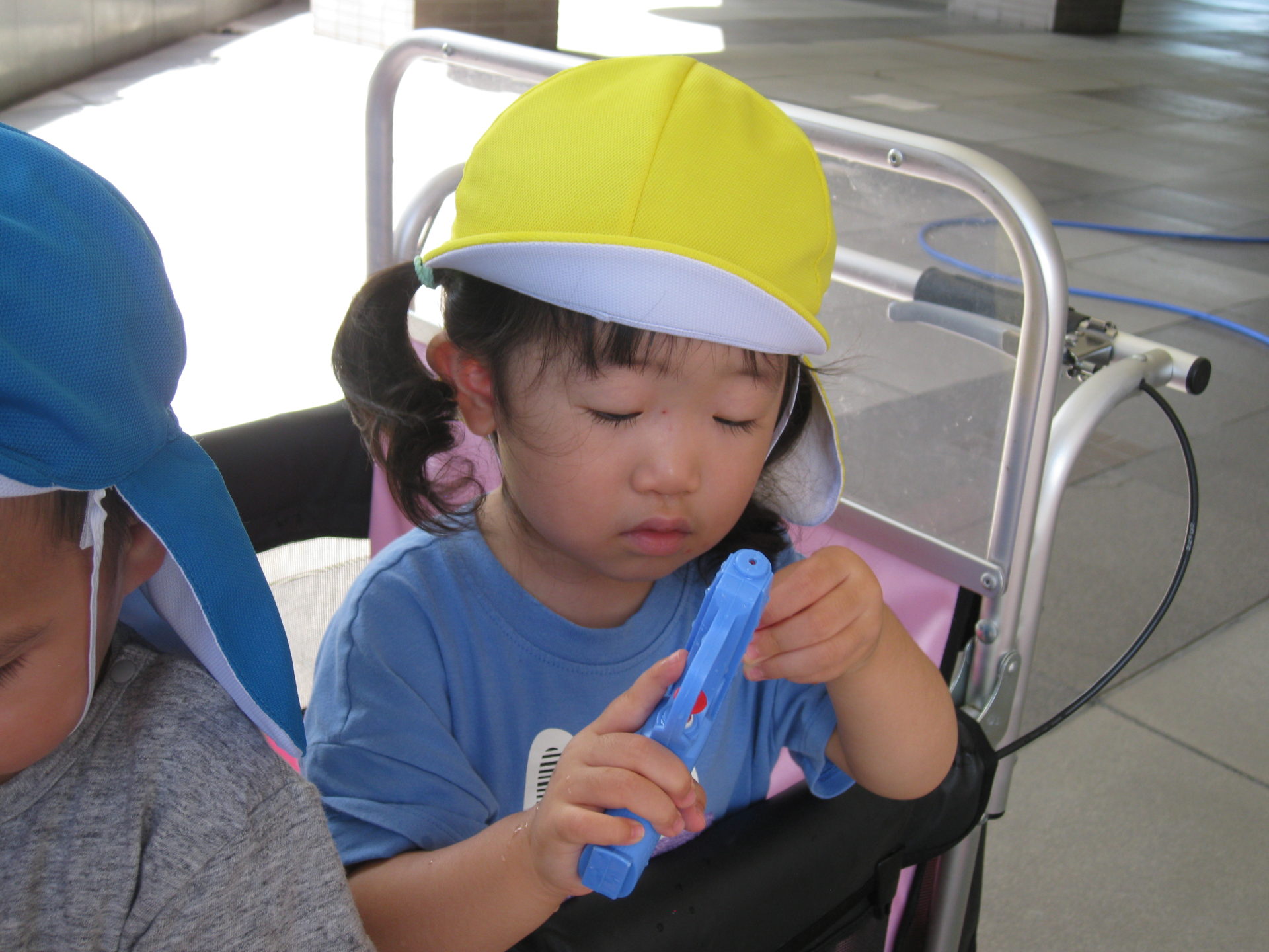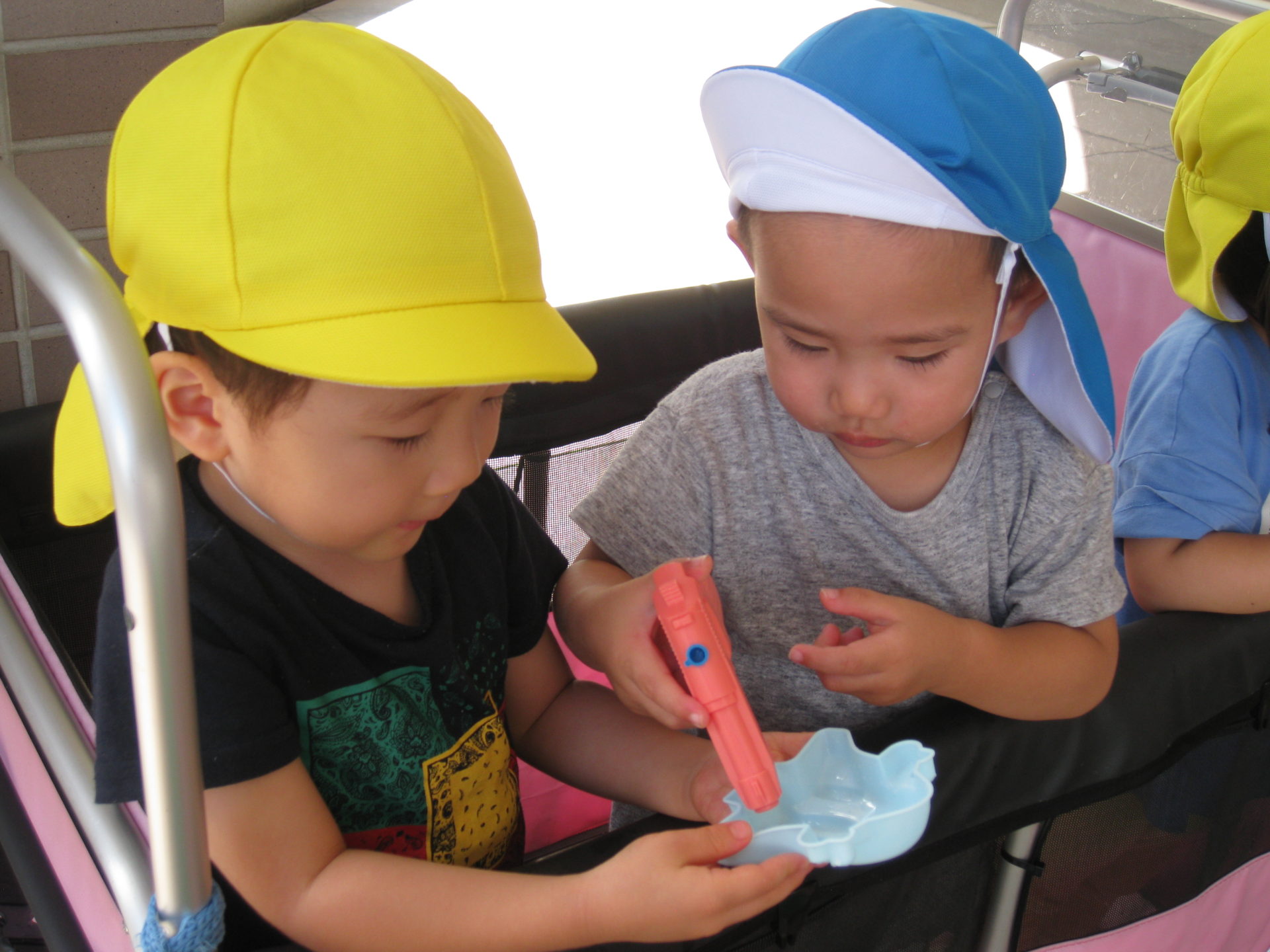 『おみずいーれーて!』とお友達にお願いして水鉄砲でお水を入れてもらっていました😊