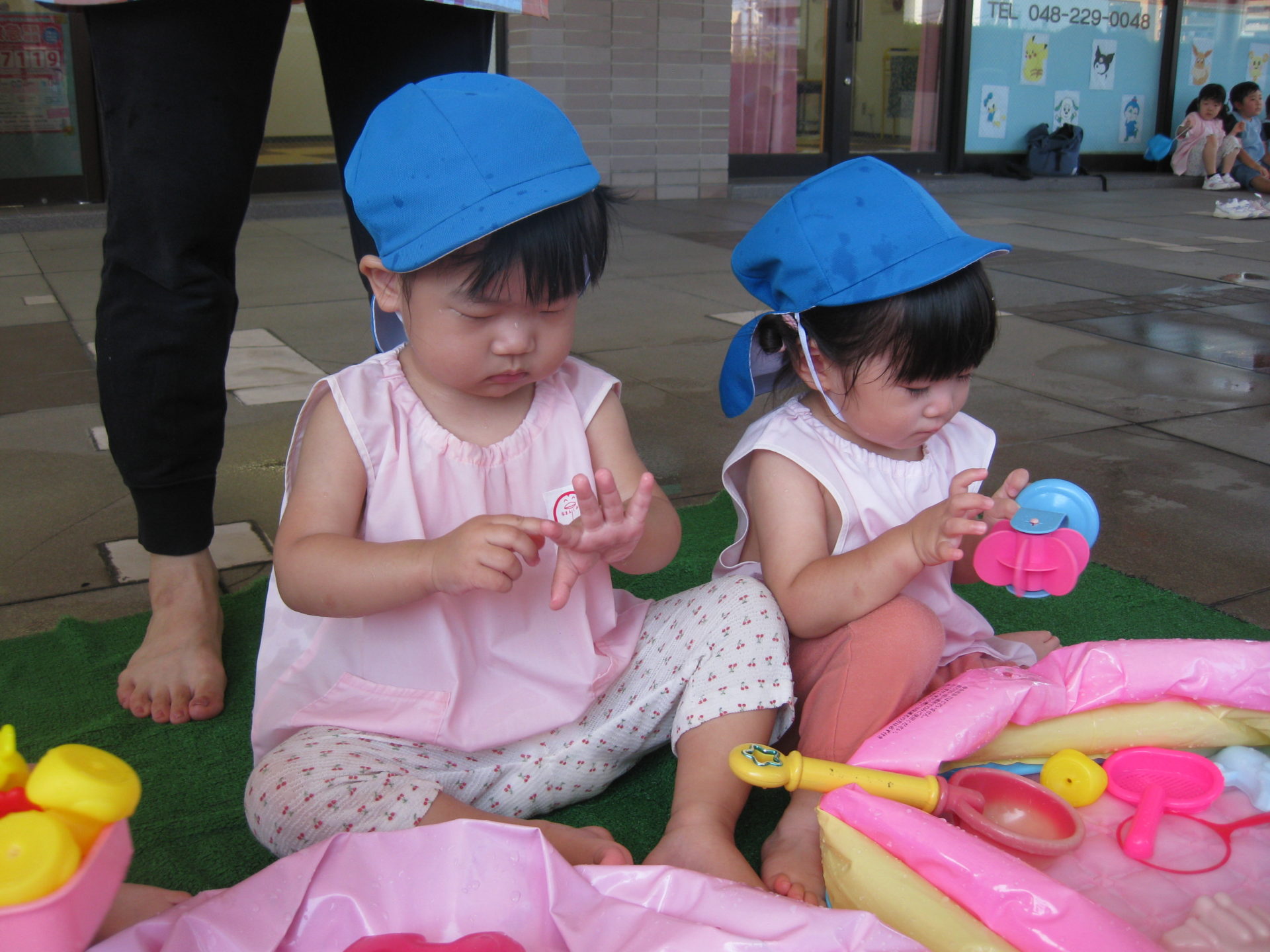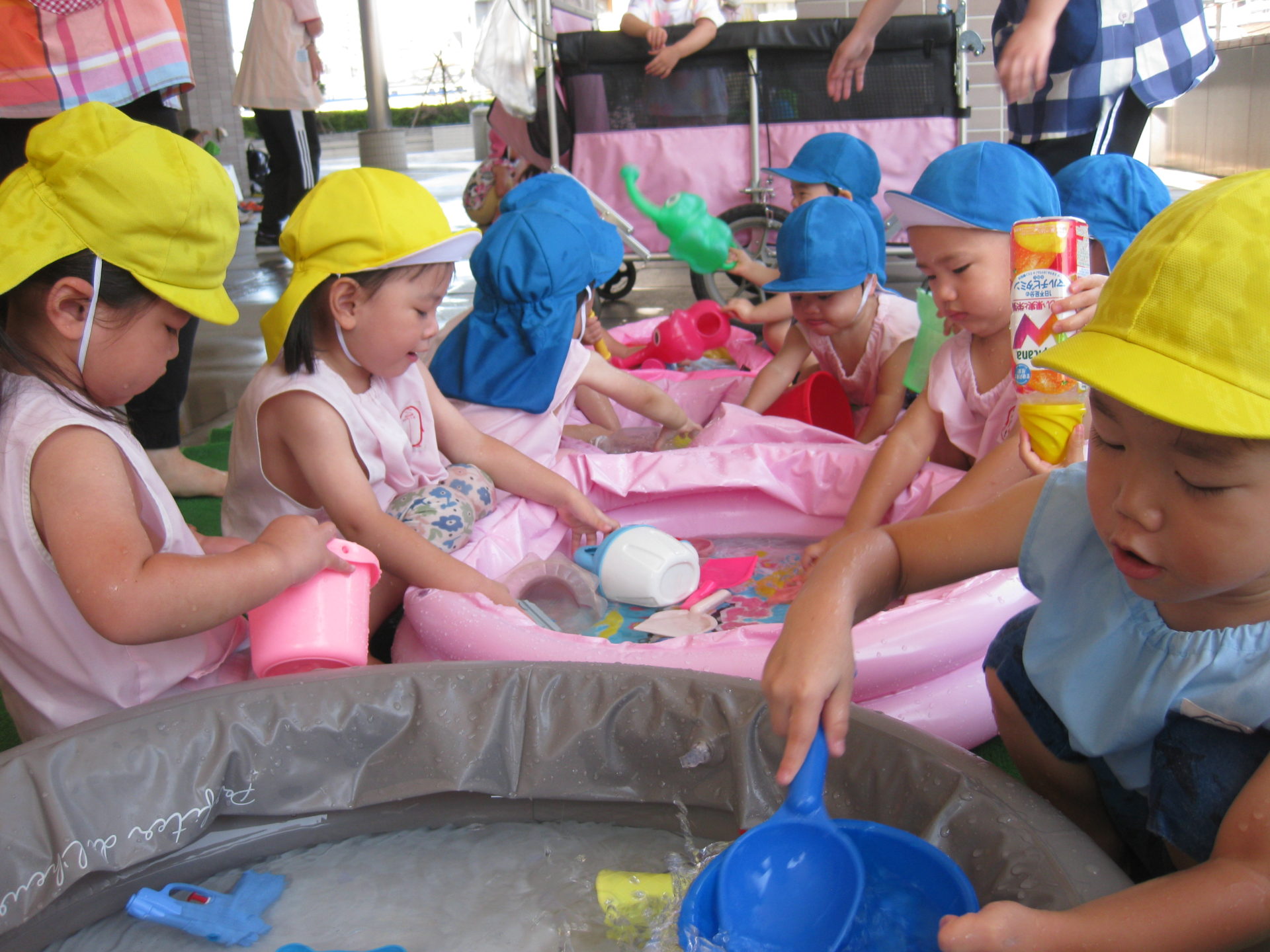 始まりの合図をきくと、子どもたちは一斉に手をのばし、勢いよくプールの中のお水に触れていました☆