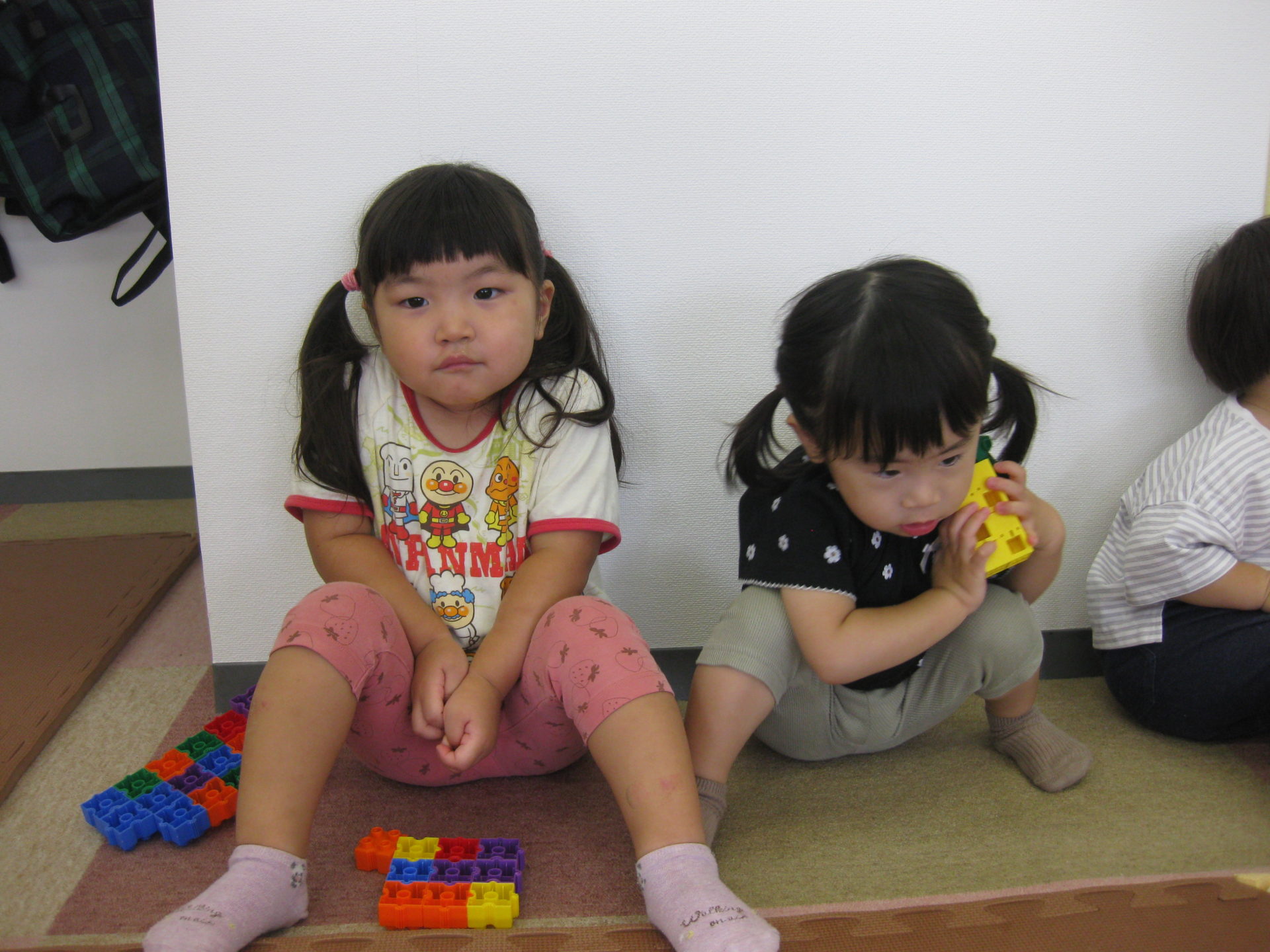 朝のブロック遊び中、仲良く並んでパシャリ📸✨