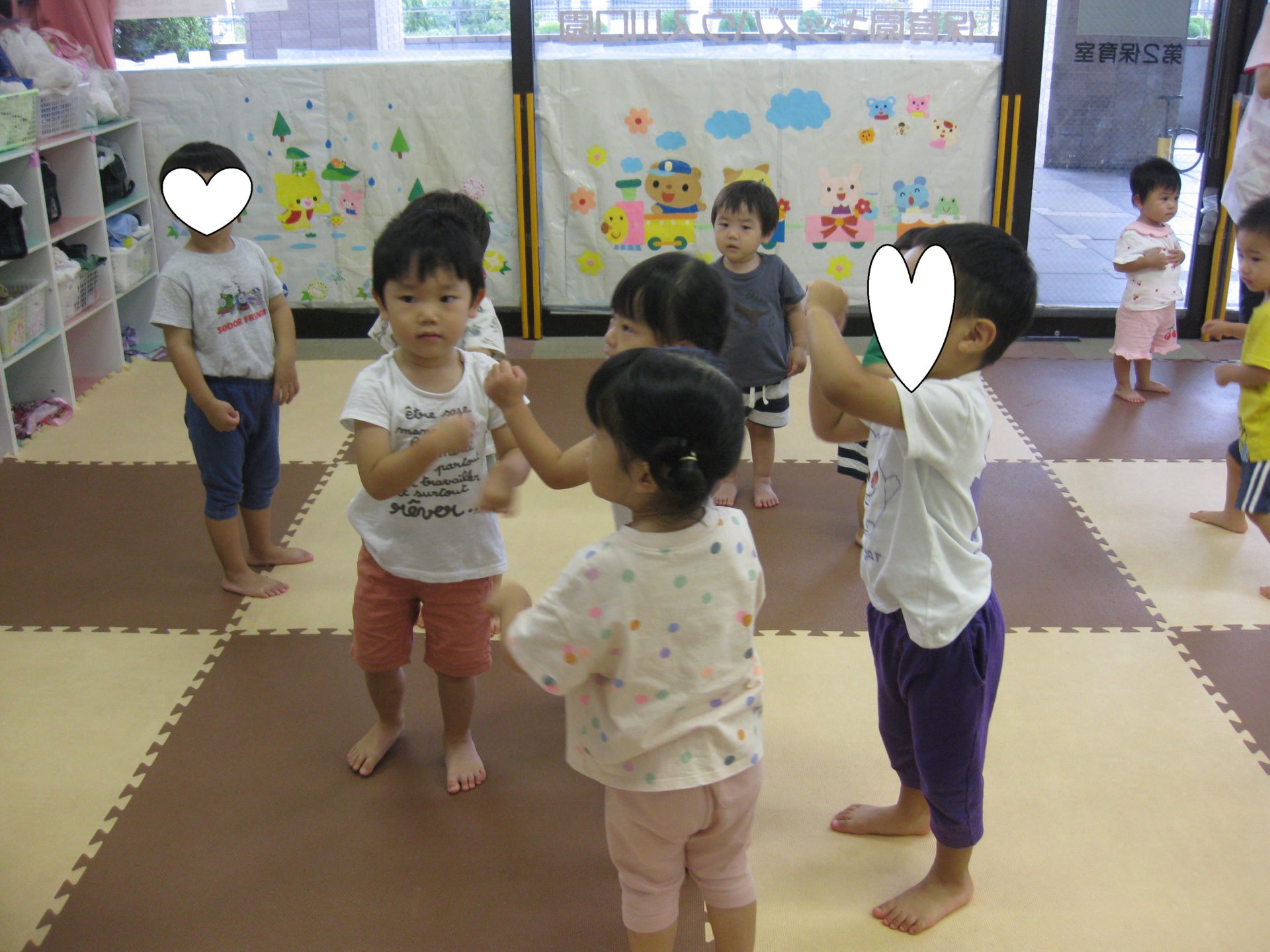 お水遊びの前にはサンサン体操を踊りました!みんなとっても上手に真似をして体を動かしてくれましたよ🤩少しずつ覚えてくれていて嬉しいです🎵