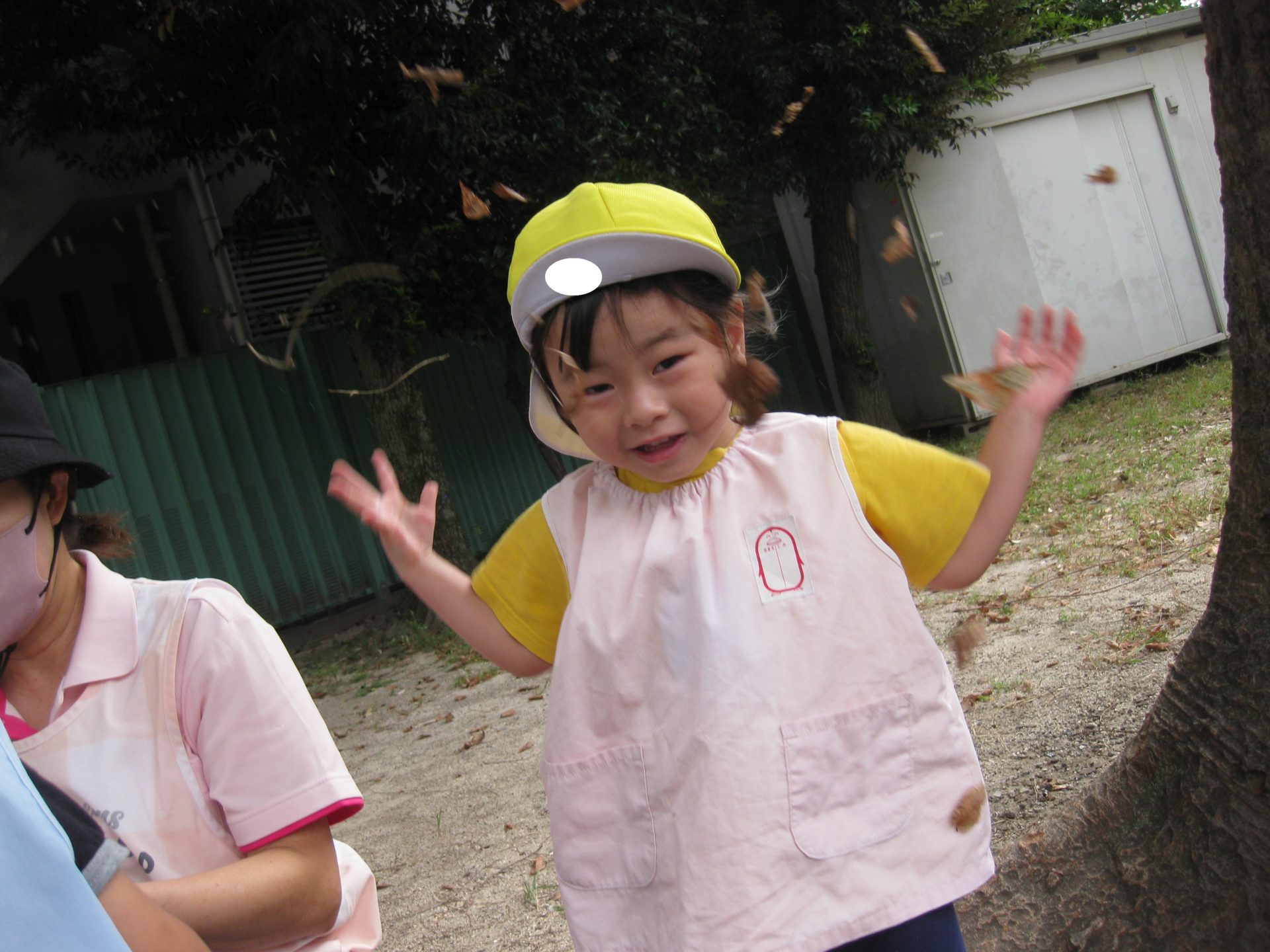 落ち葉でシャワ~!周りで見ていたお友達も「わぁ~✨」と喜んで見ていました🥰