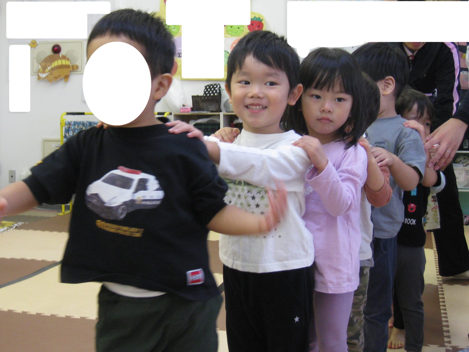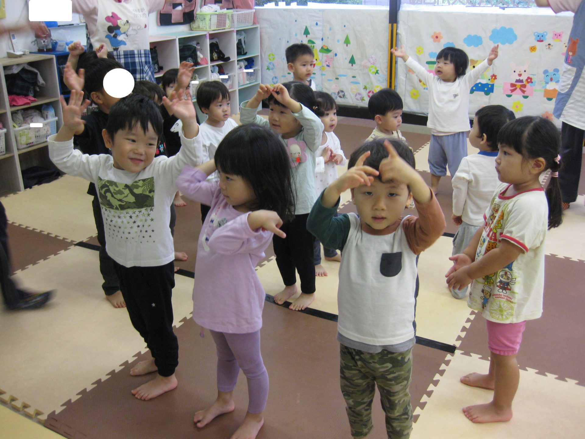 お部屋で第1保育室のお友達と一緒に運動会の練習を行いました!