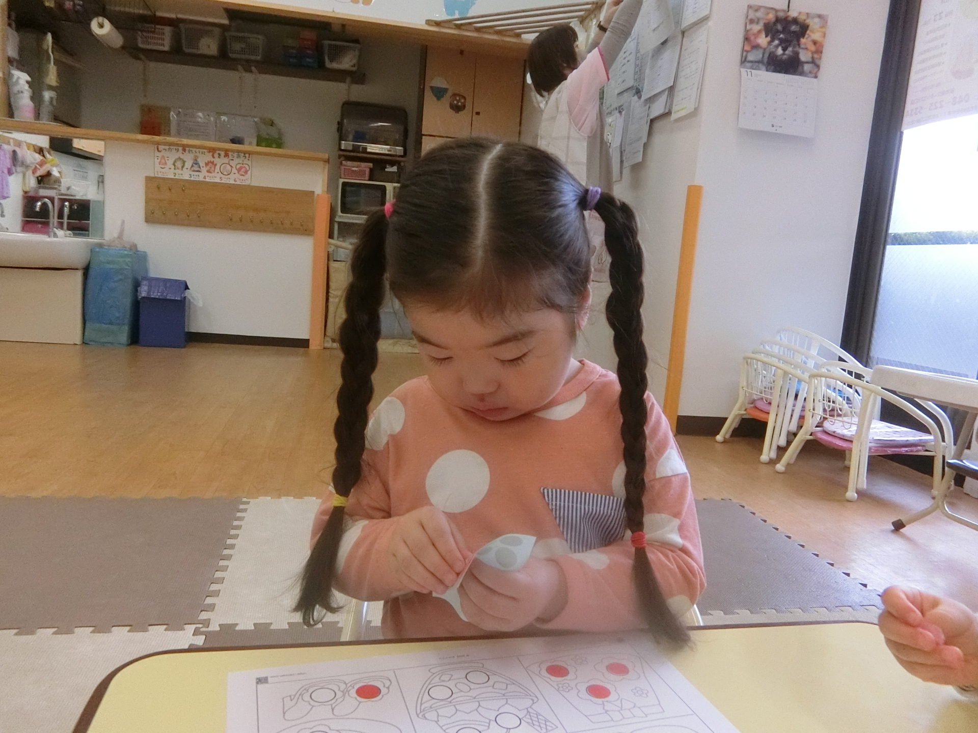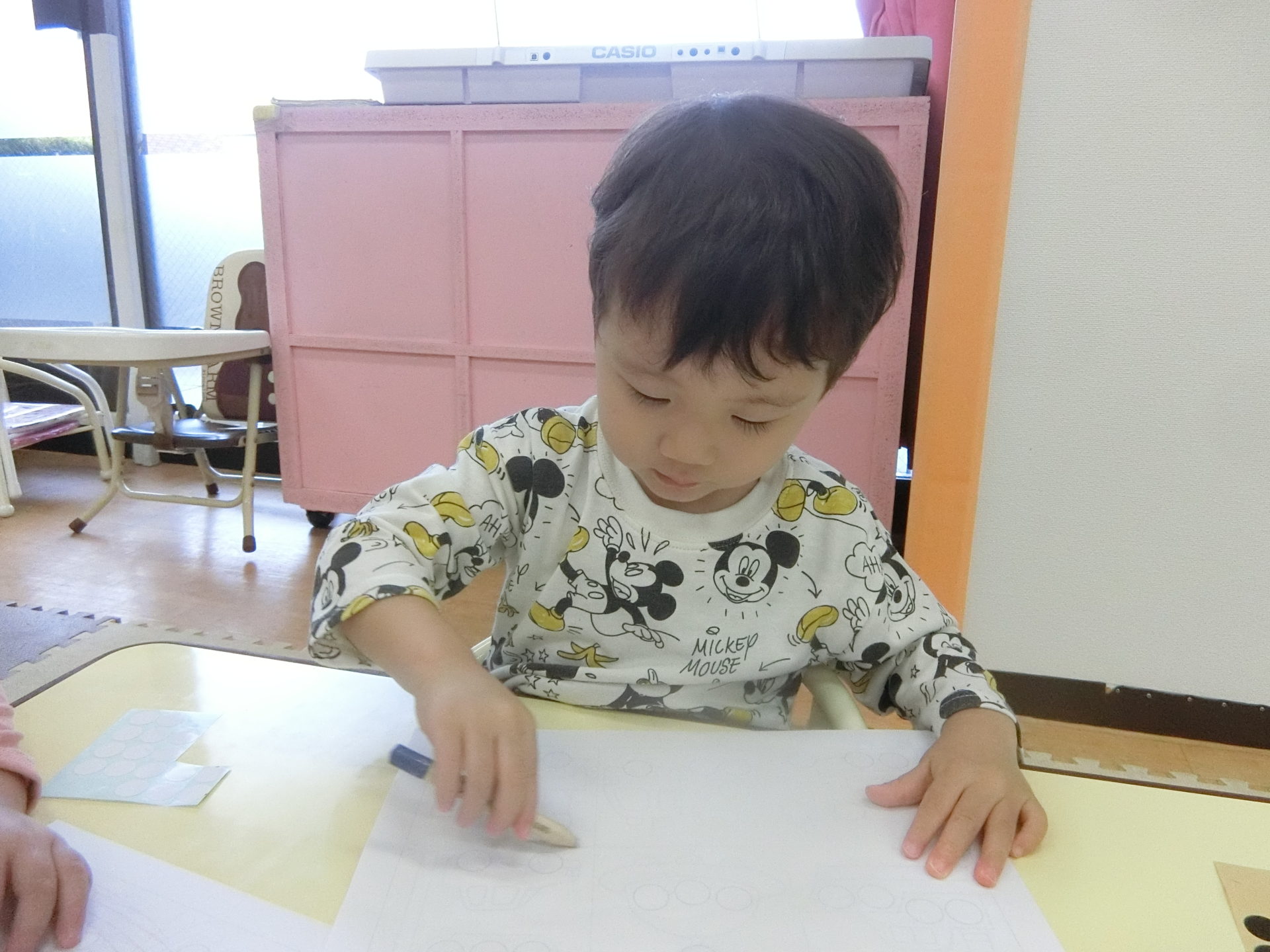 シール貼りでは、貼るシールを丸の書いてあるところに綺麗に貼るんですが、