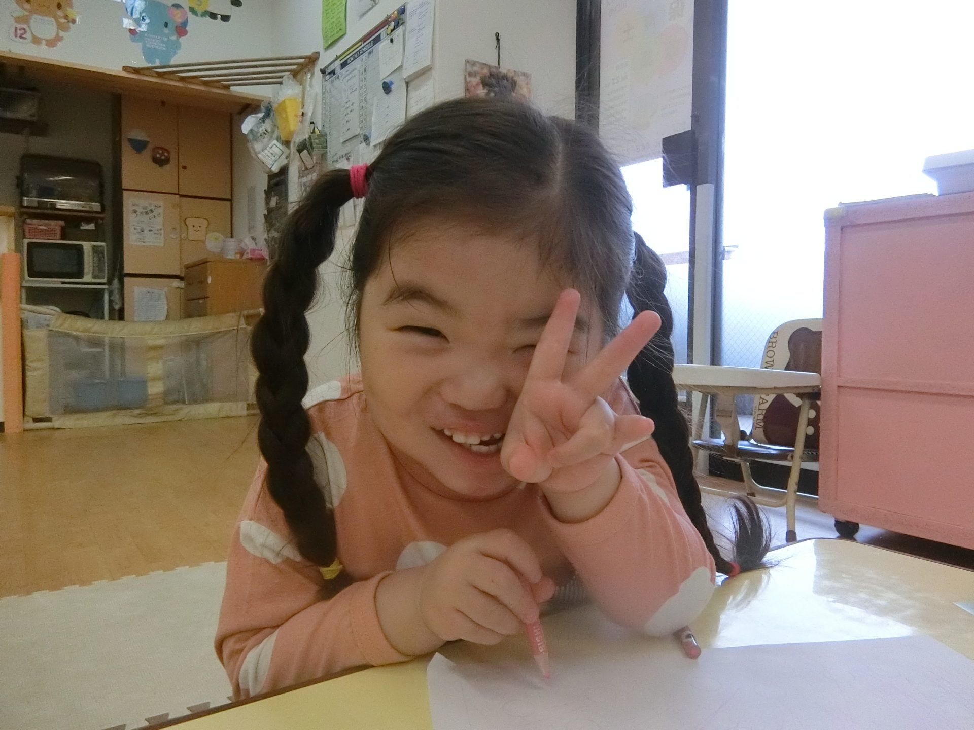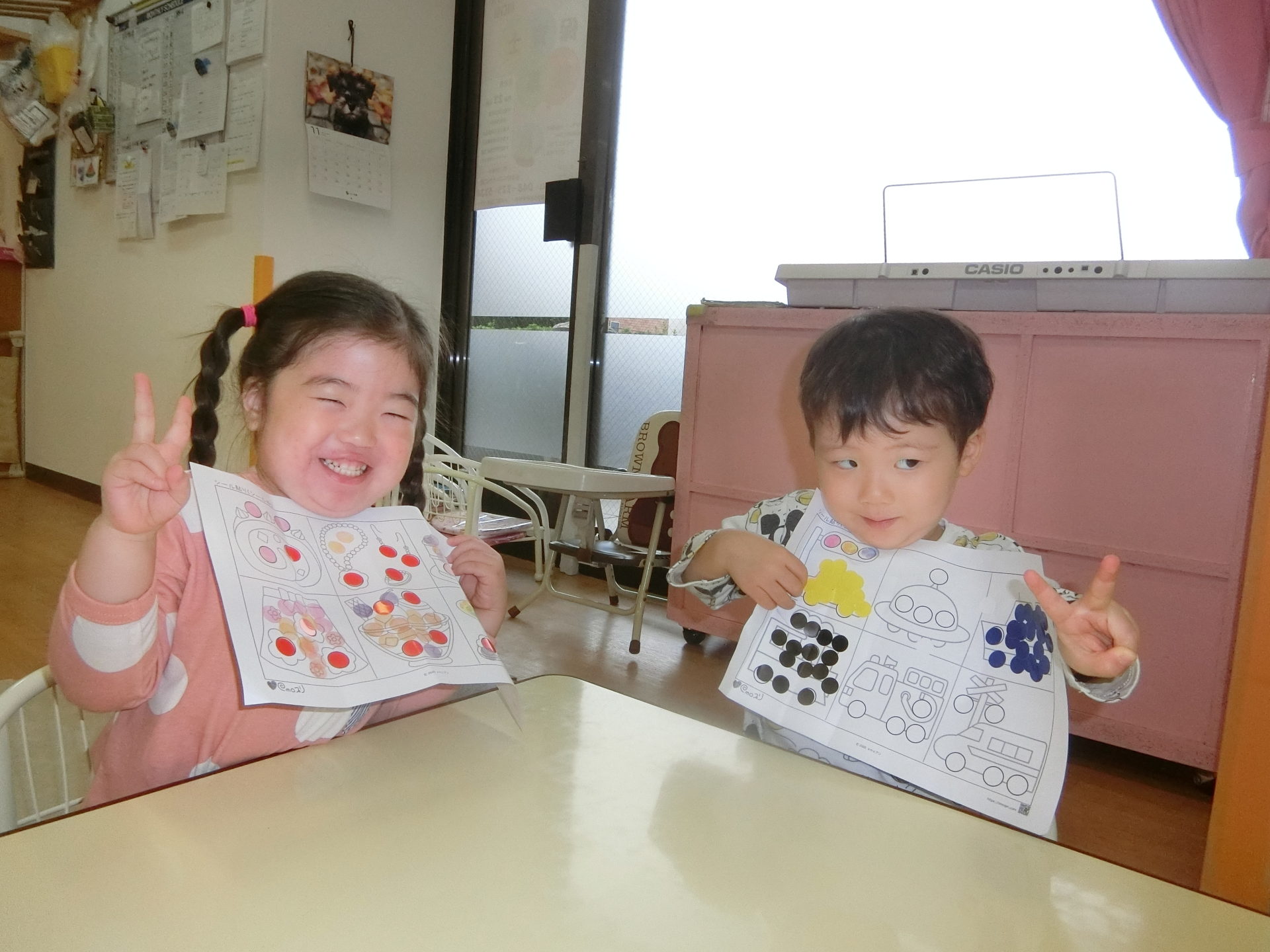 また、シールが貼り終わると色鉛筆を使ってシールの紙の後ろにもお絵描きをして楽しみました。