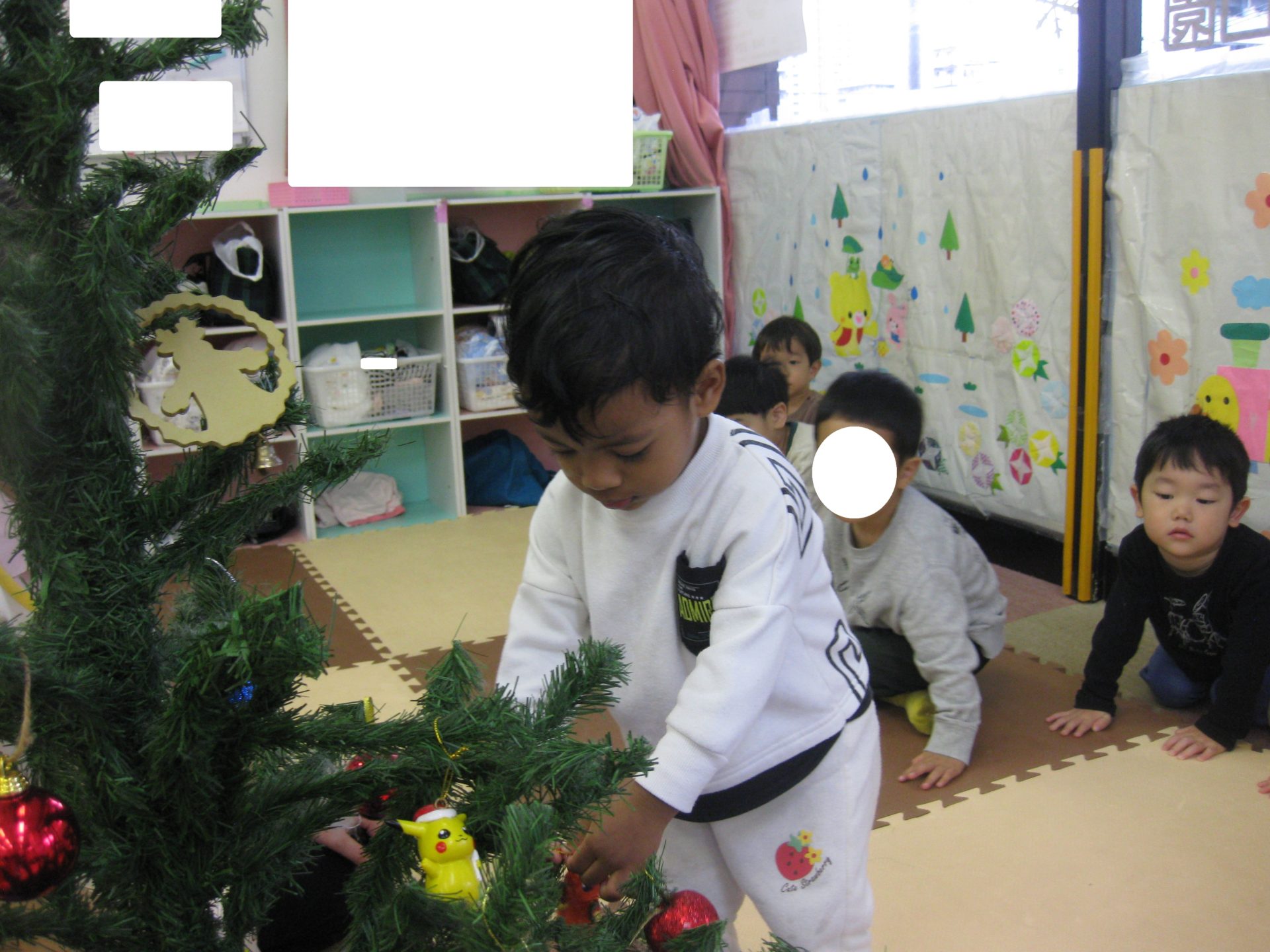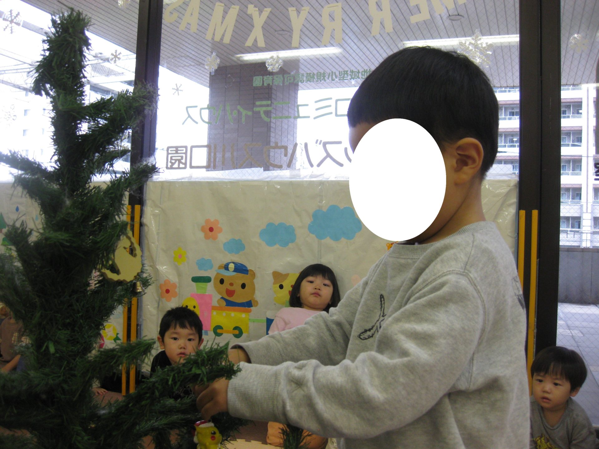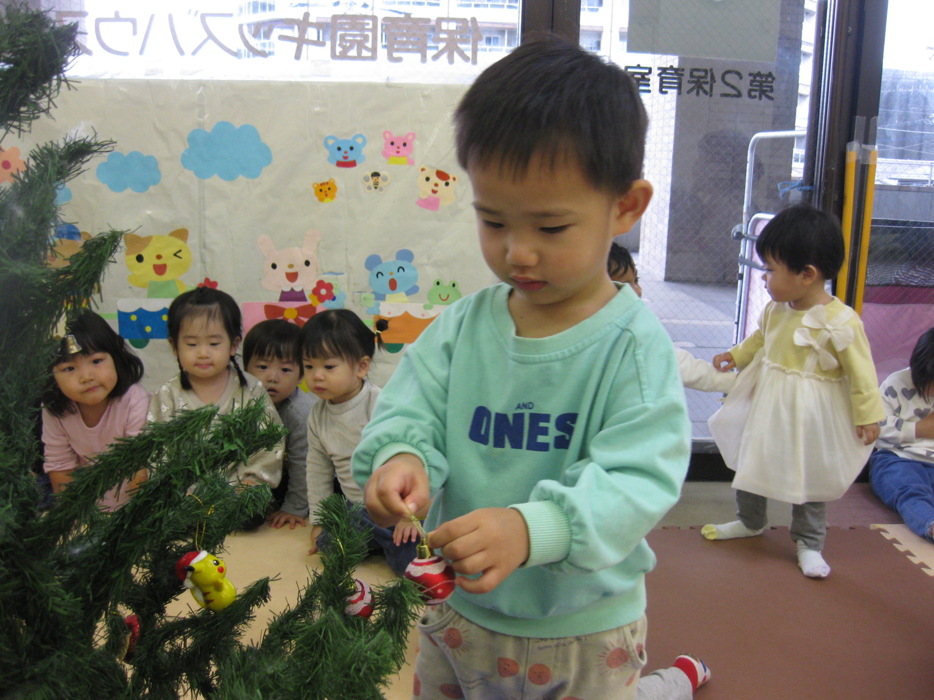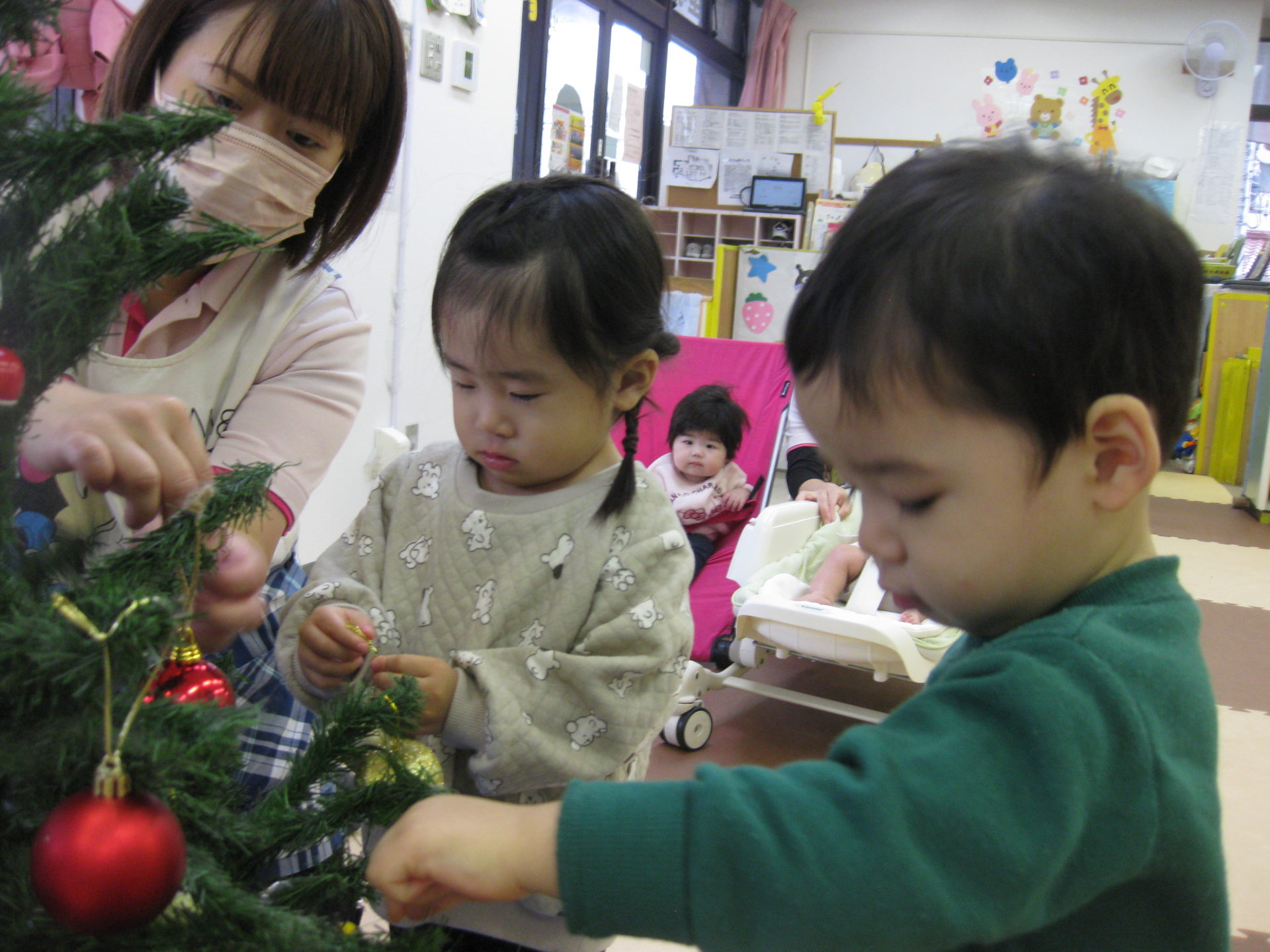 みんなで協力して飾付けたクリスマスツリー、保育室の入口に飾っております🥰