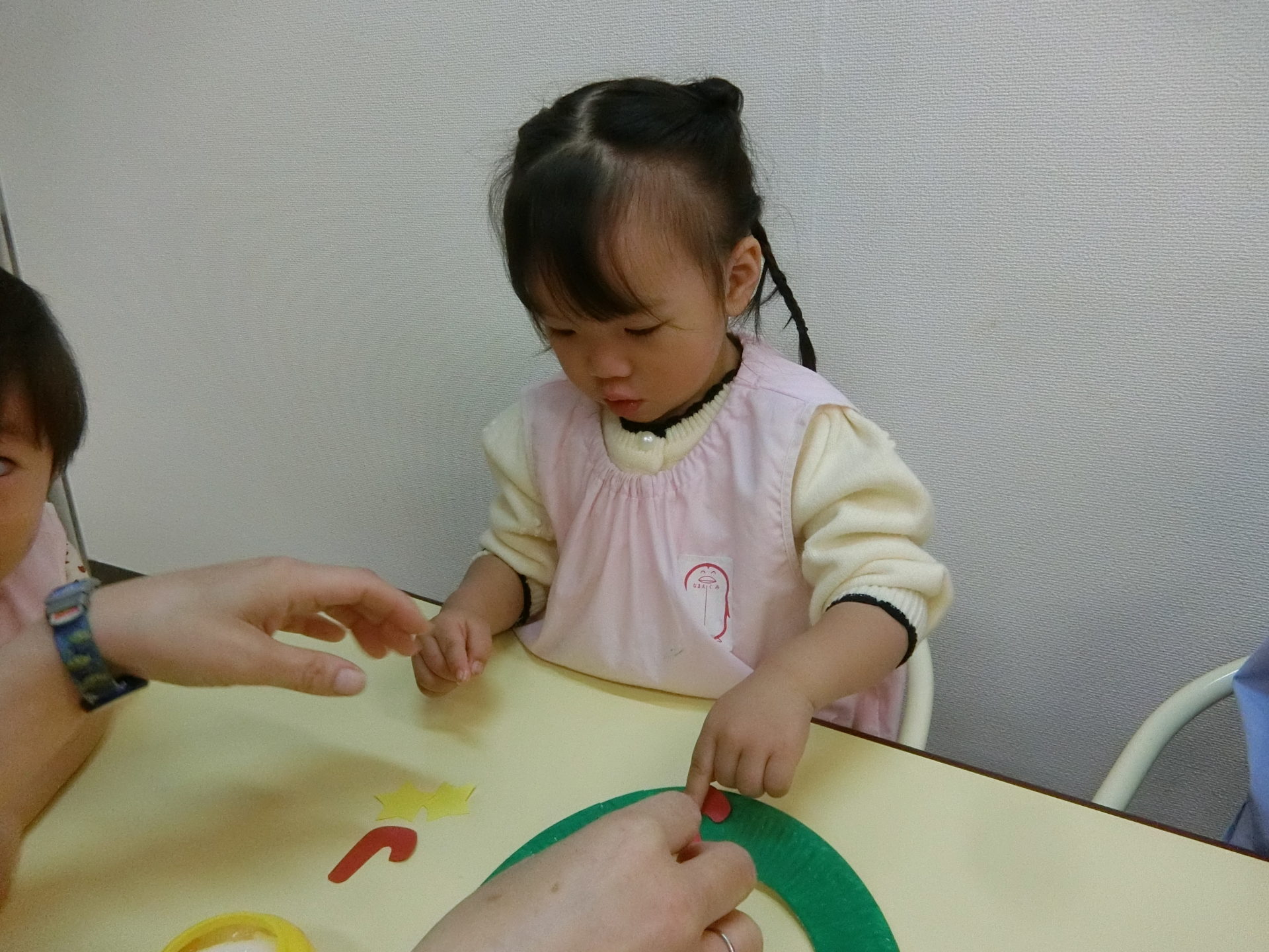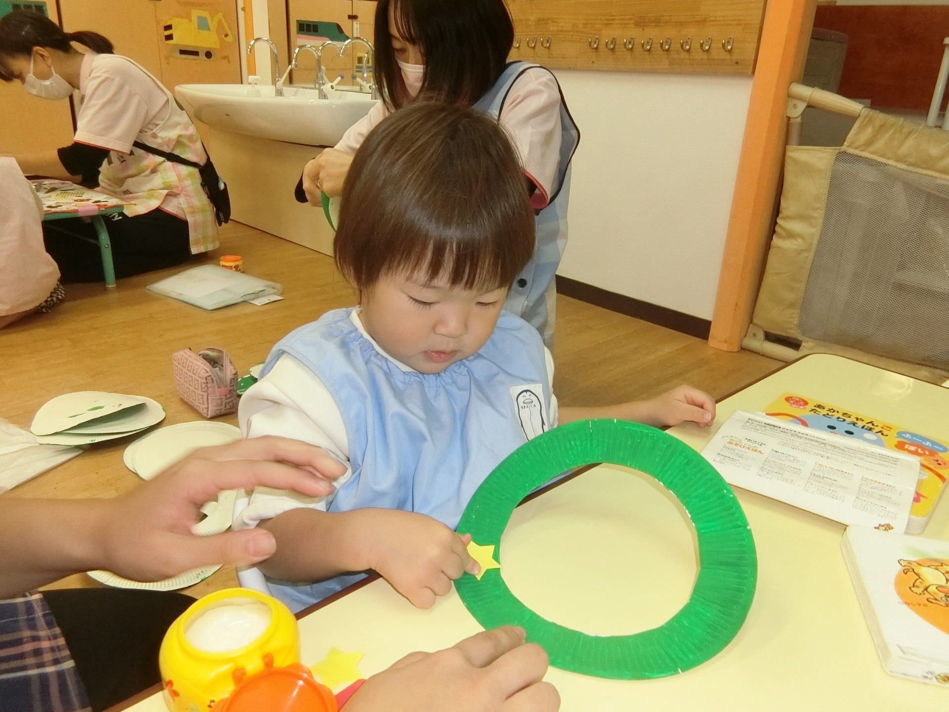 糊をぬりぬりしたり、シール貼りをしました。