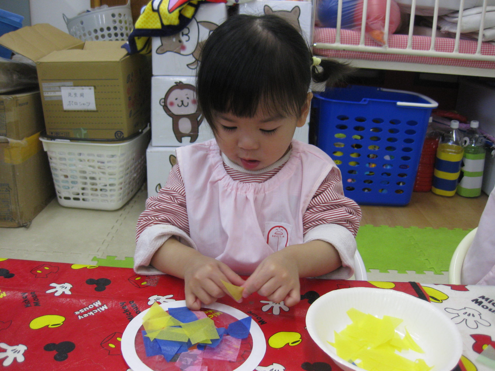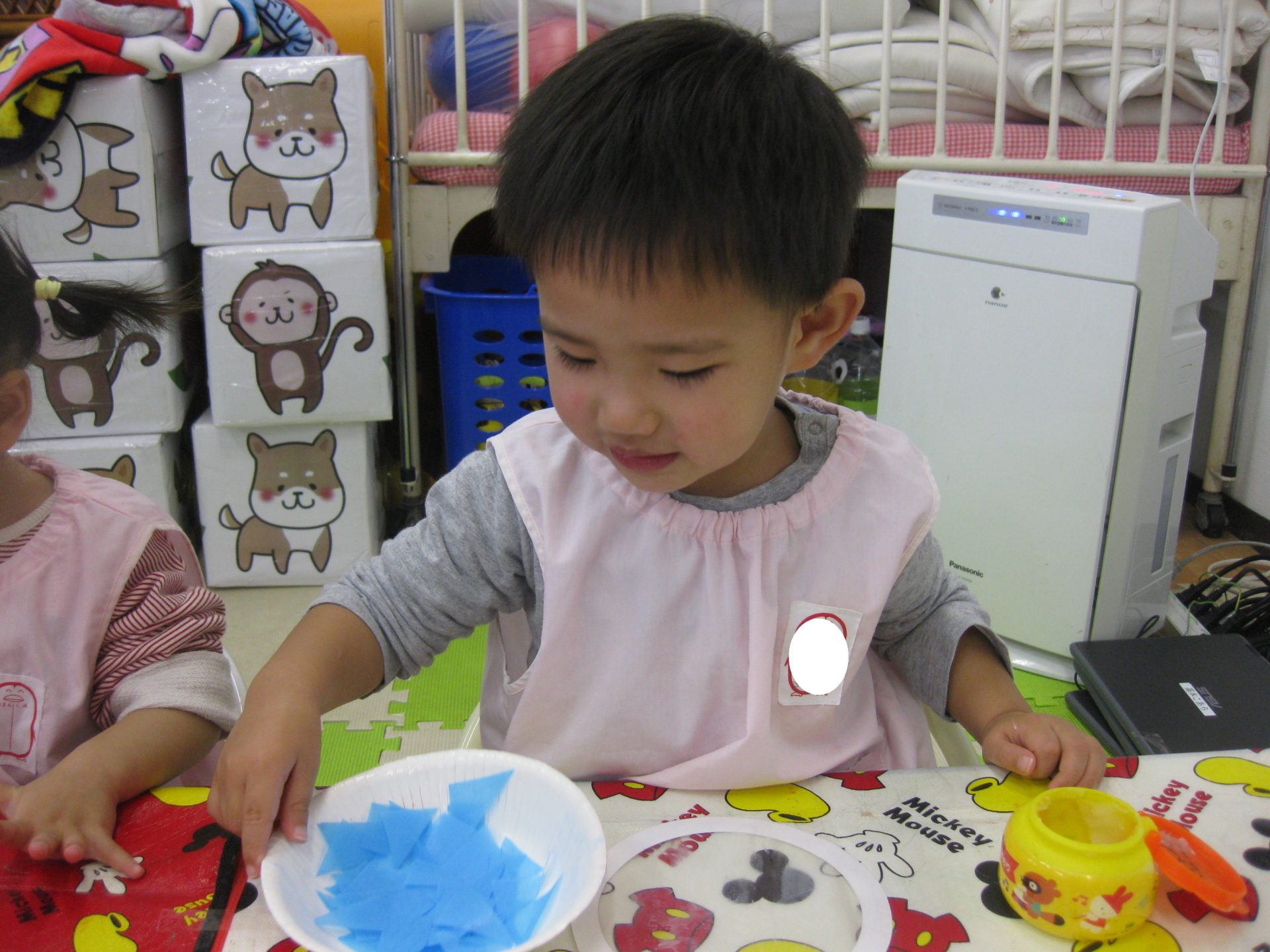 薄くで小さなお花紙は、糊のついた指にくっついてしまいやすかったのですが、苦戦しながらも一生懸命に集中して取り組んでいました✨