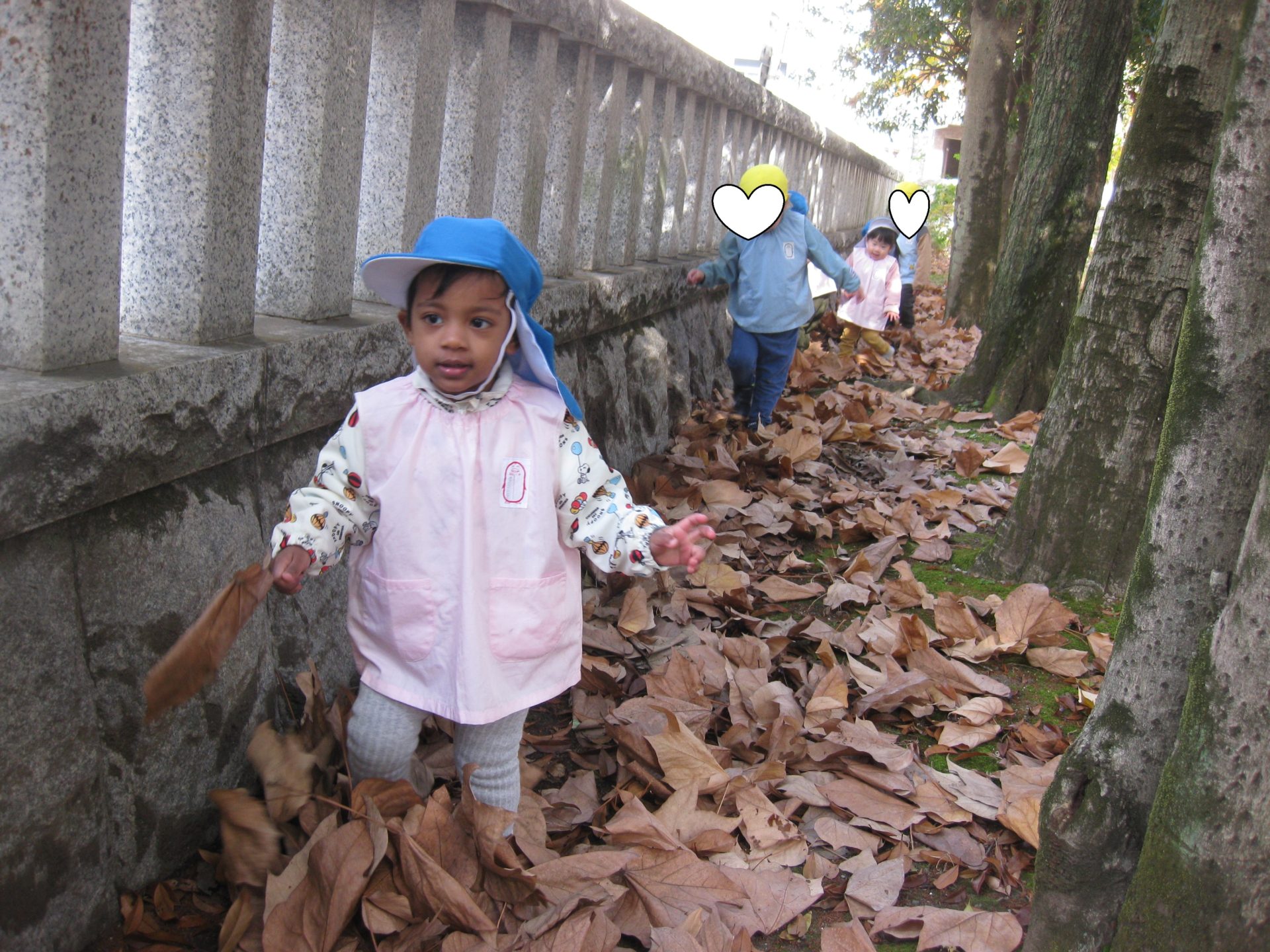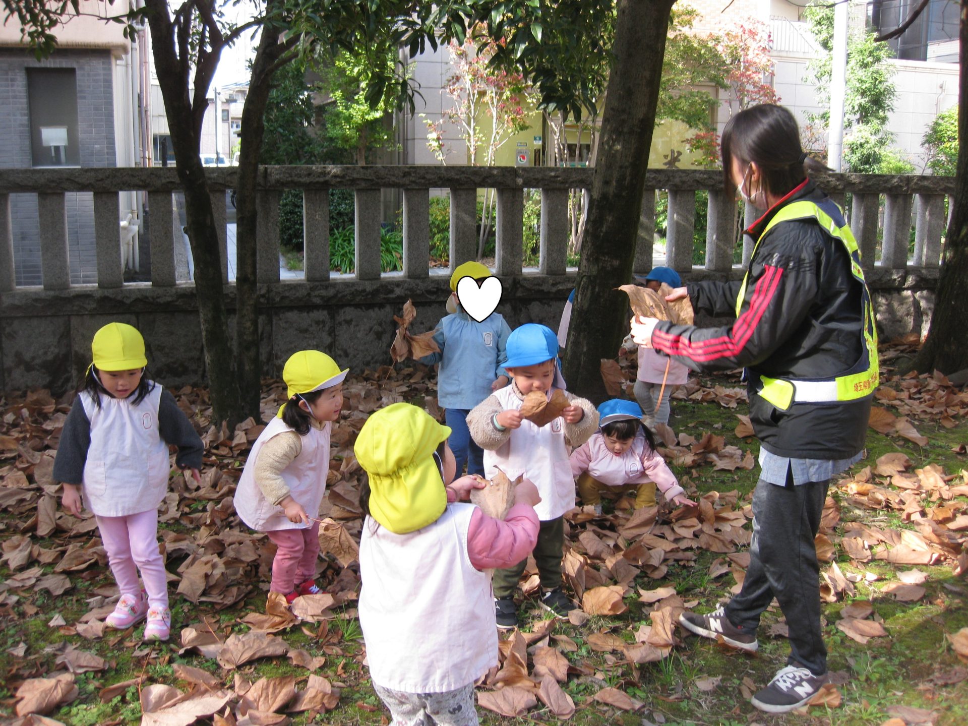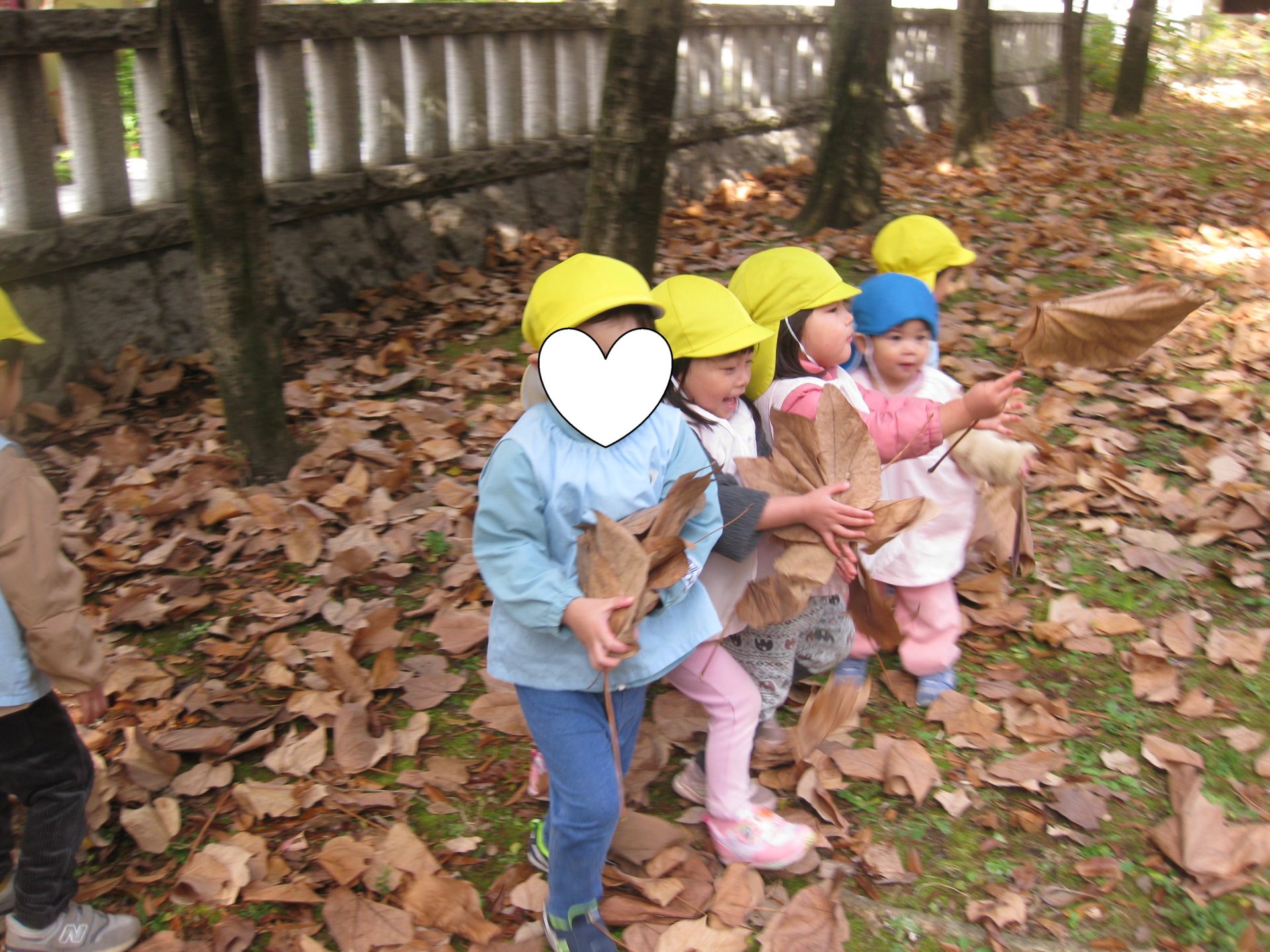 さあ!お久しぶりの神社公園へレッツゴー!!公園には大きな落ち葉がたくさんありました🍂みんな大興奮で拾って大きさを見比べたり、お顔を隠したり、拾い集めたり、シャワーを降らせたり、いろんな遊びを楽しむお友達がたくさんいましたよ😊
