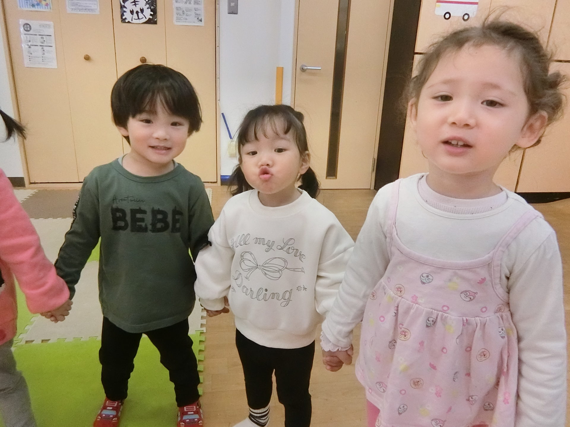 朝の会で仲良く手を繋いで保育園の歌を歌っている様子も
