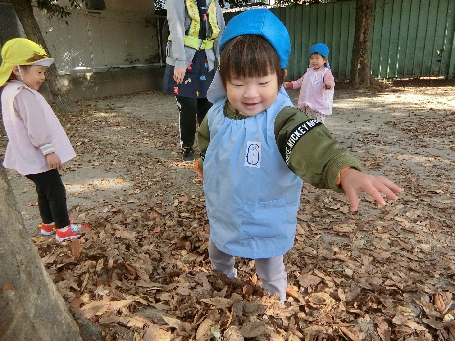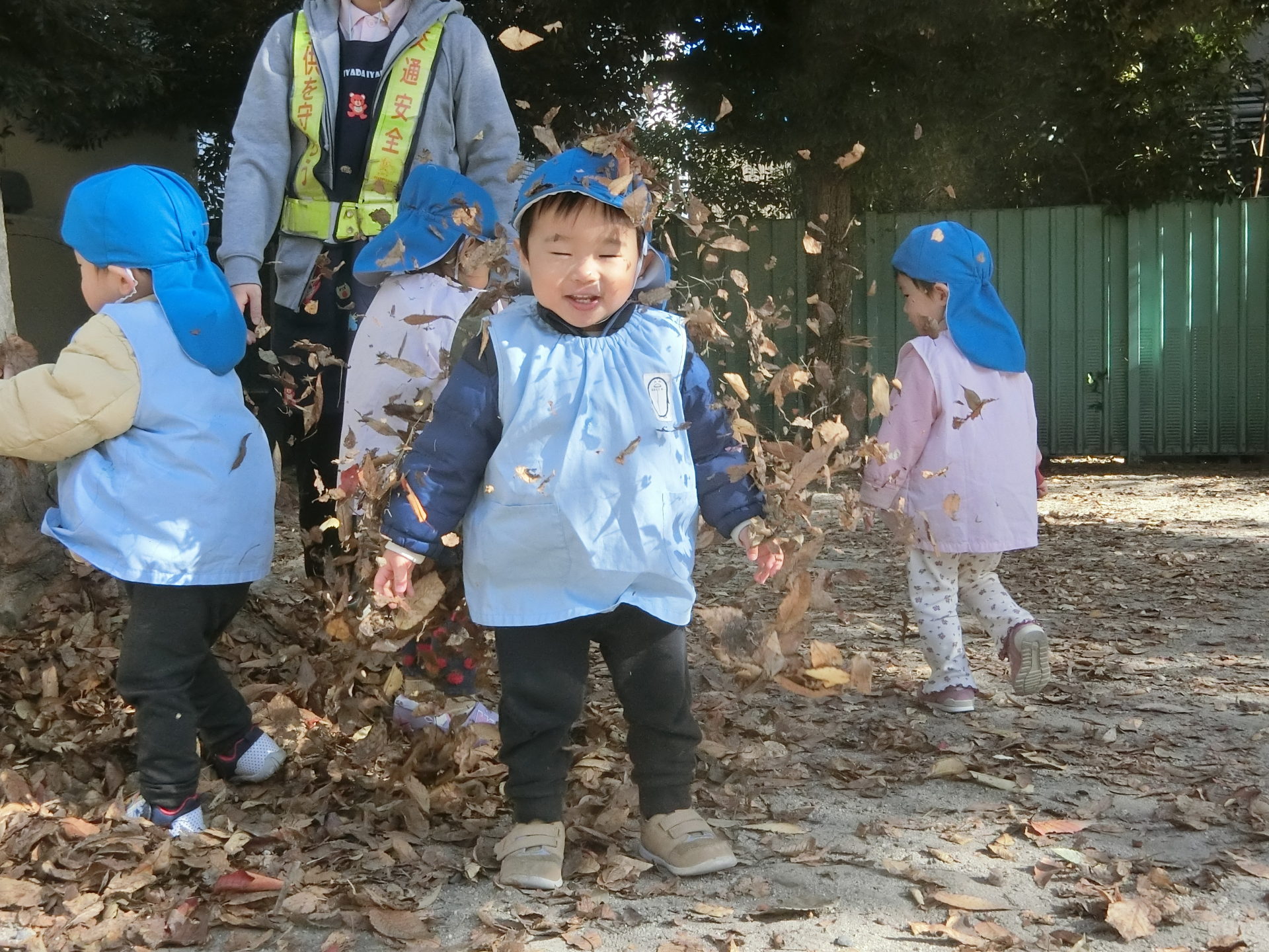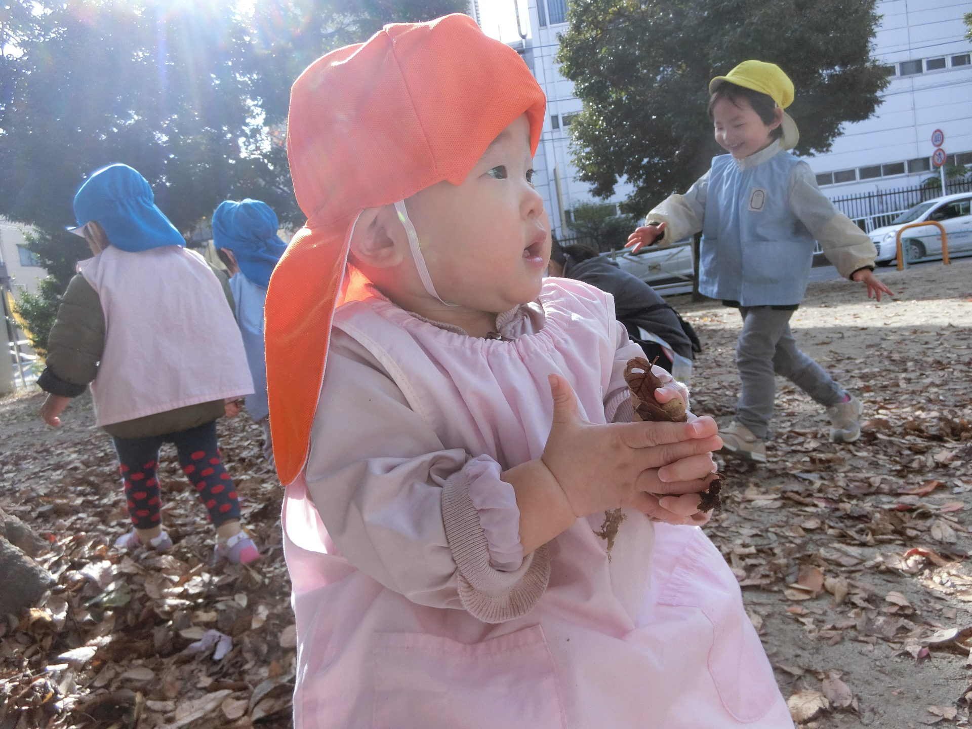その様子を見ていたひよこ組のお友達も小さいお手てで落ち葉を集めて、