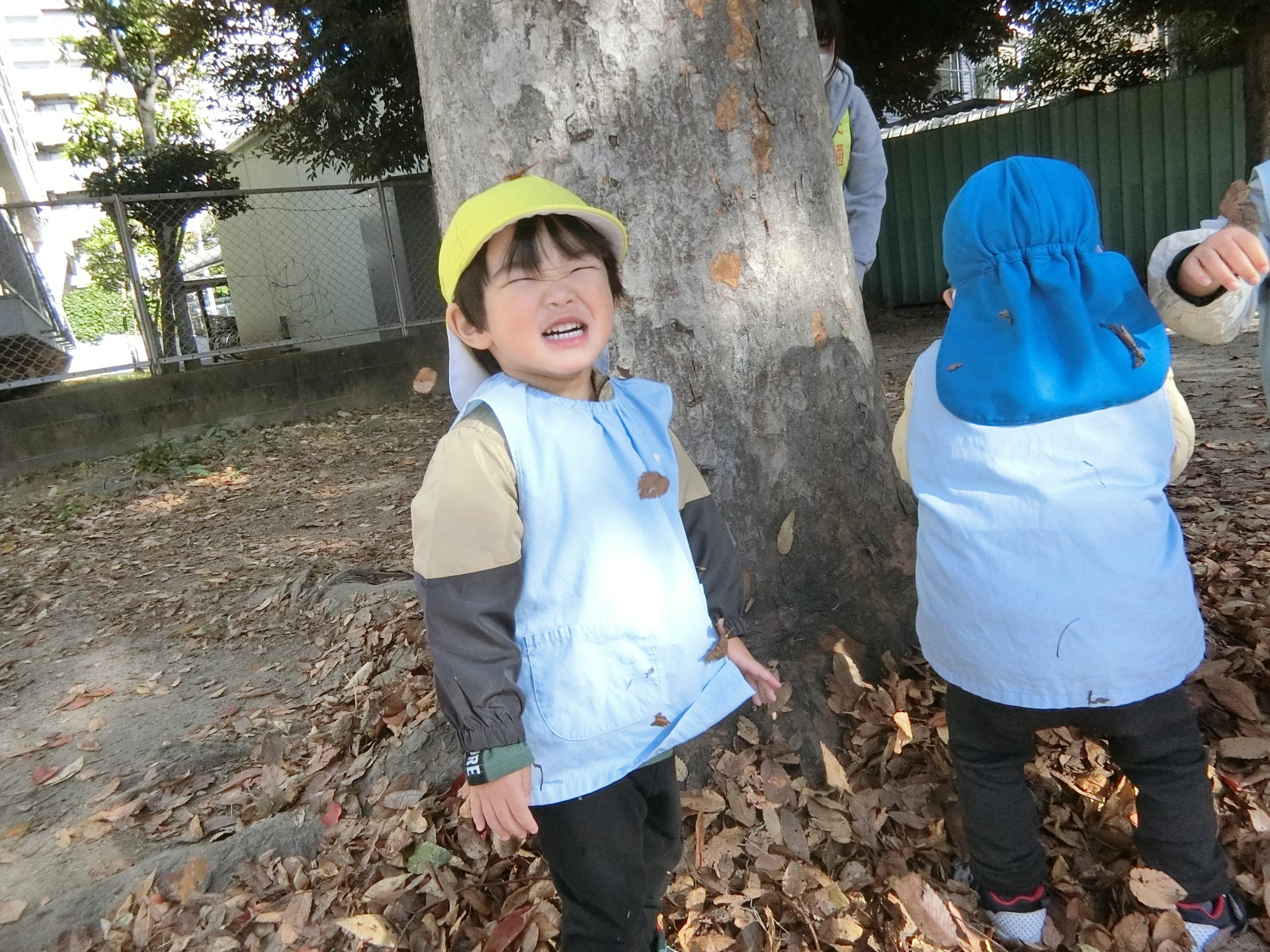 子ども達と先生で落ち葉を降らして遊びました。