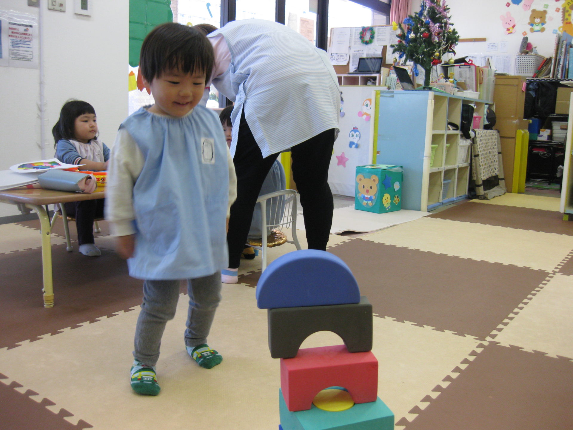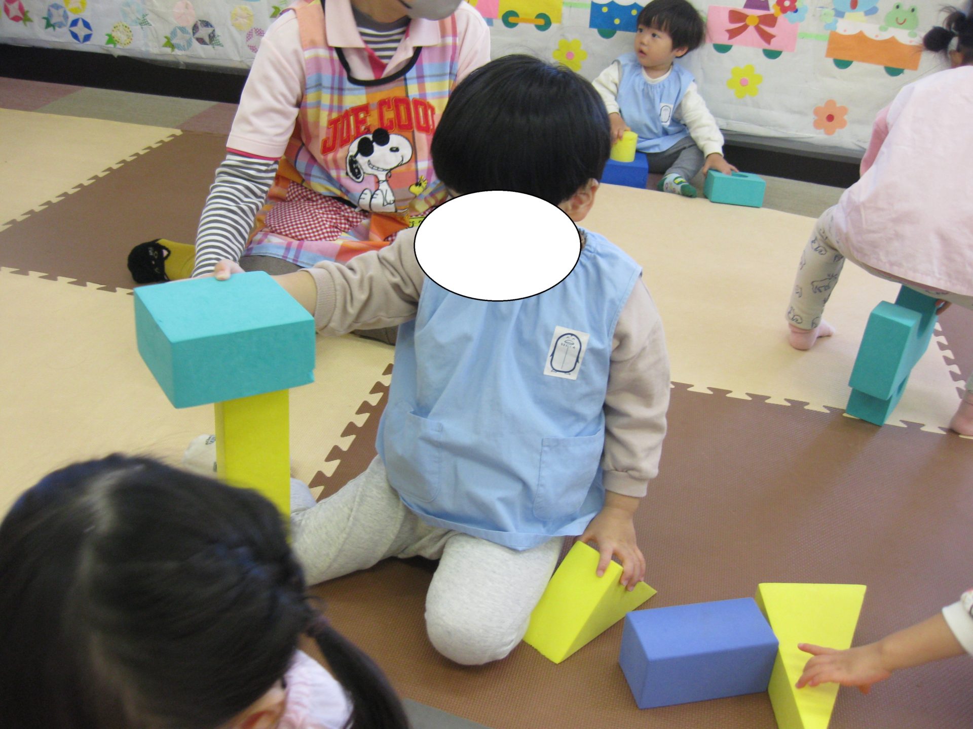お製作を待っている間は、ソフトブロックをして遊びましたよ。バランスよく積み上げられると「すごーい!!」と嬉しそうにしているお友達でした😊