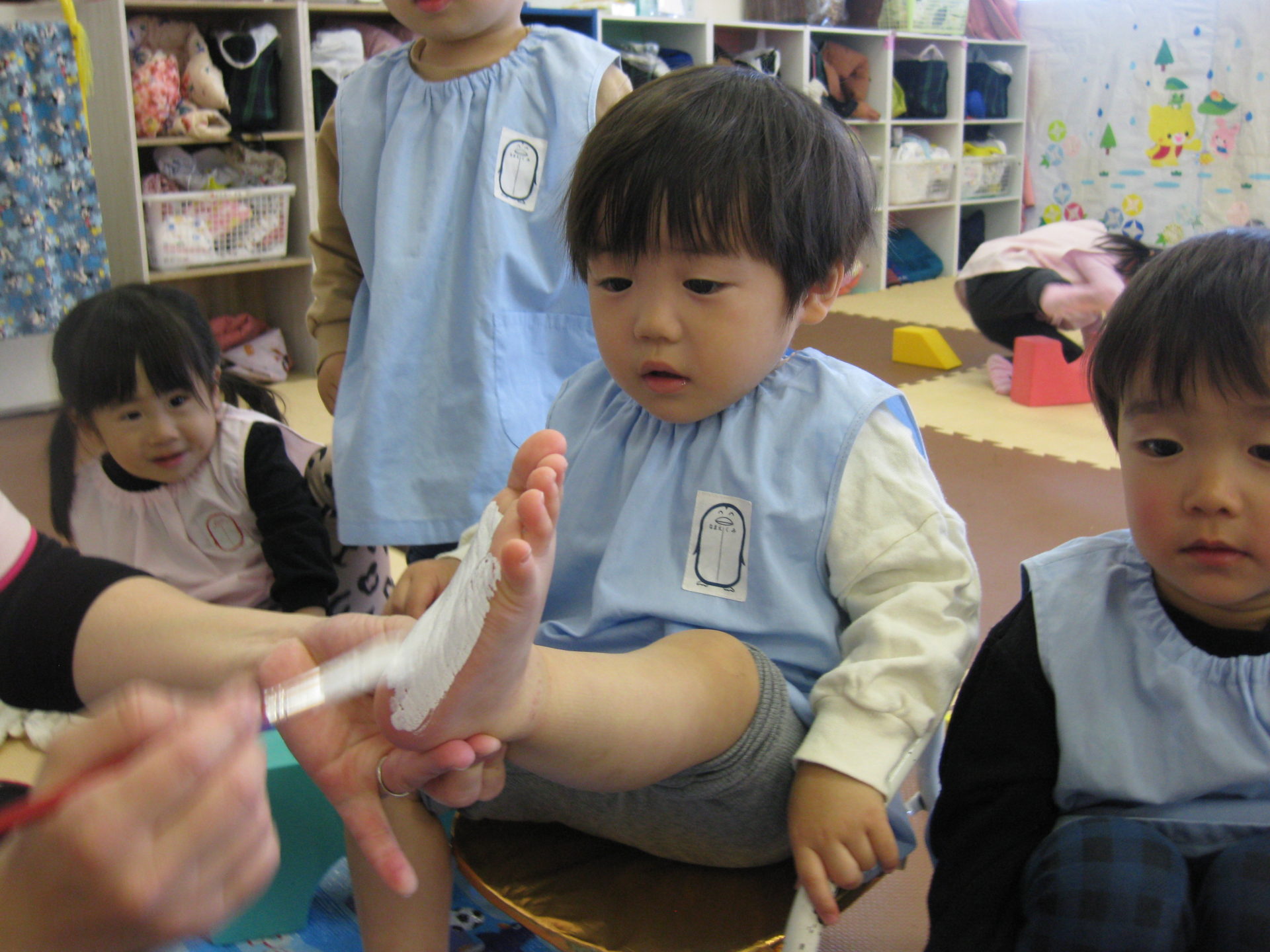 筆の感触がくすぐったそうにしていましたが、我慢をして上手に足形を取ることが出来ました☺