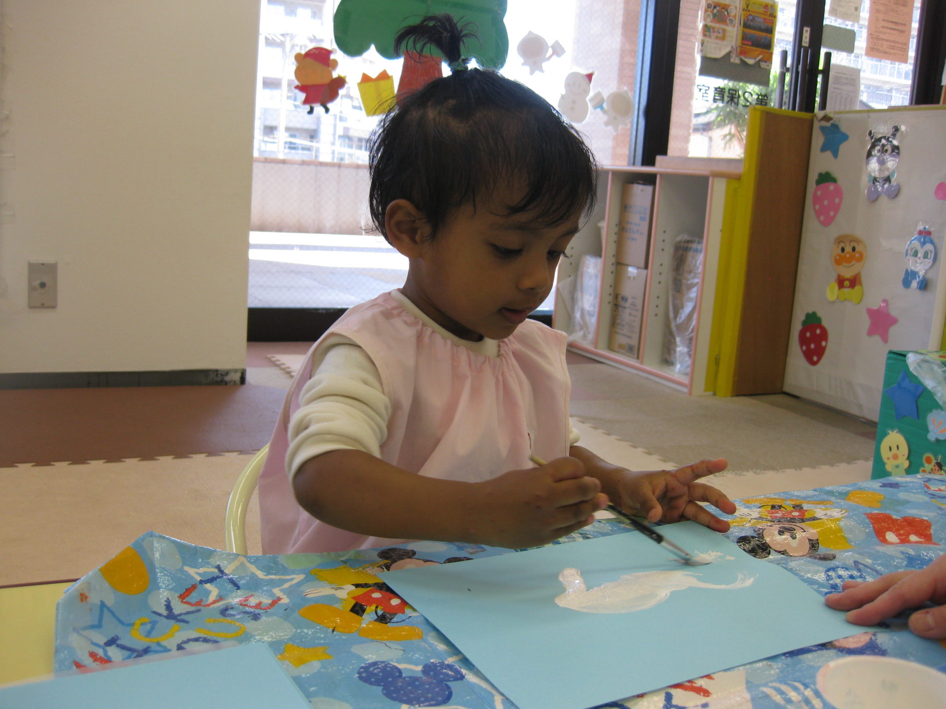 うさぎ組さんは画用紙に絵の具をぬりぬり🎨真剣なお顔で塗っていますね!