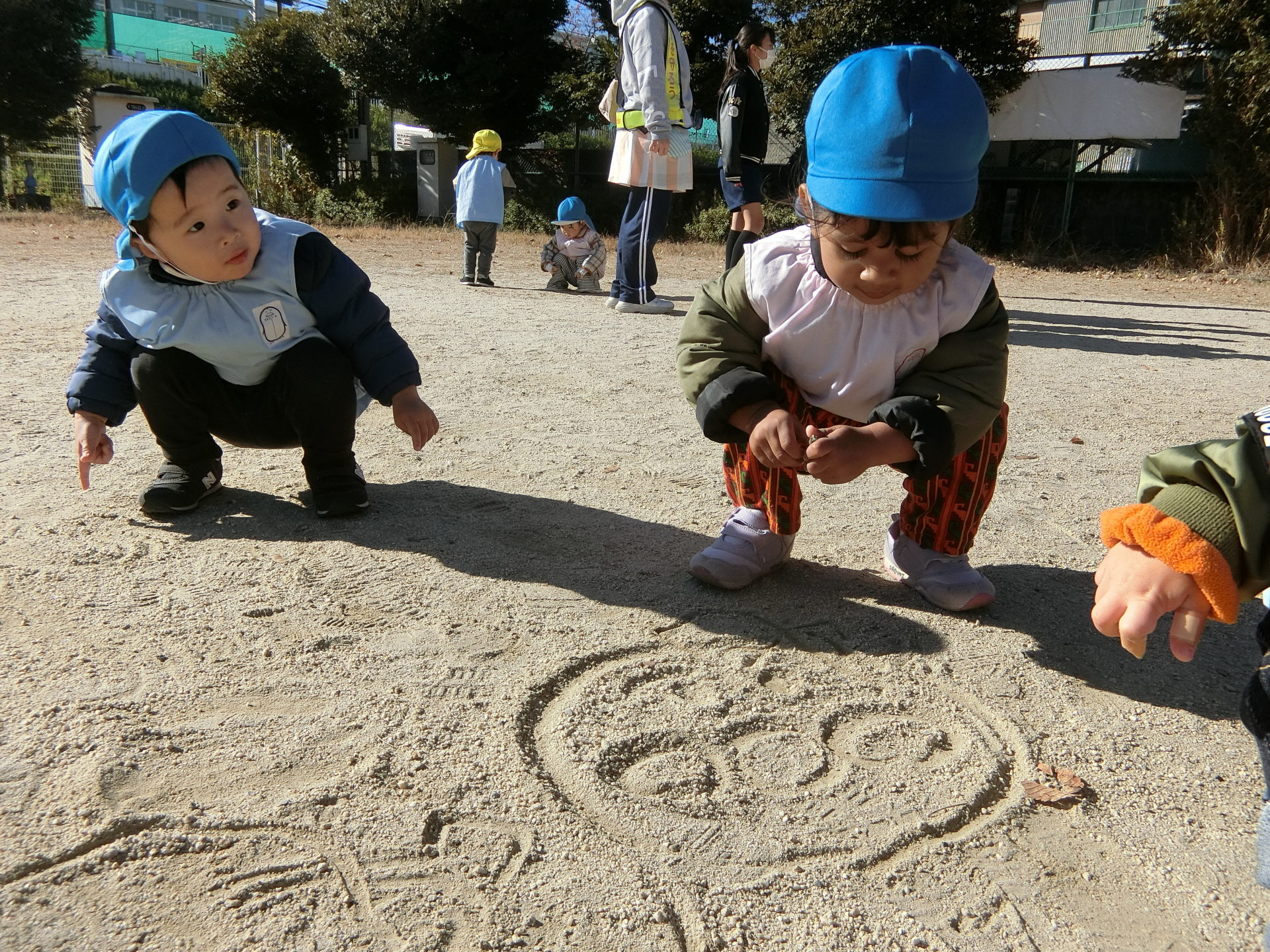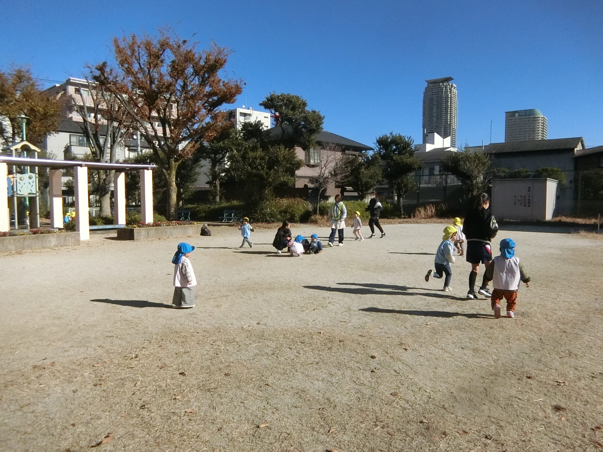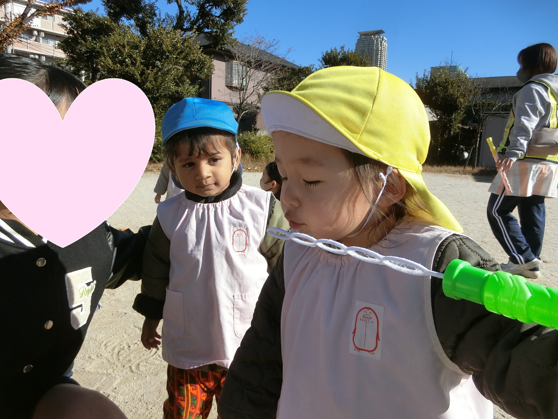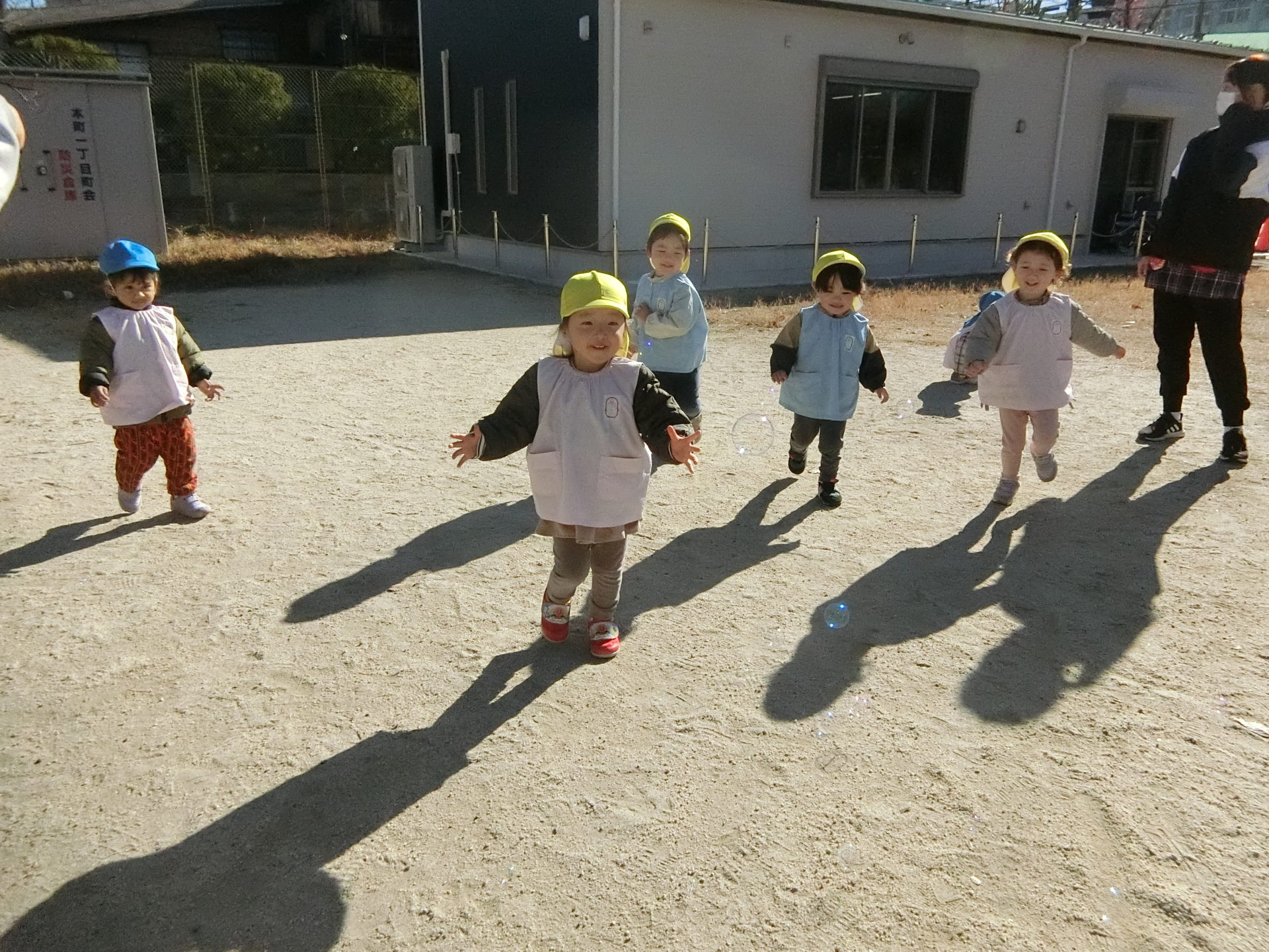 残念ながら遊具は他の保育園のお友達が使っていたので、みんなはグラウンドでかけっこやシャボン玉をして遊びました。