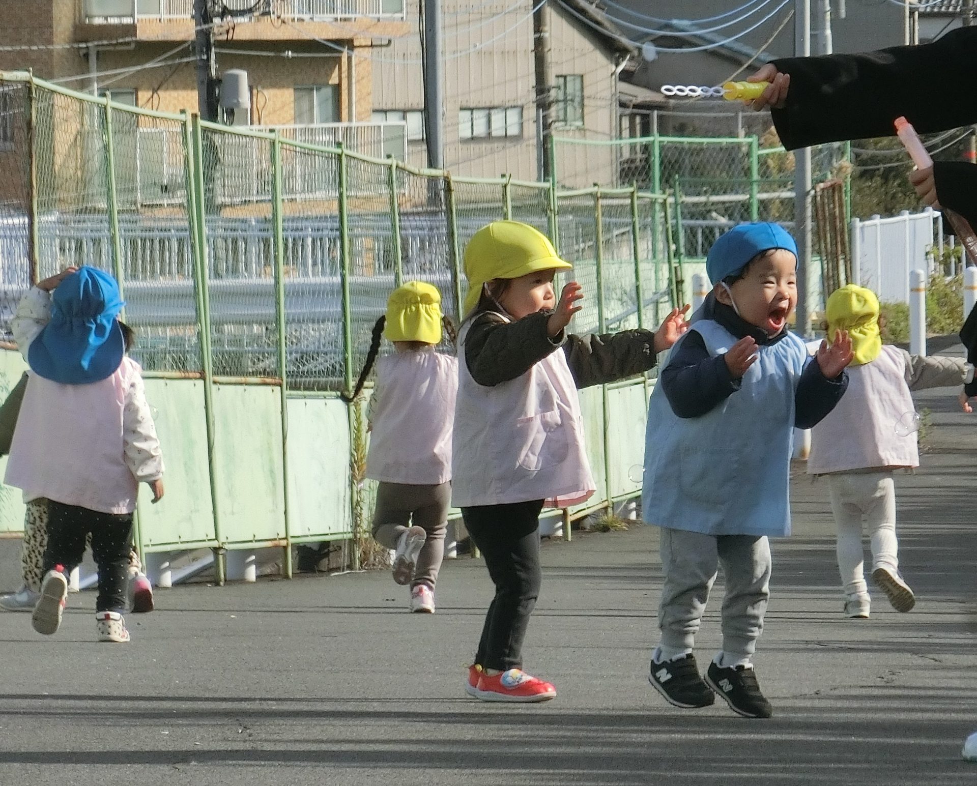 たくさん走ったり、シャボン玉をしたり、お絵描きしたりして陽の当たる場所で楽しみました!