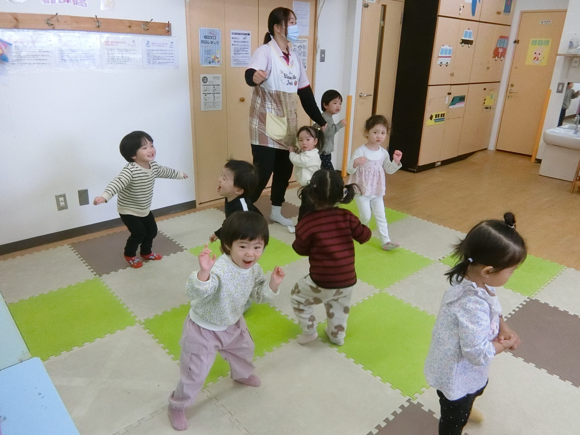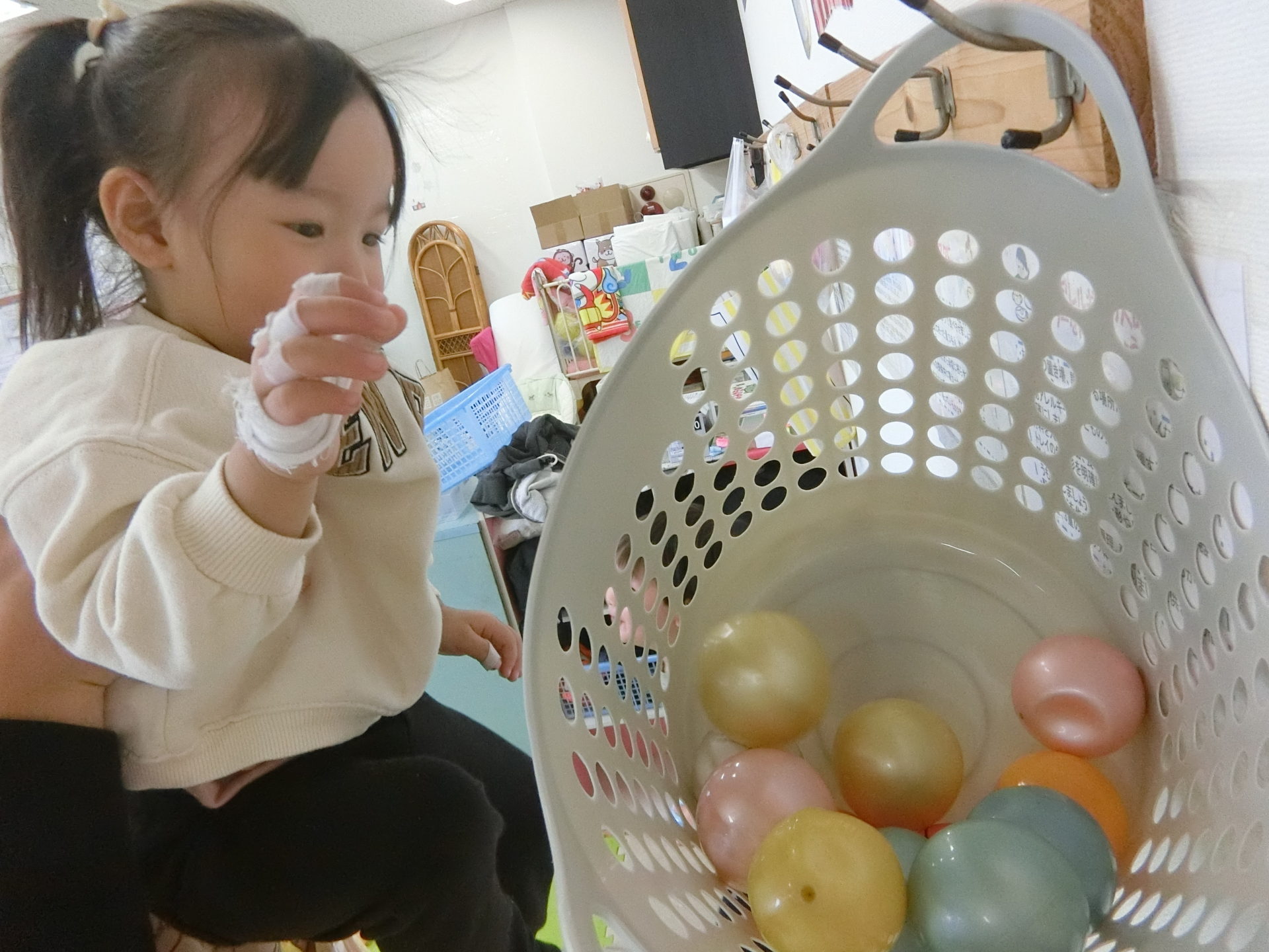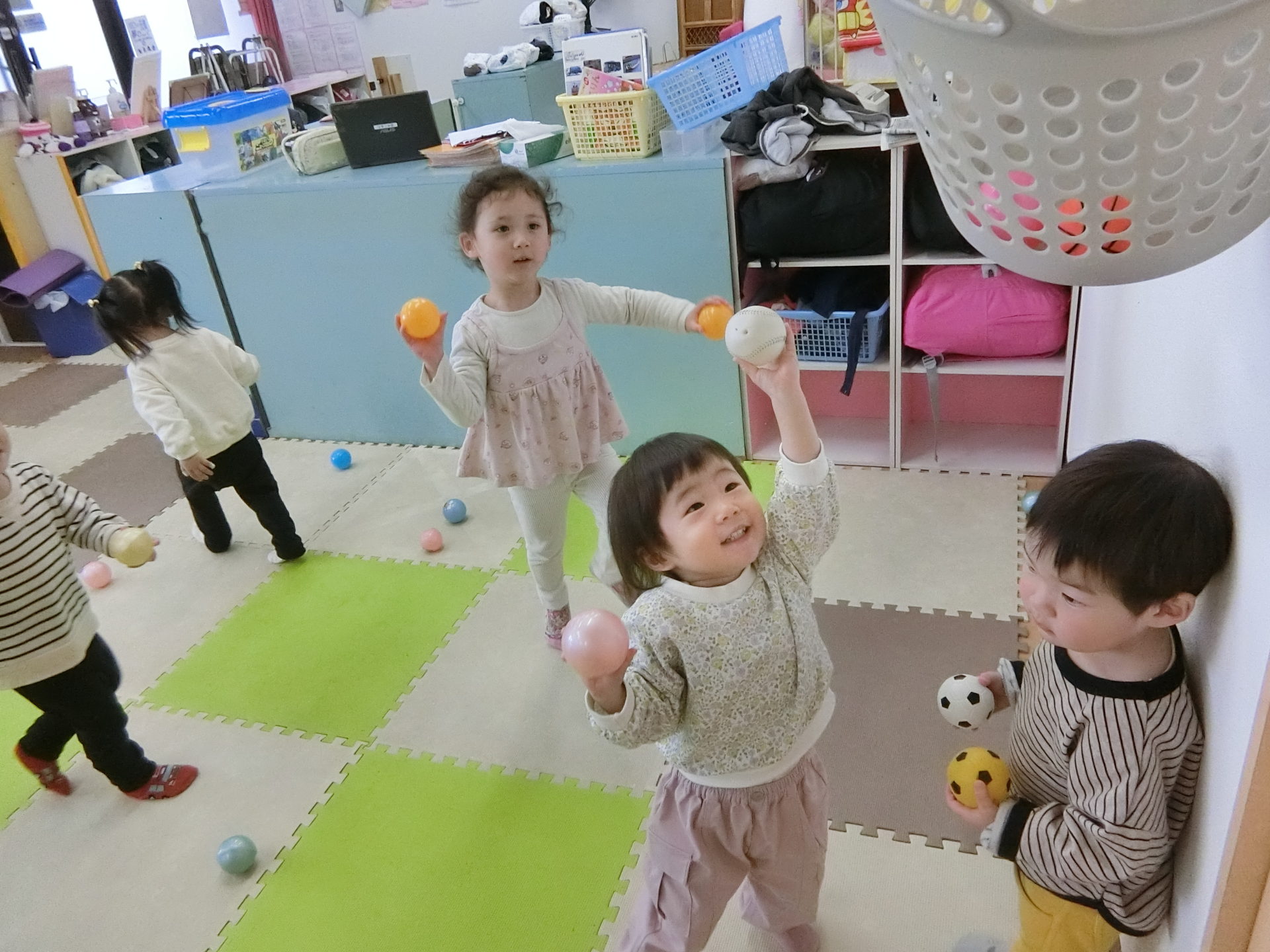 お散歩へ行かずにお部屋でダンスや身体測定やボール遊びをして過ごしました。感染症が流行っていて、お休みのお友達も多いですが、登園したお友達は、元気いっぱいに踊ったり、運動会で使った玉入れのカゴを使って、ボールを頑張ってジャンプして入れたり、先生の抱っこで「シュート!」したりと楽しんでやっていましたよ😊