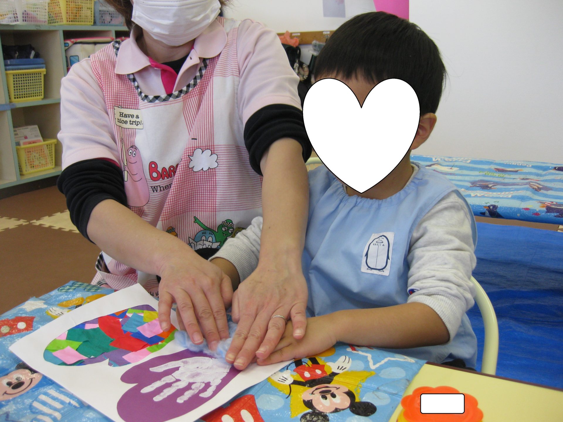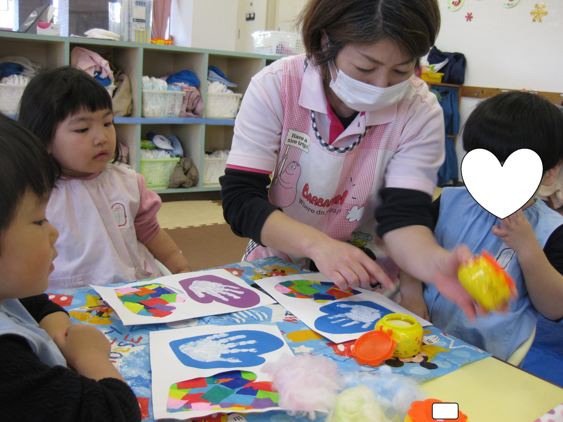こあら組さんは最後の仕上げです!色の付いた綿を選び、糊を塗った場所にペタっと貼り付けました🤗保育者のお話をよく聞いて貼ることが出来ました✨さすがこあら組さんですね⭐