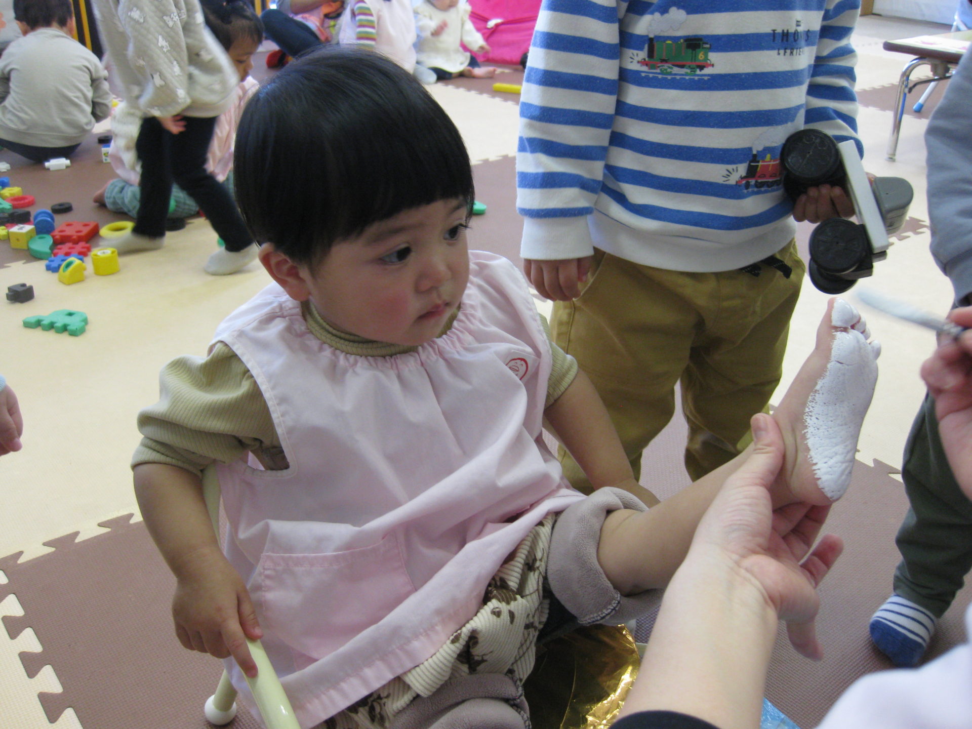 うさぎ組さんは足形をペッタン👣筆の感触に戸惑いの表情です( *´艸`)可愛らしい足形が取れましたよ🎵どんな作品に仕上がるのか楽しみですね💖