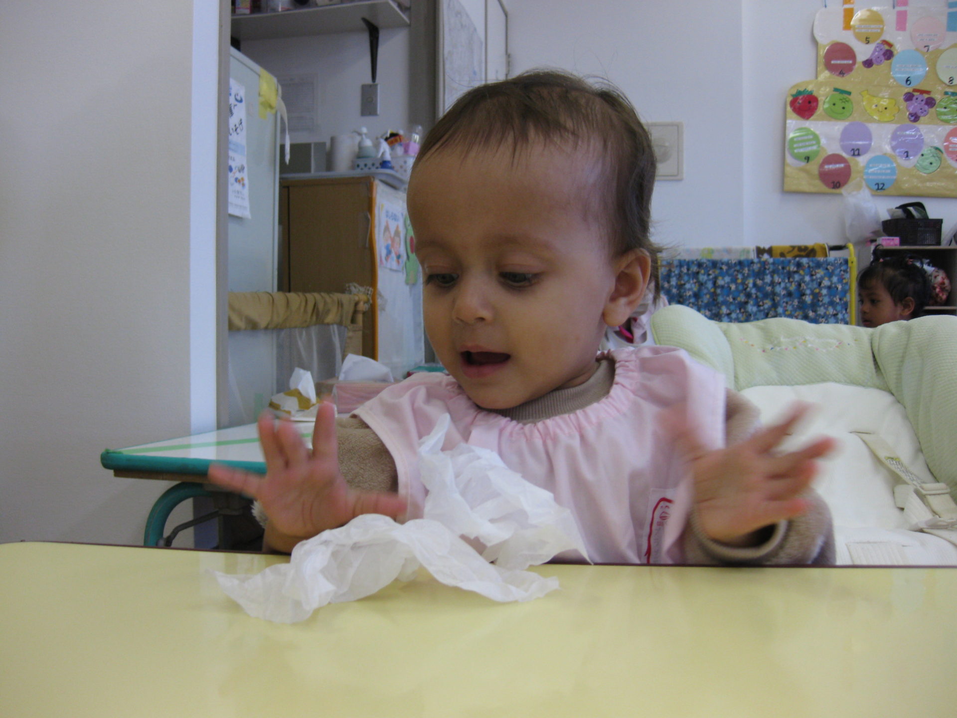 ひよこ組のお友達はお花紙をクシュクシュ🌸上手に丸められたかな?可愛い表情ですね😘