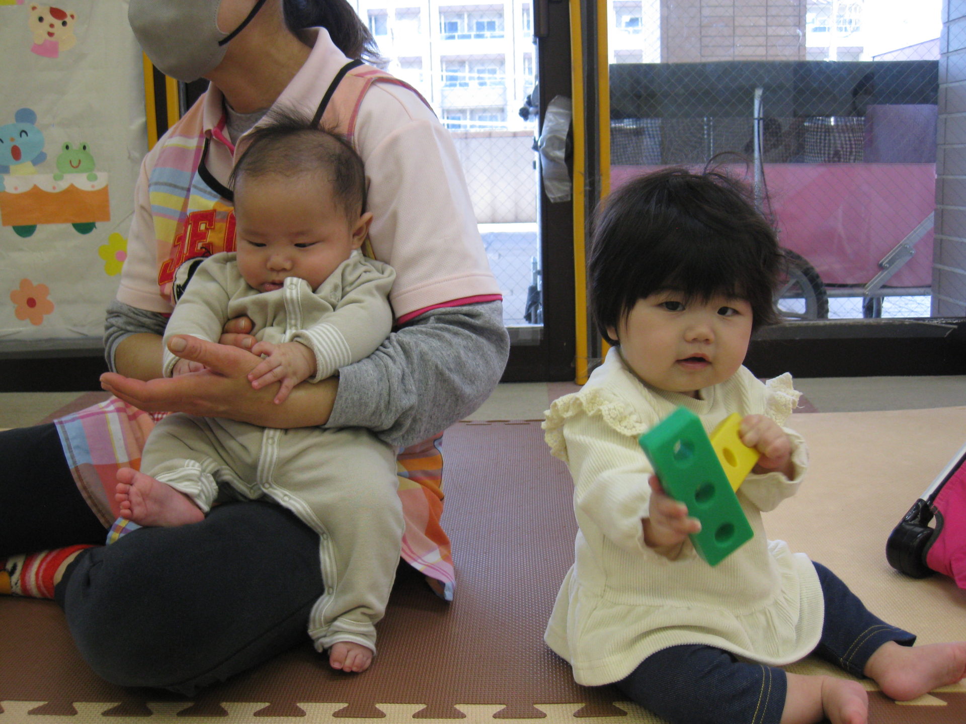 お製作が終わったお友達や待っているお友達はブロックで遊びましたよ🤩ひよこ組さんもブロックをフリフリ~😍ニコニコで遊んでいましたよ!
