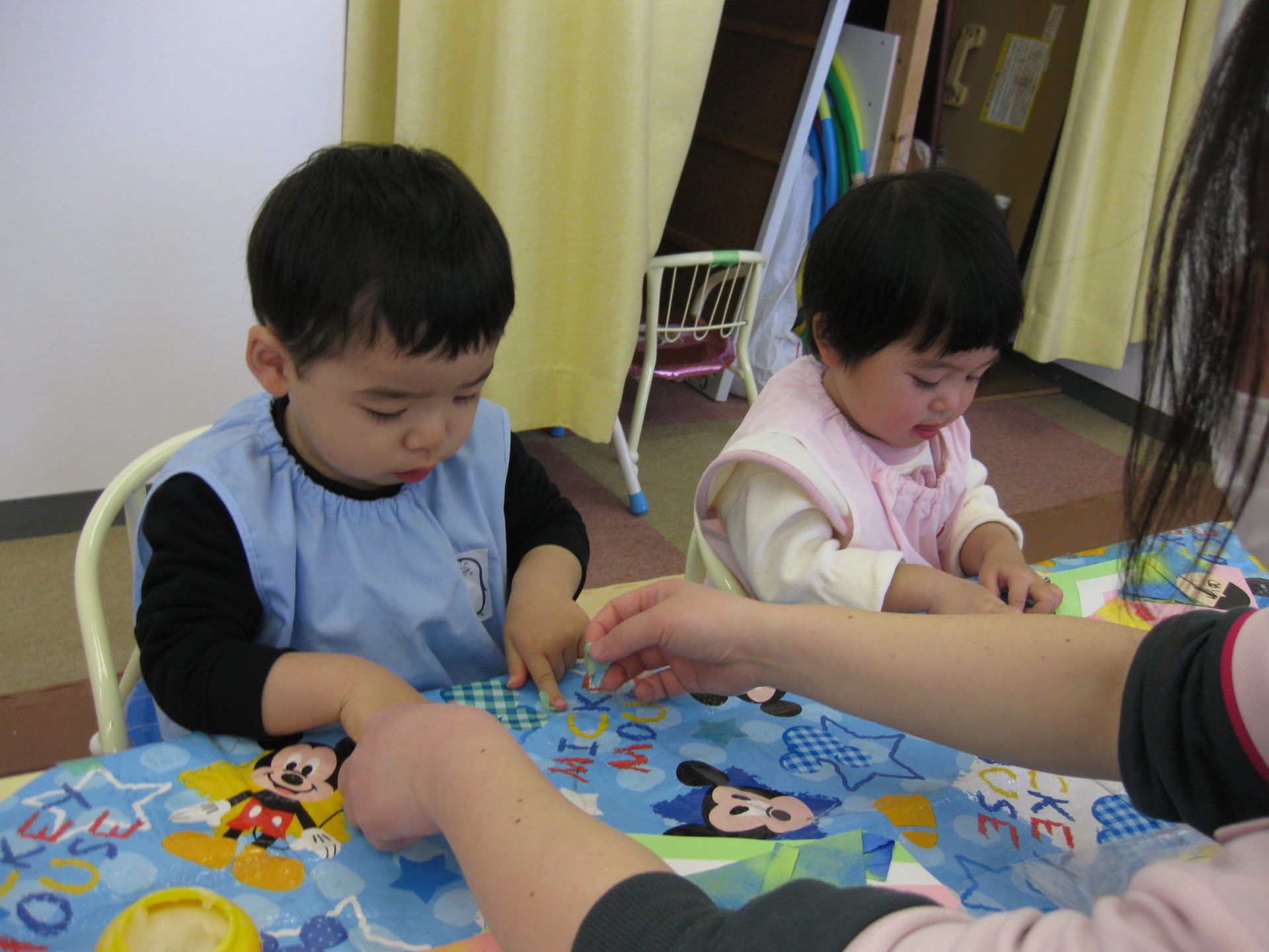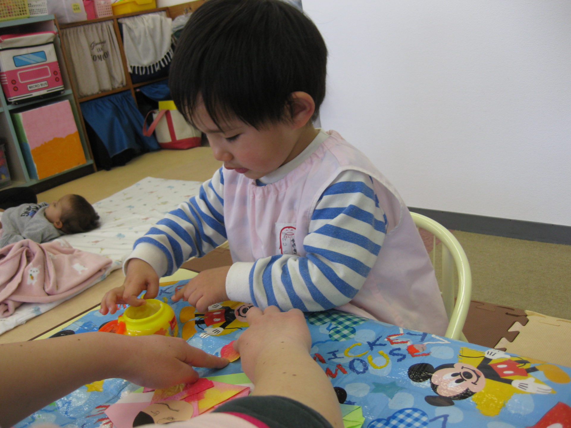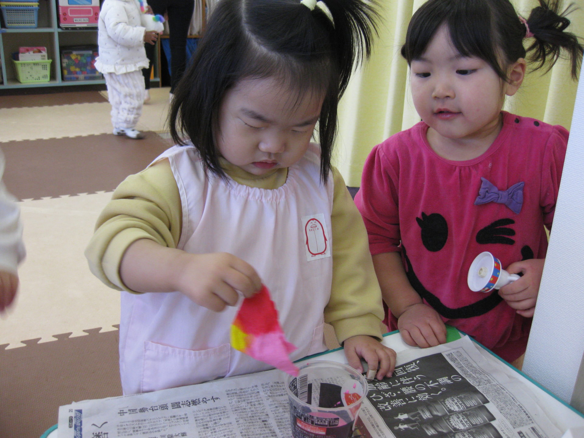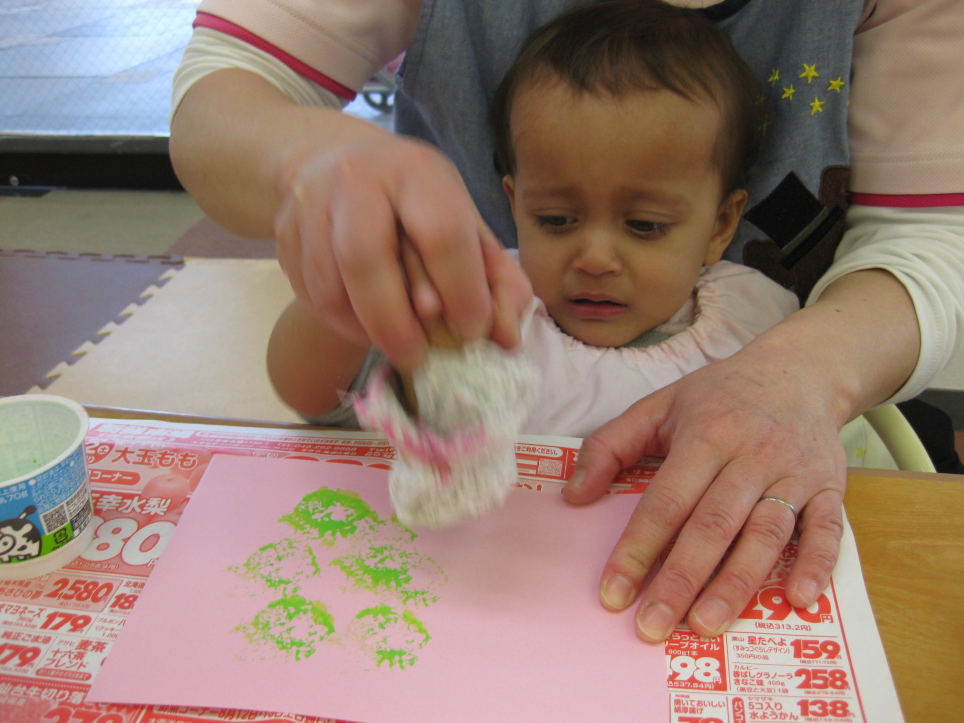 ひよこ組さんはタンポでポンポンと画用紙に色づけをしましたよ🤗慣れない作業に戸惑っていましたが、上手に色を付けてくれました✨何とも言えない表情がまた可愛いです💖