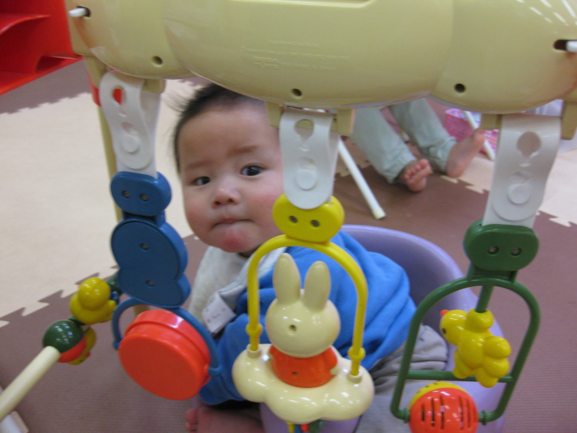 ミルクを飲んでお腹いっぱいひよこ組の小さなお友達。ベビージムからひょっこりと可愛いお顔を見せてくれました😍