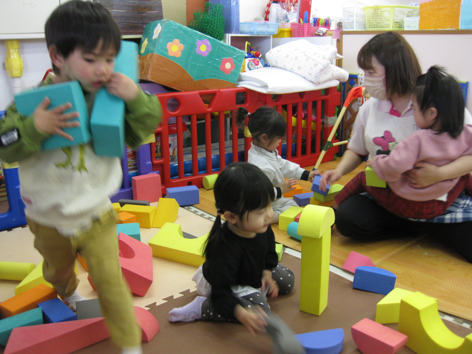 うさぎ組さんとひよこ組さんでソフトブロックで遊んで待っていました😊