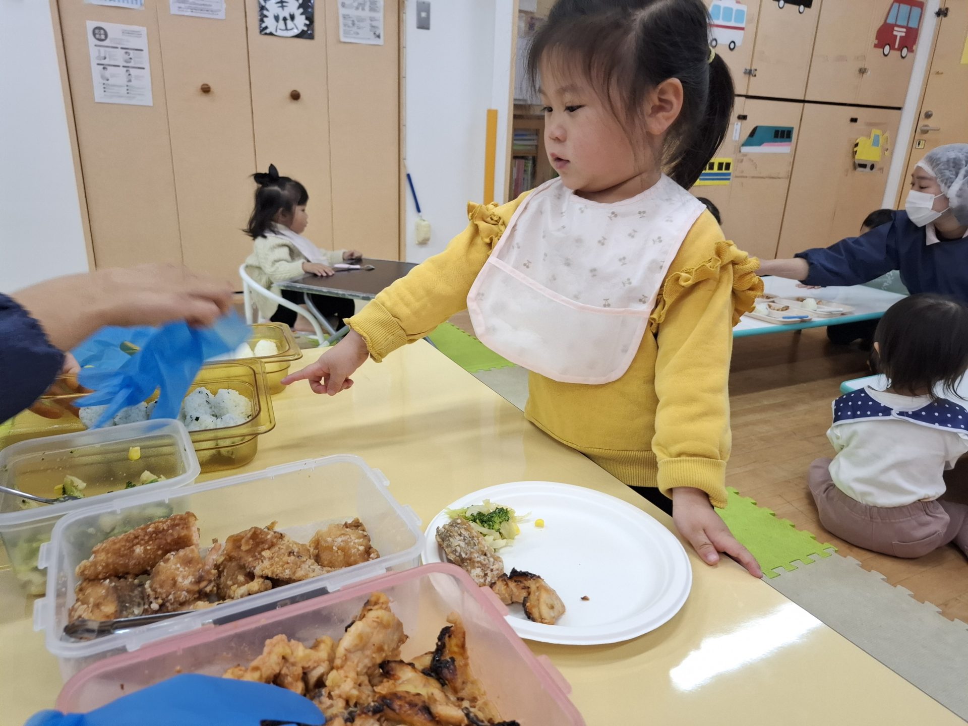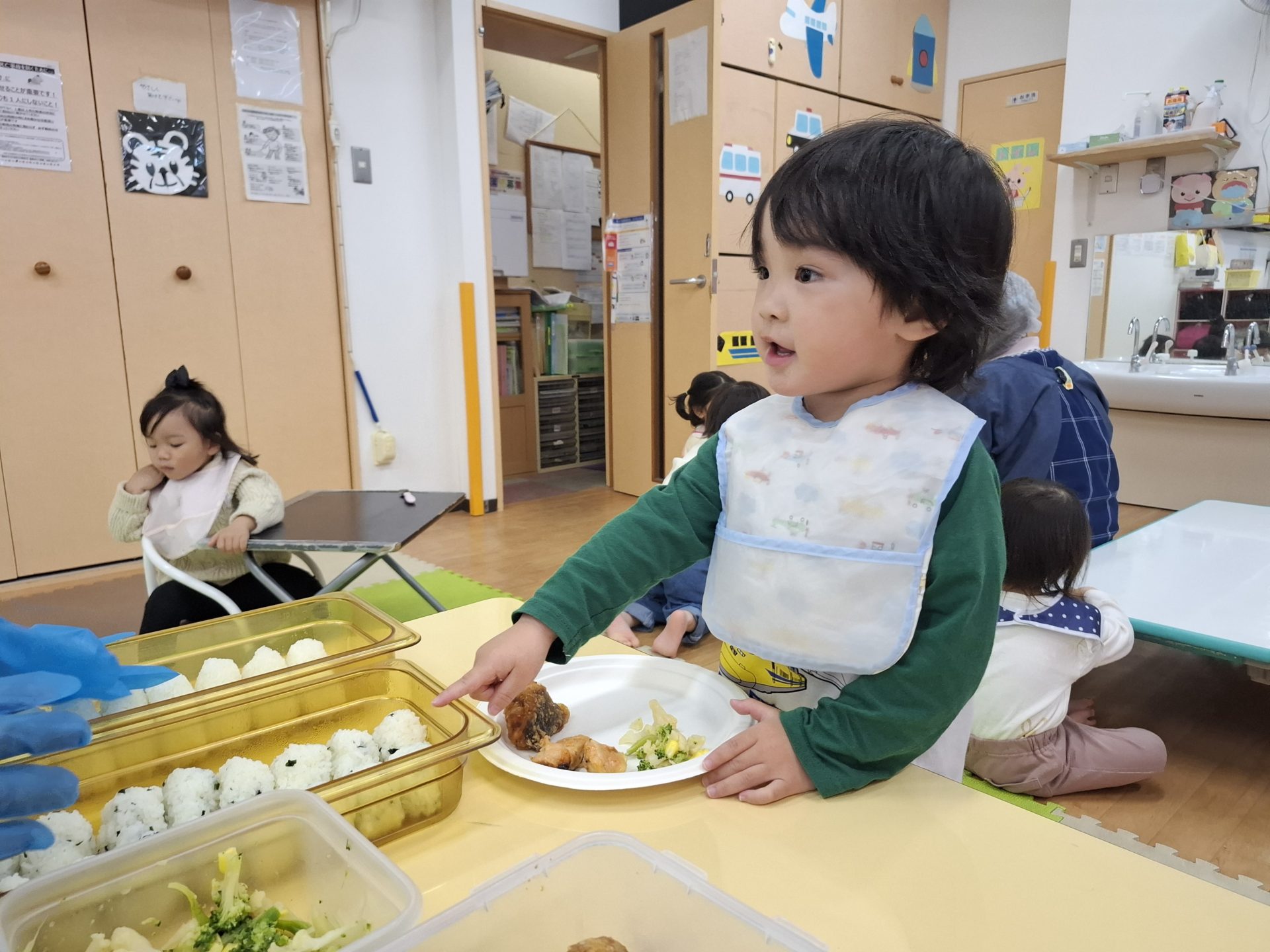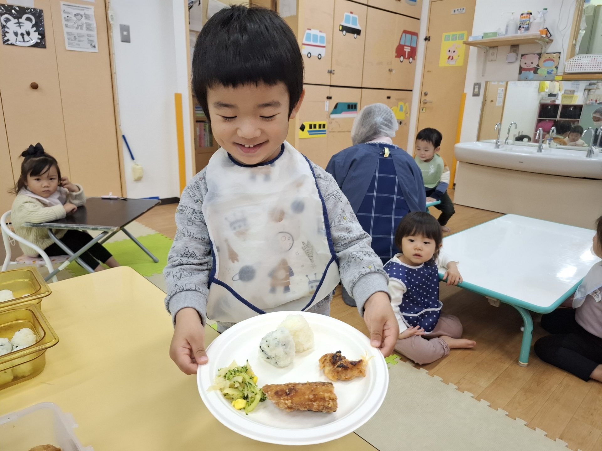 先生が「お魚とお肉とか、好きな物選んで良いんだよ」と言いながら今日のお給食を近くまで見せに来ると、「良いにおーい!」「おいしそー!」と、みんなとっても楽しみにしてくれているようでした!
