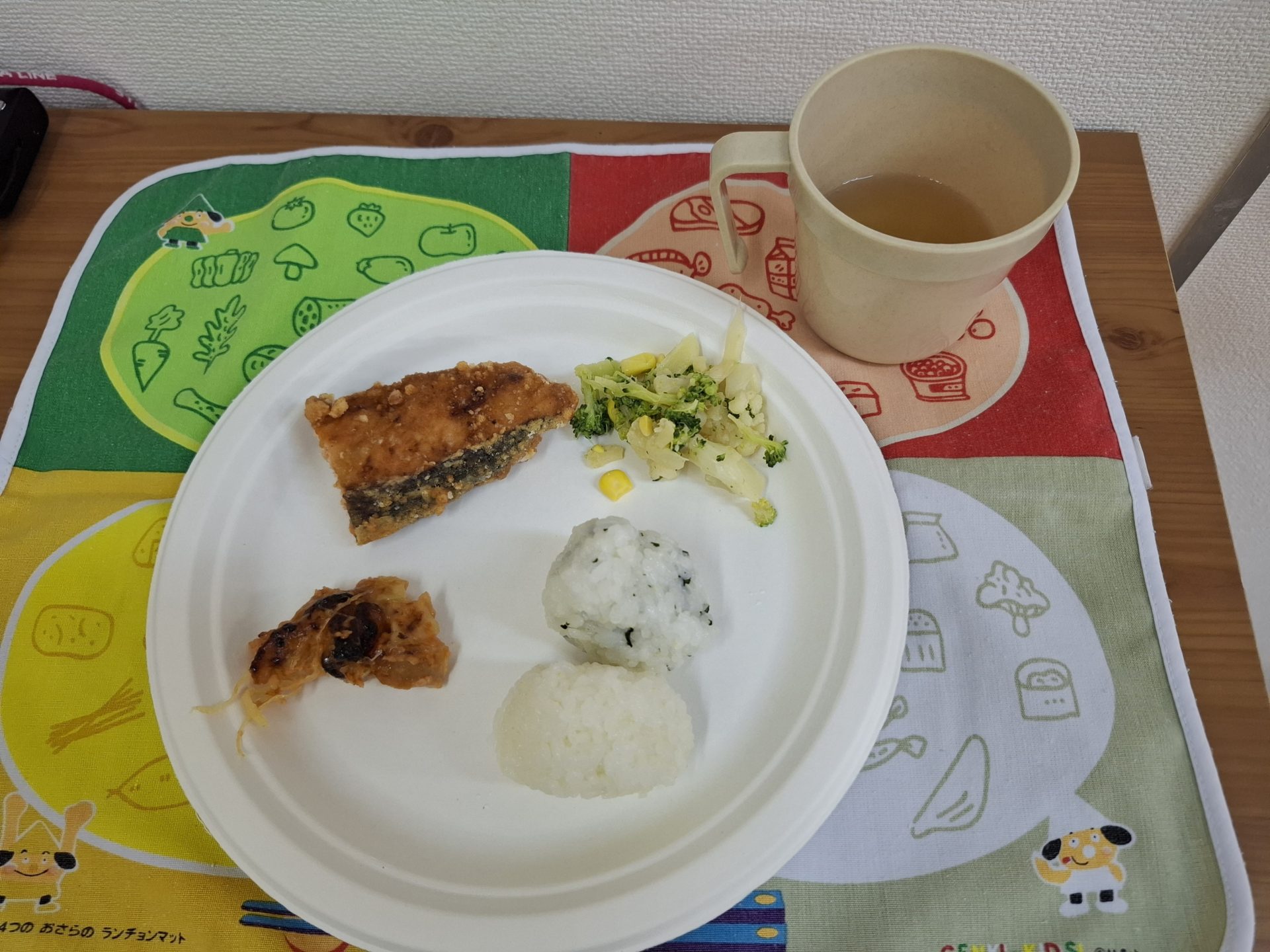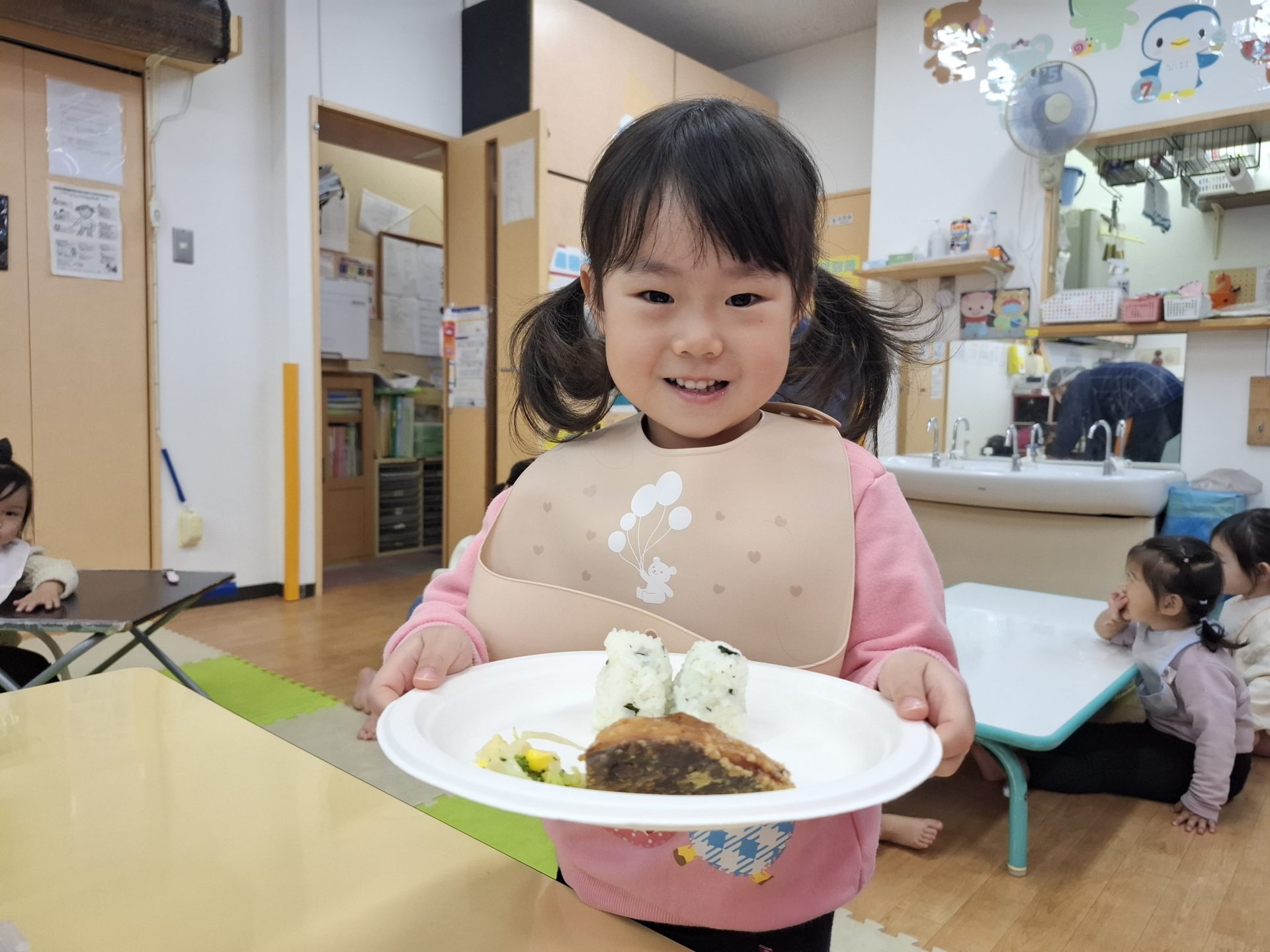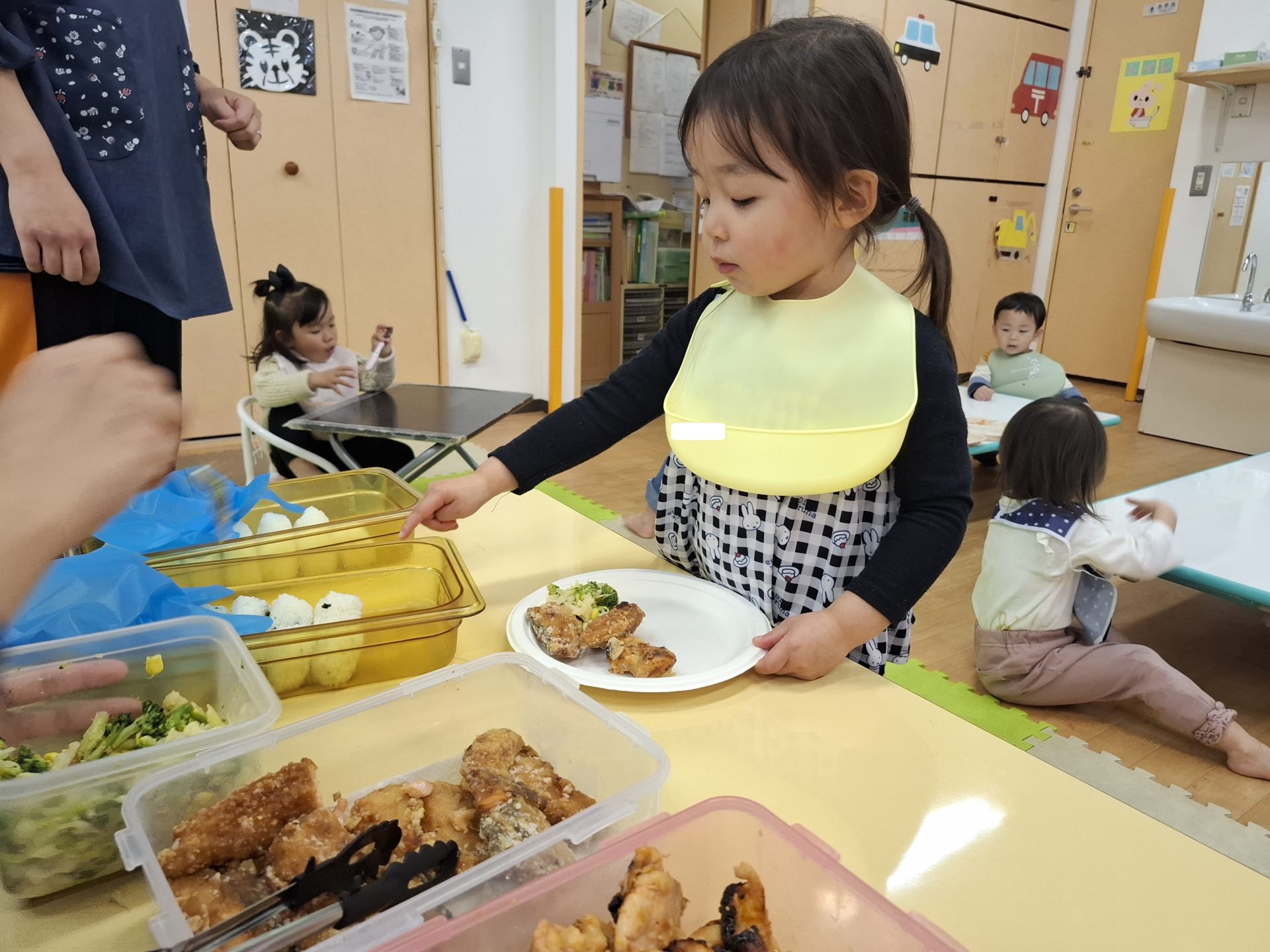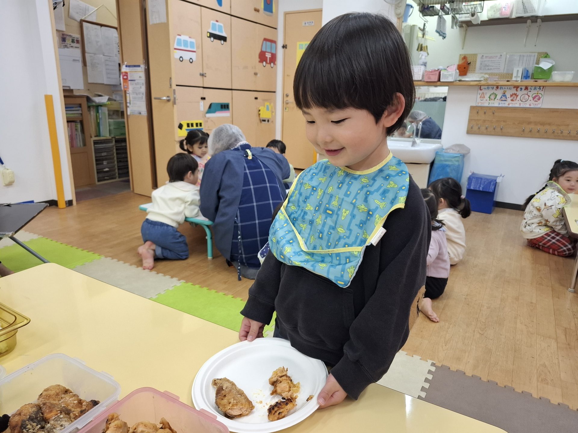 先生が「お魚とお肉とか、好きな物選んで良いんだよ」と言いながら今日のお給食を近くまで見せに来ると、「良いにおーい!」「おいしそー!」と、みんなとっても楽しみにしてくれているようでした!