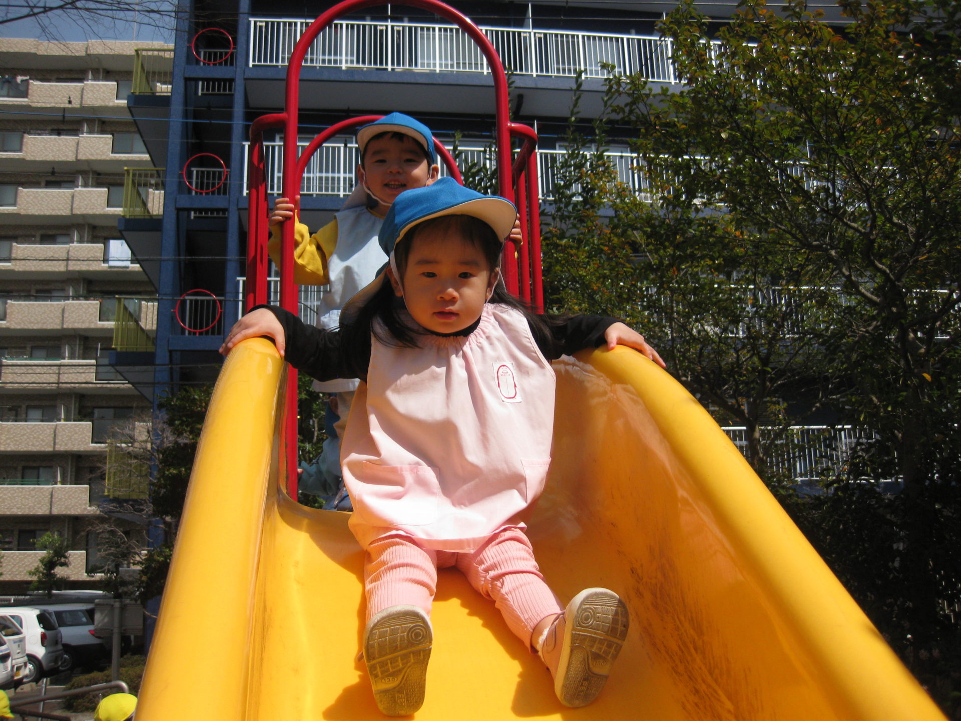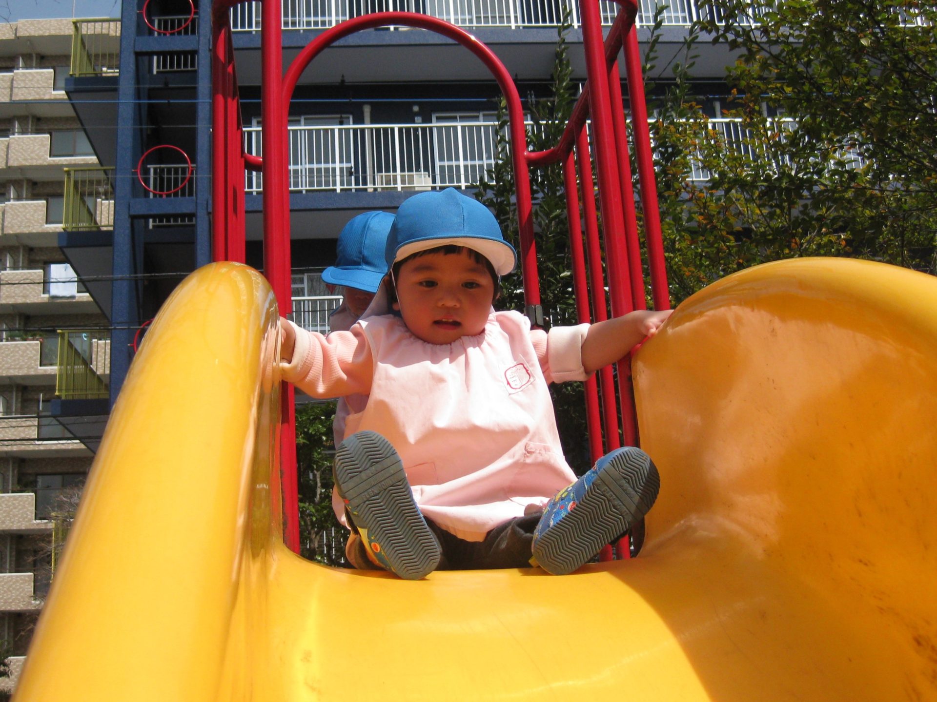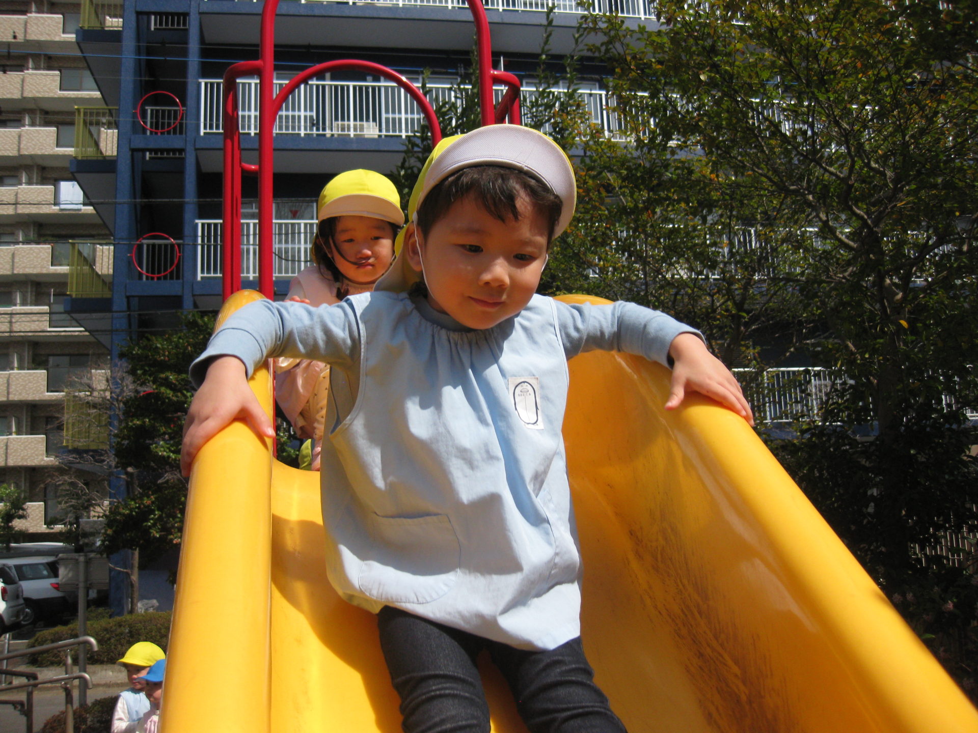 前のお友達が滑り台から降りるまで、早く滑りたい気持ちを抑えて待っている様子が可愛らしかったです💕