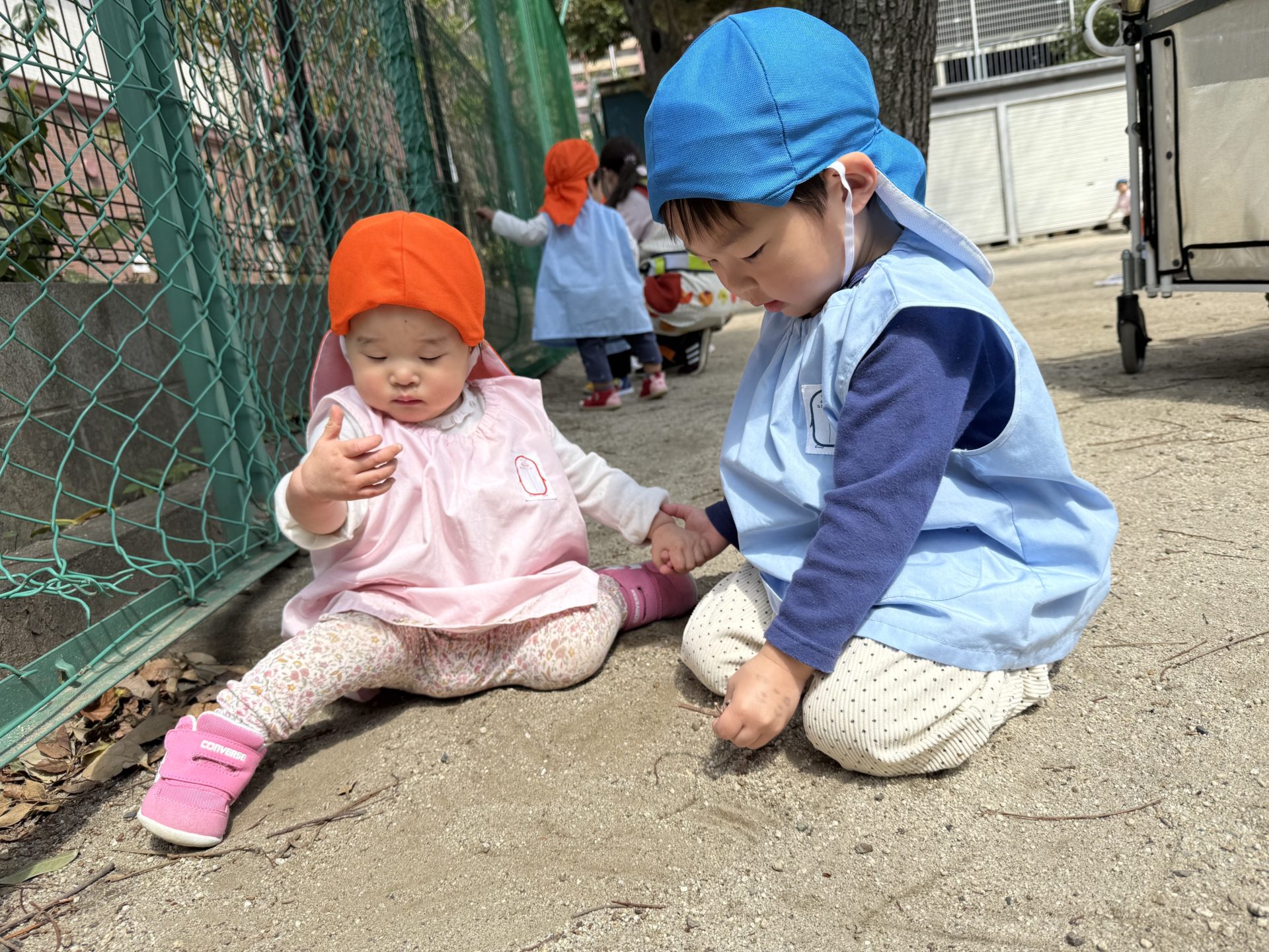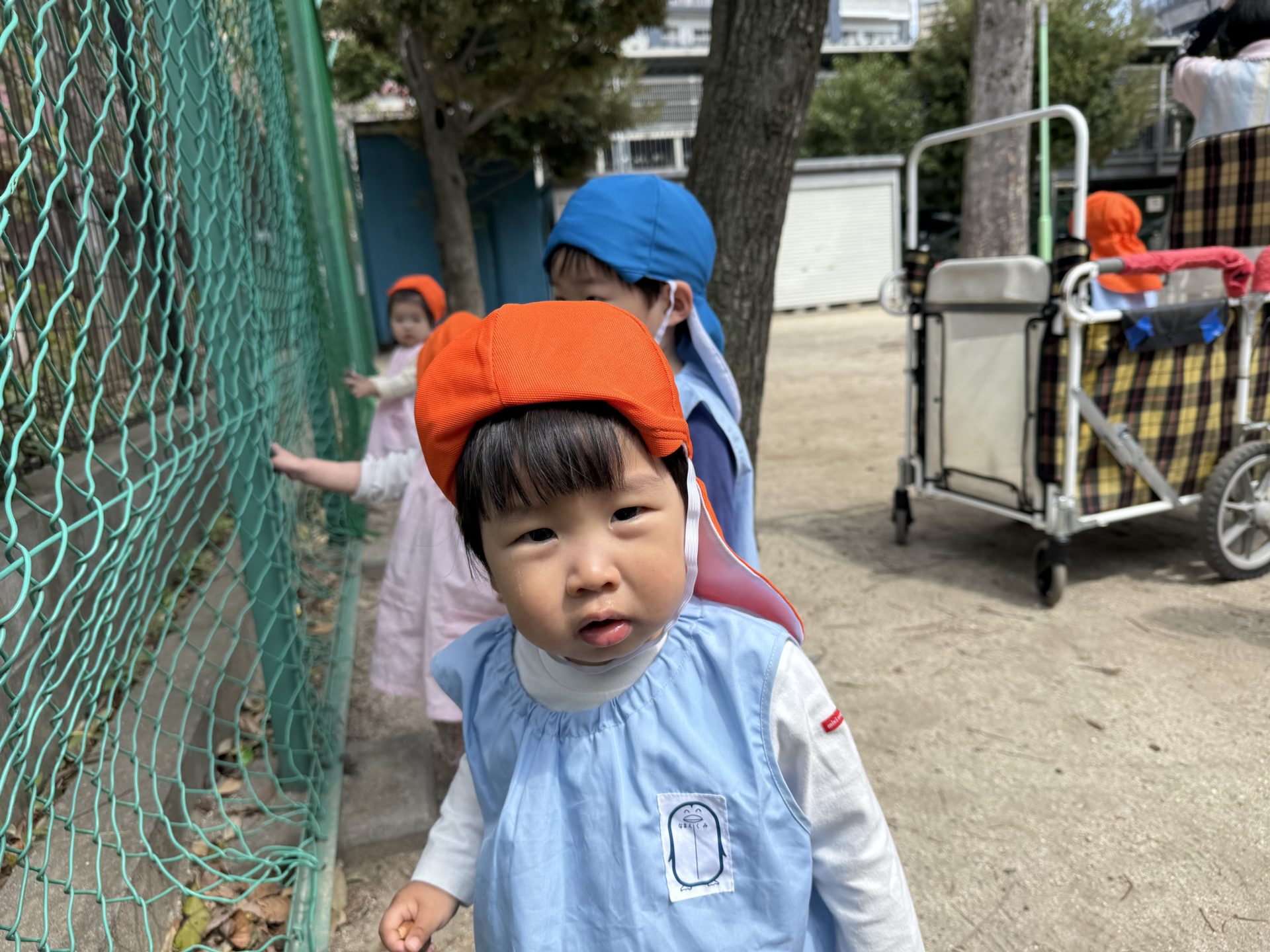 新しいお友達もお散歩でカートに乗ったり、先生と手を繋いでご機嫌です。先週までは寒かったりしましたが、暖かくなってお花が咲いていたり、アリさんがお散歩しているので、子ども達は虫さんの観察や花壇のお花を見ていました。