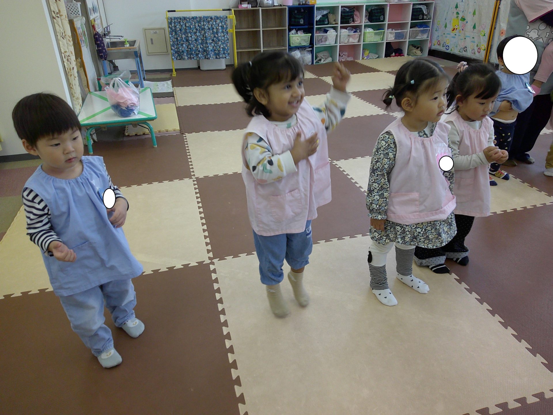 初めての英語のレッスンにこあら組のお友達はとても緊張している様子が見られ、少しすると楽しさが分かってきたようで、笑顔で参加していました。