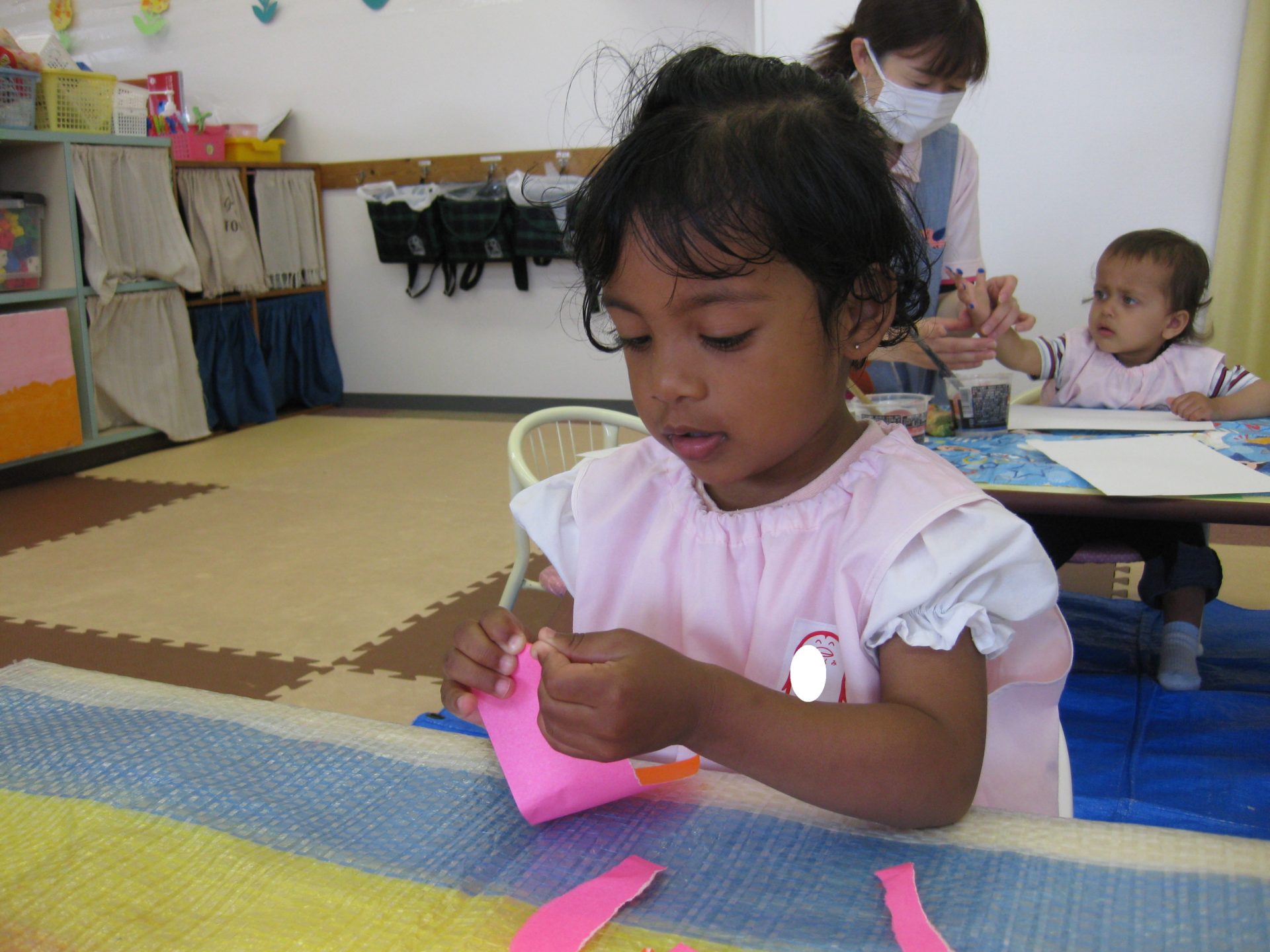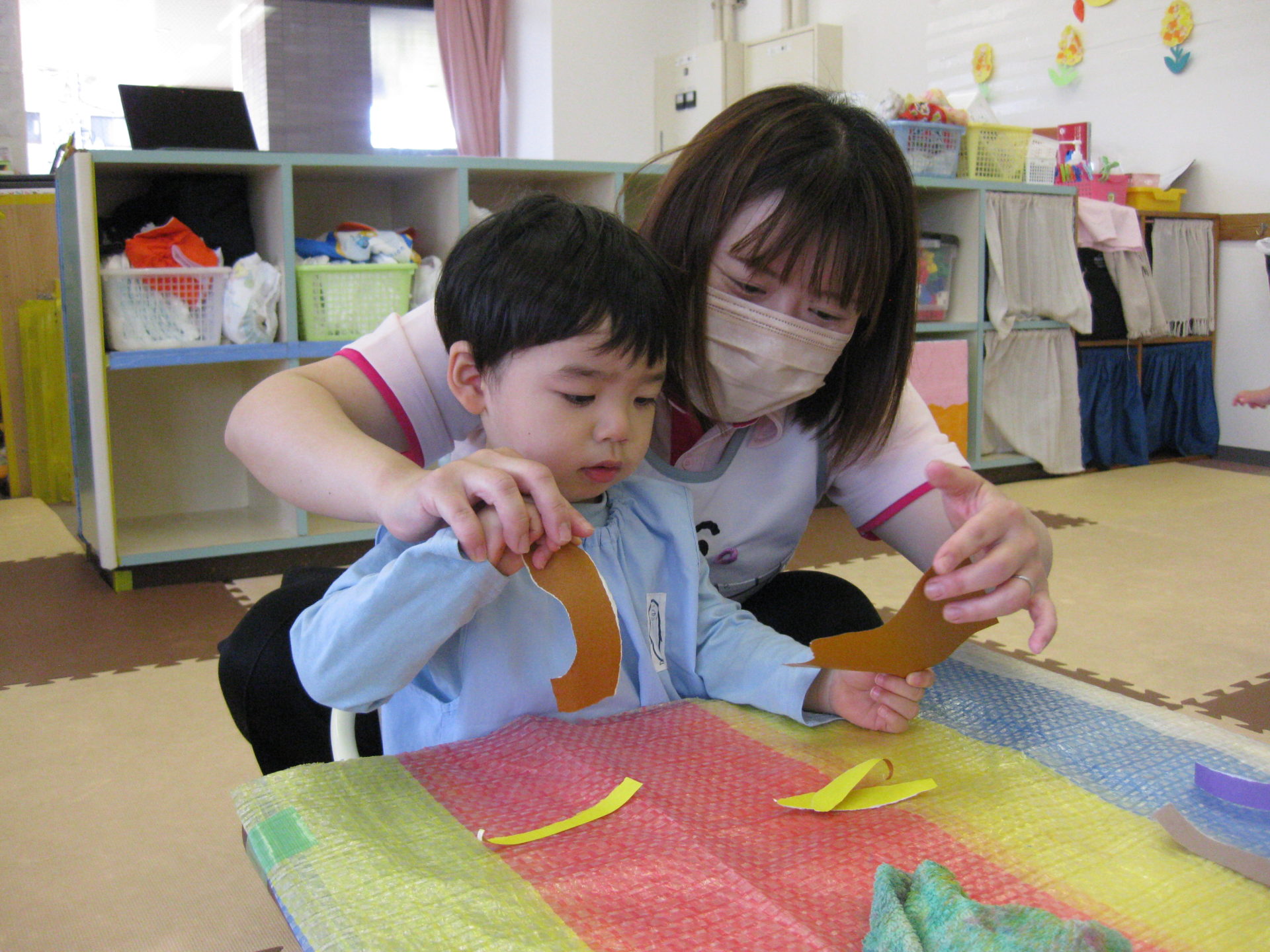 こあら組のお友達は、まずは飾り作りから。折り紙を縦長にちぎり、両面テープがついている台紙の上にちぎった折り紙を貼っていきました。